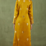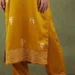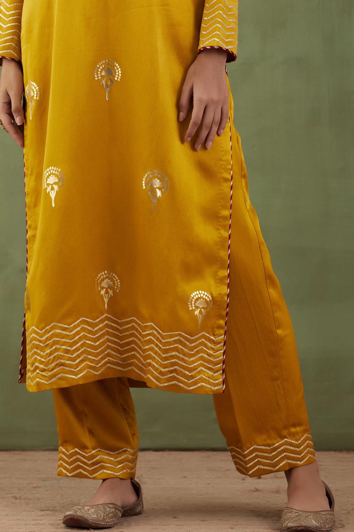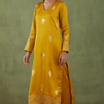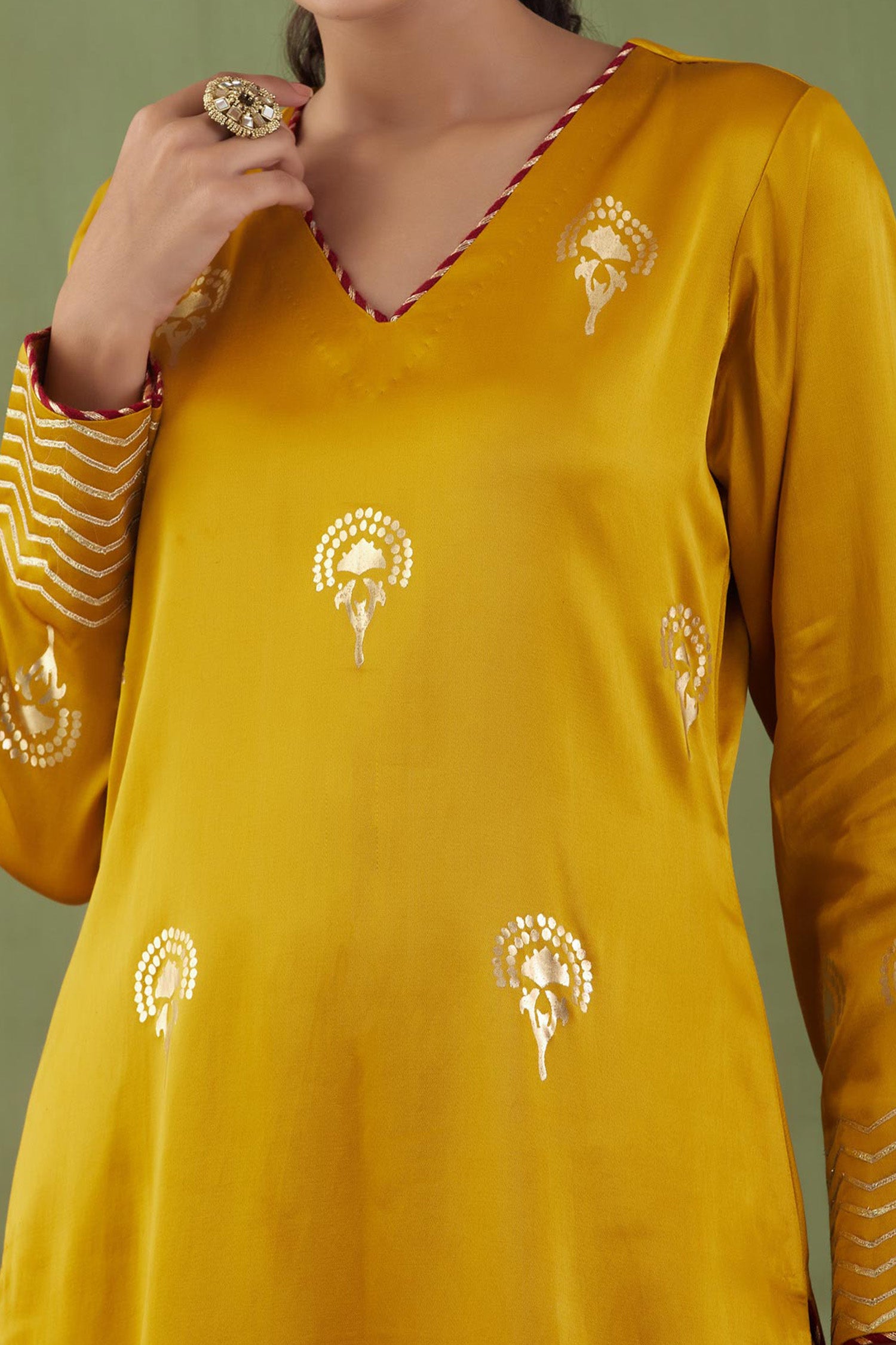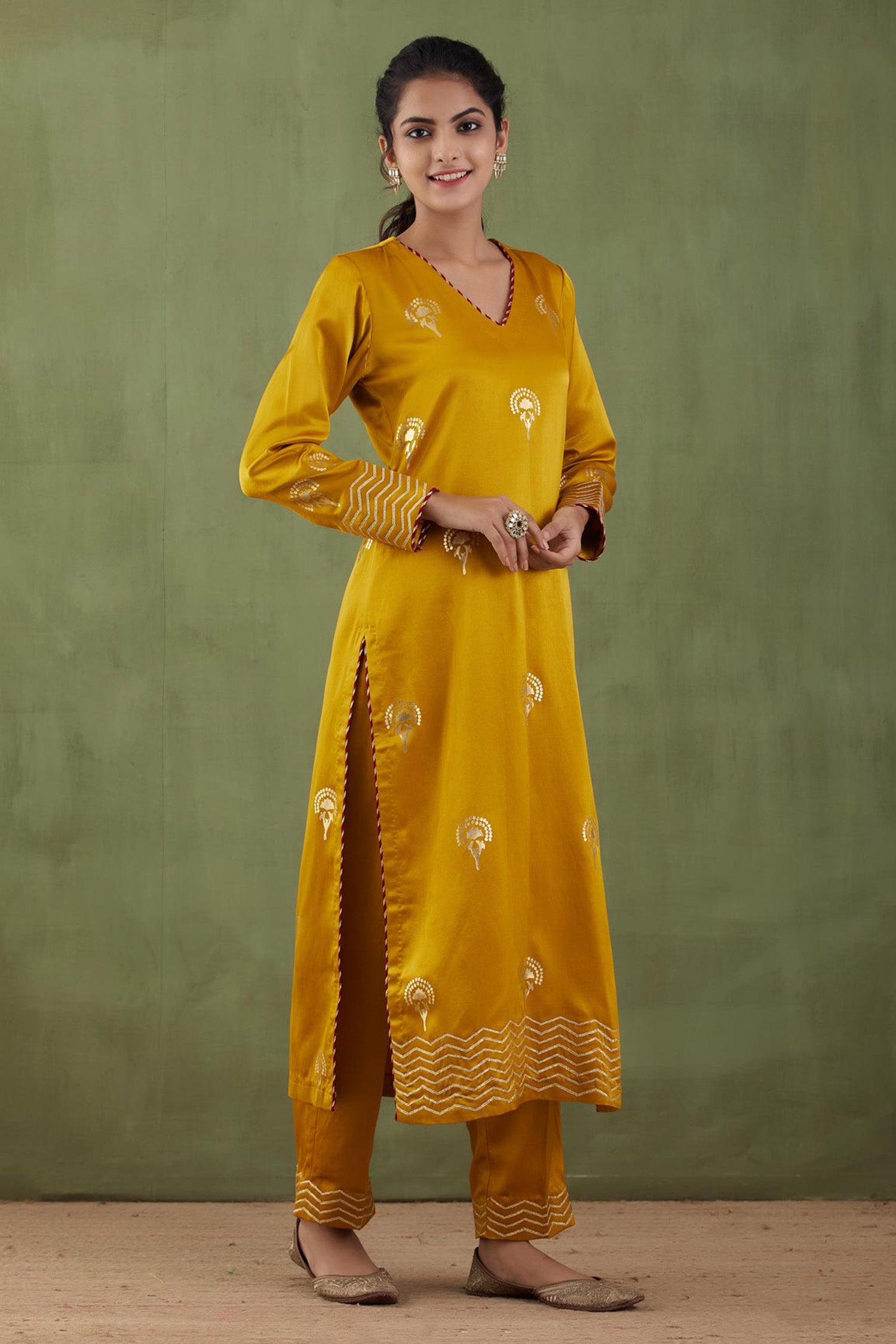 The elegant mustard mashru silk straight kurta set with the matching pants set along with the foil printed design for a rich look in casual and festive occasions with the desired comfort for the dignified touch.