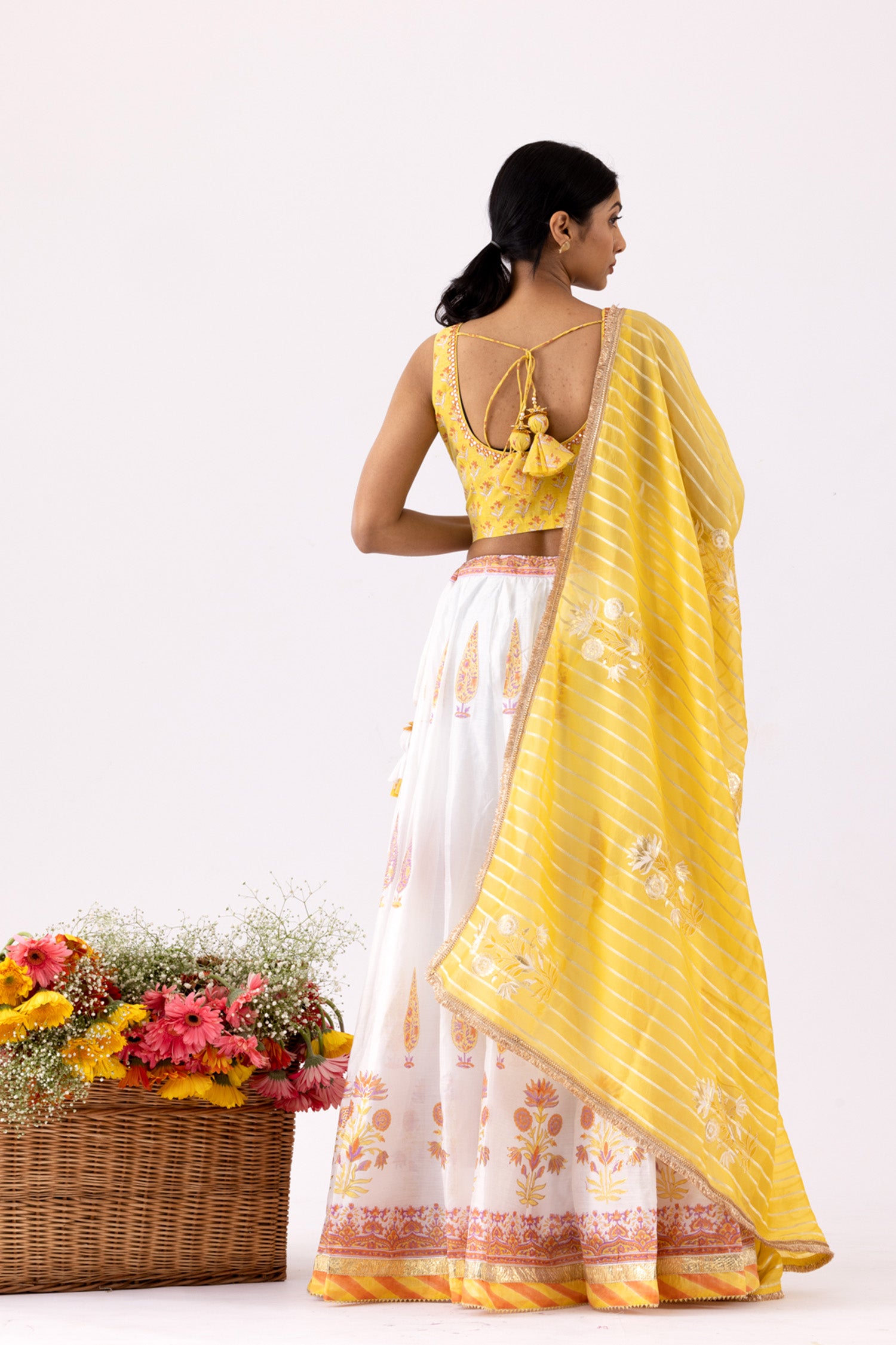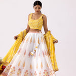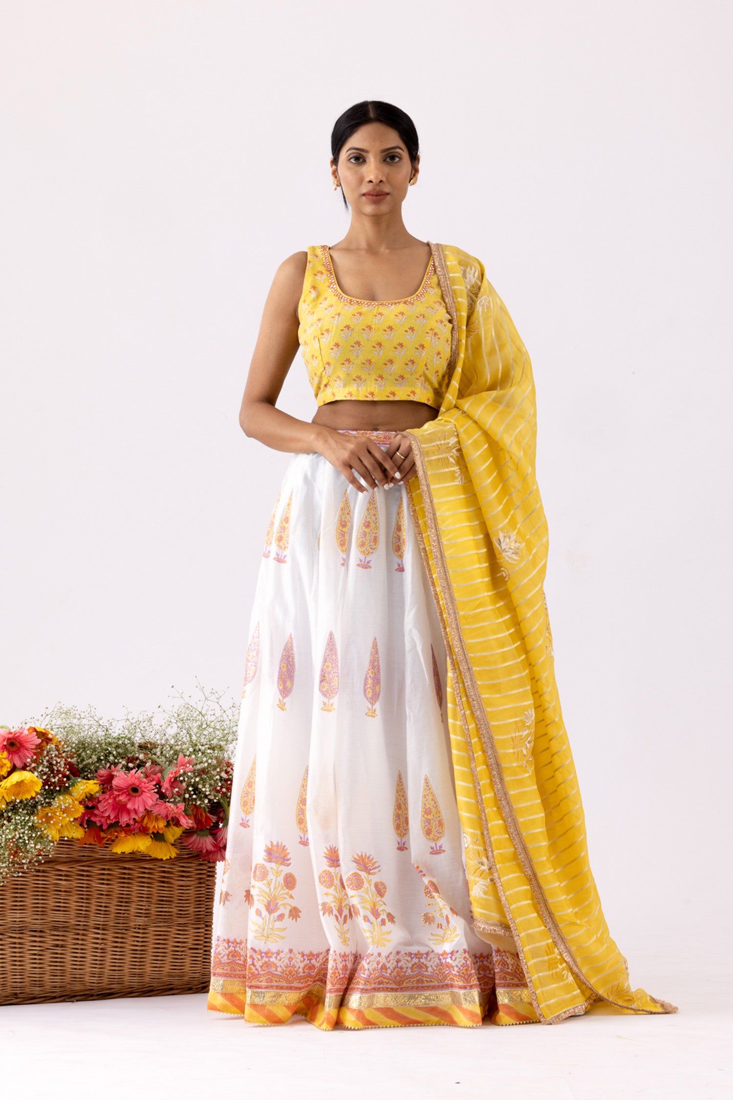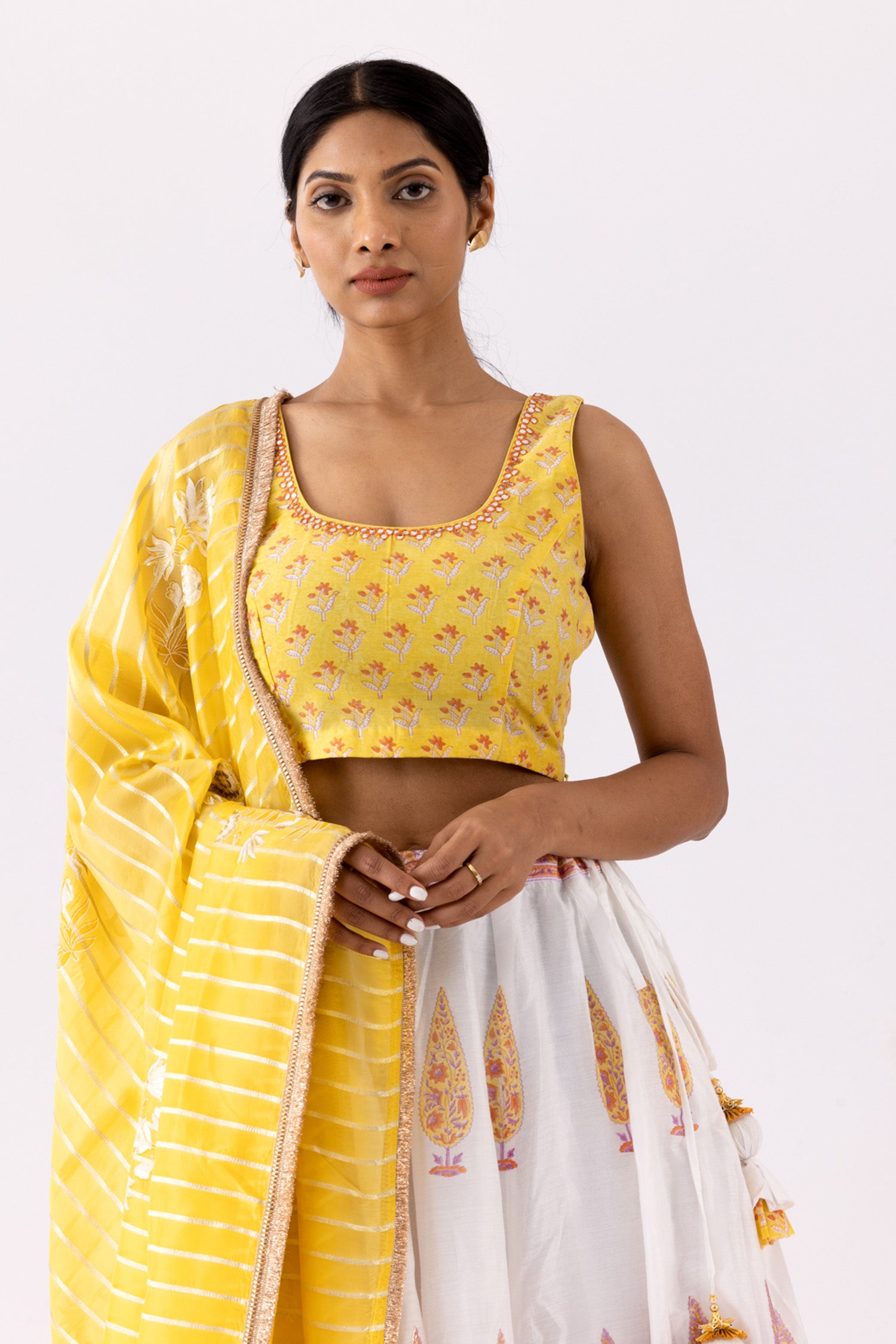 The Lehenga set with an foil print Lehenga and a Sleeveless Blouse with a mirror work Round Neck along with a striped Organza dupatta for a Classic and traditional look.