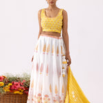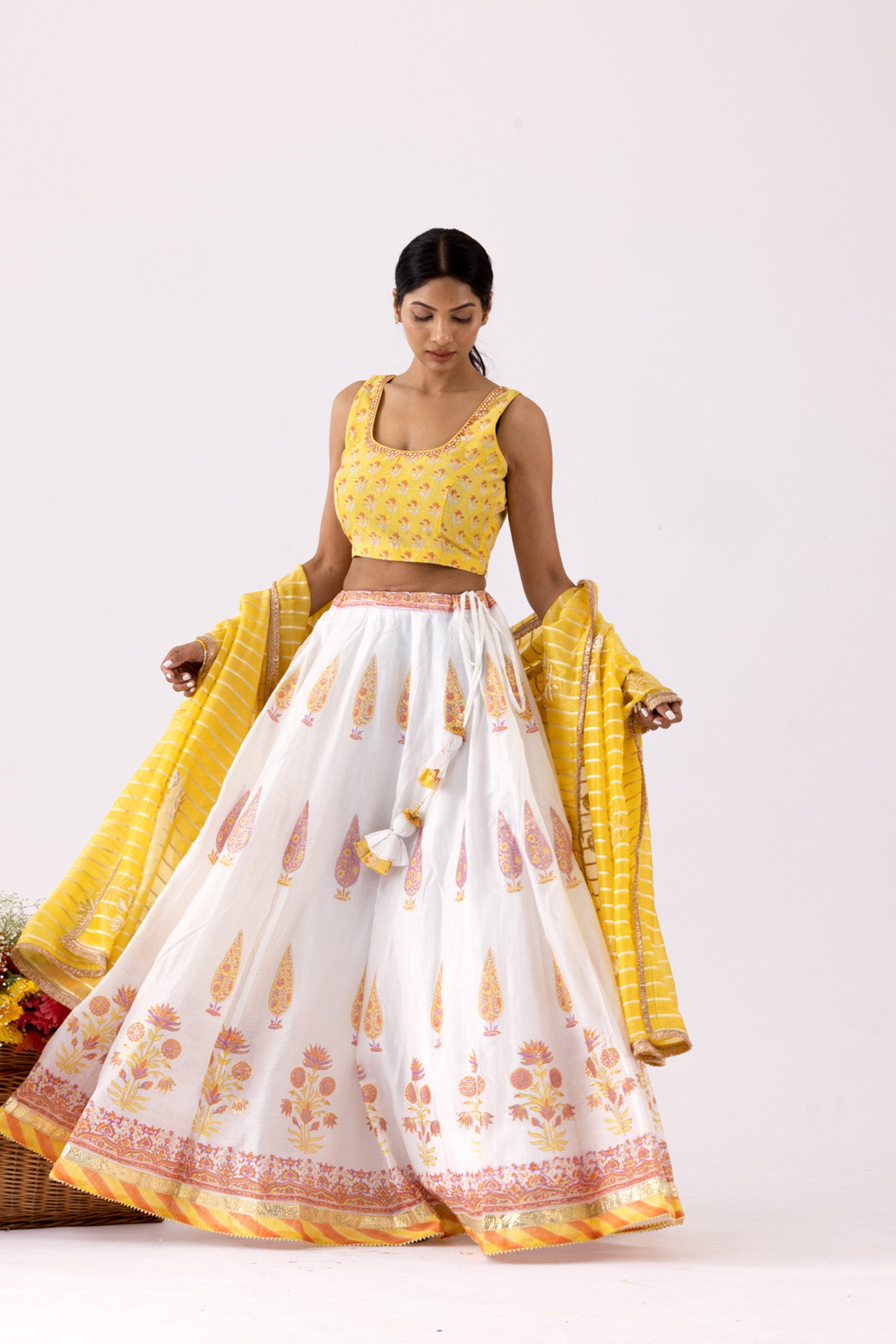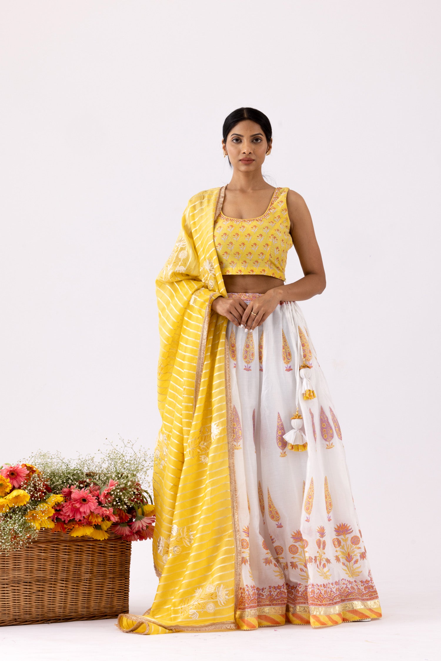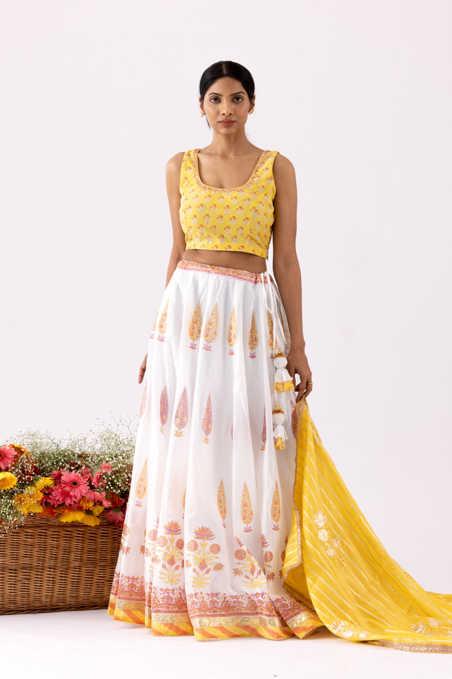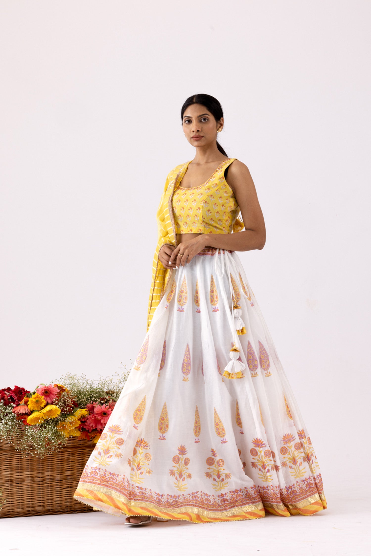 The Lehenga set with an foil print Lehenga and a Sleeveless Blouse with a mirror work Round Neck along with a striped Organza dupatta for a Classic and traditional look.