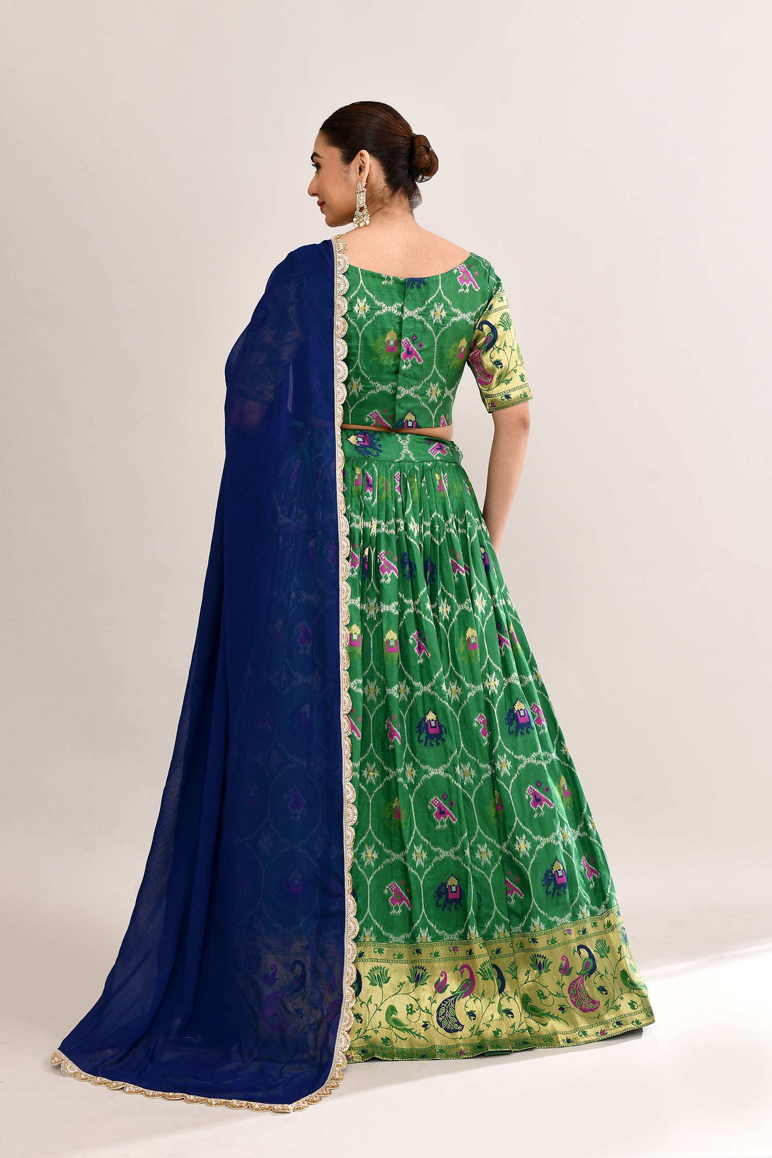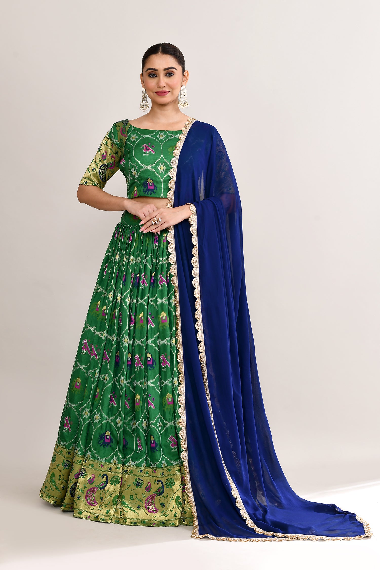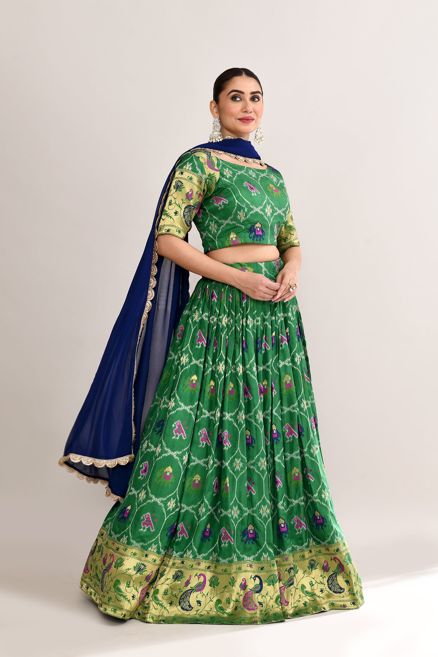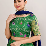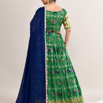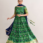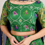 The forest green cotton silk ikat printed lehenga set with paithani border and a georgette dupatta for a beautiful and classy look.