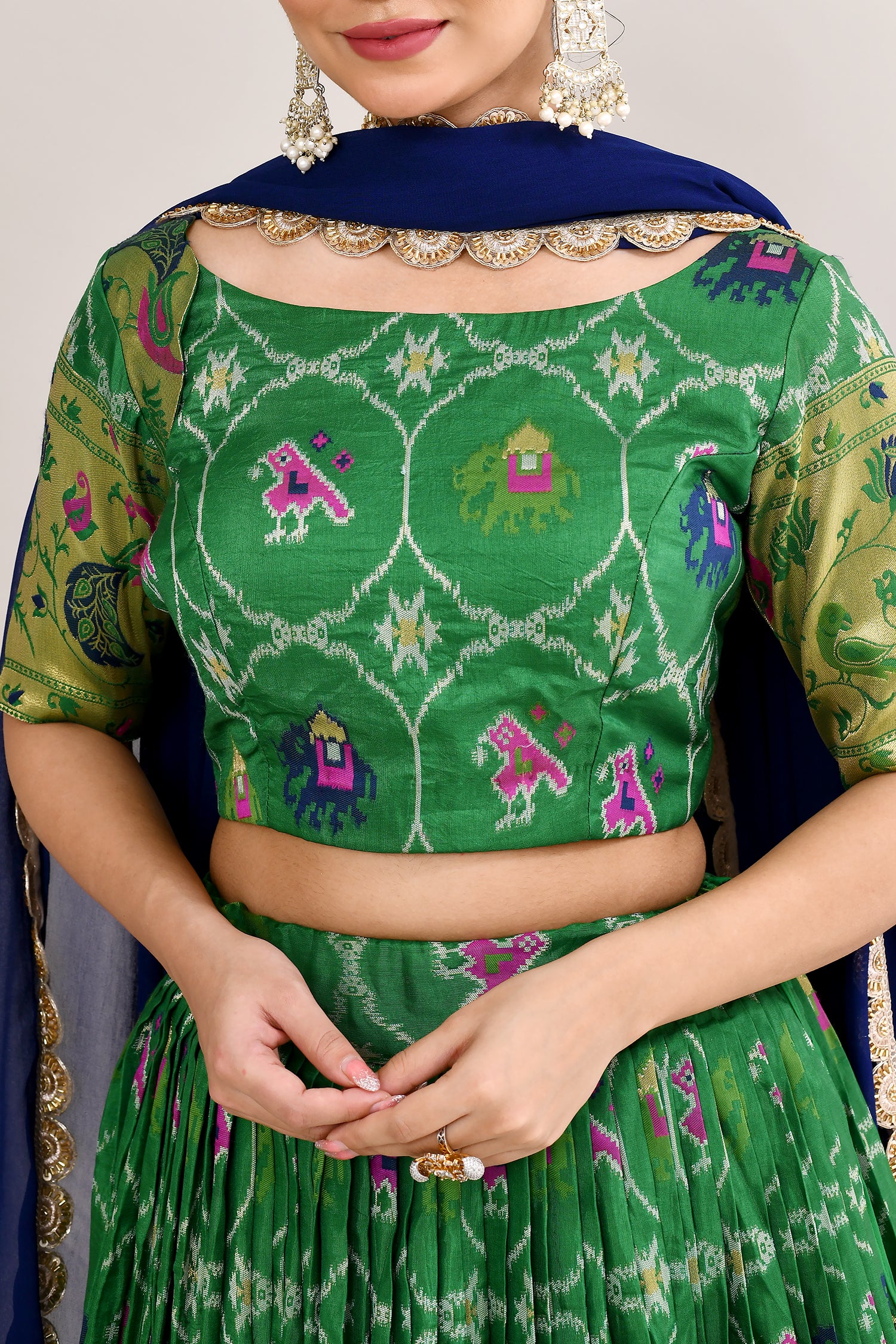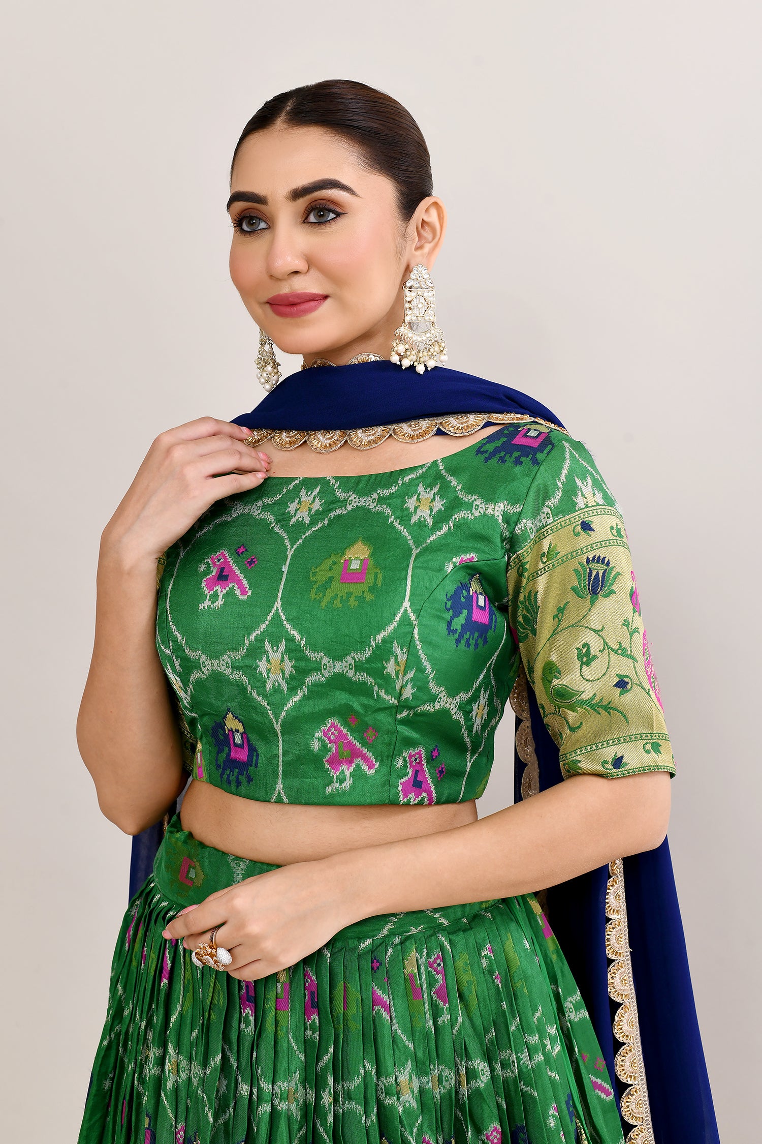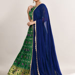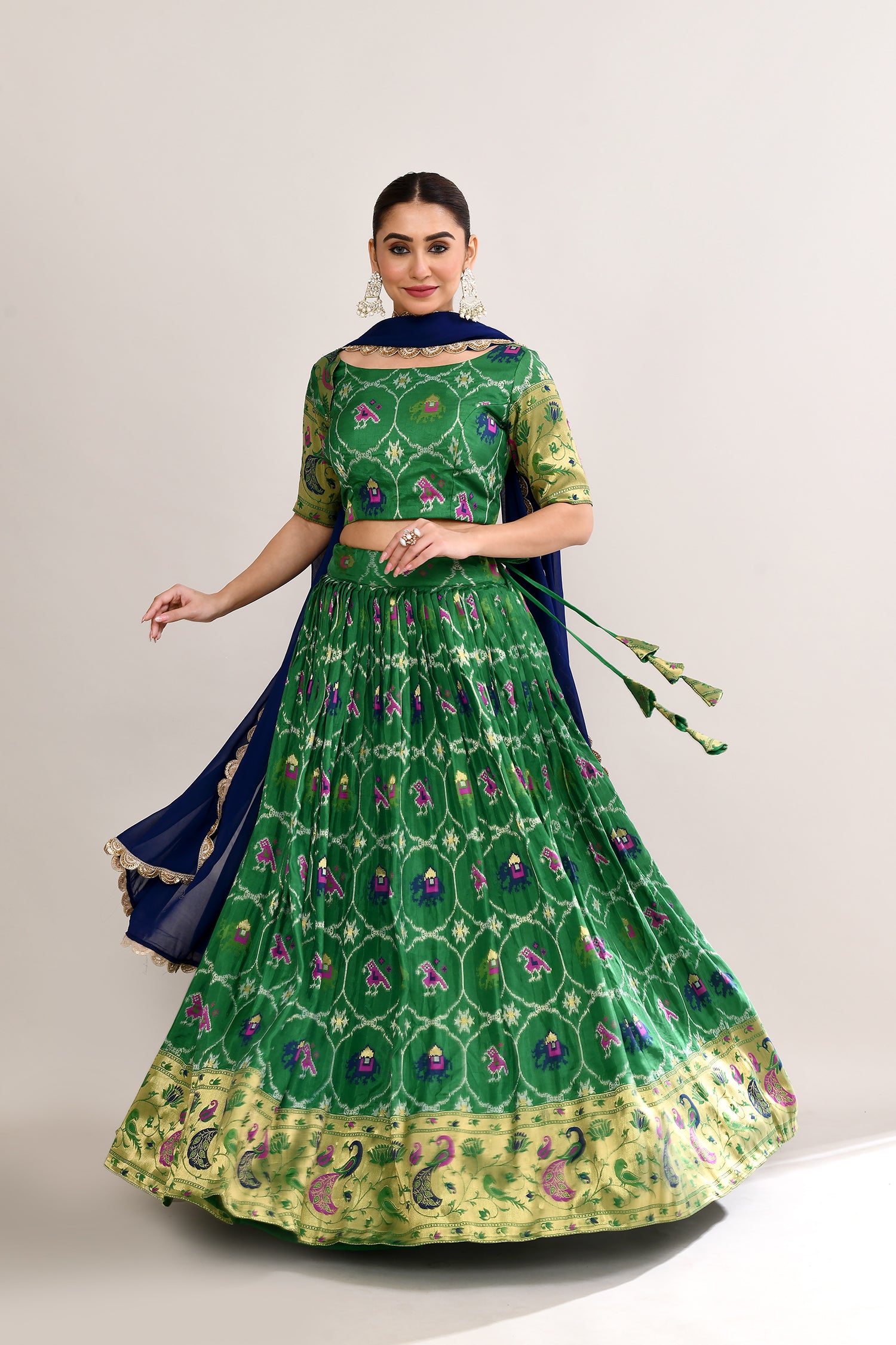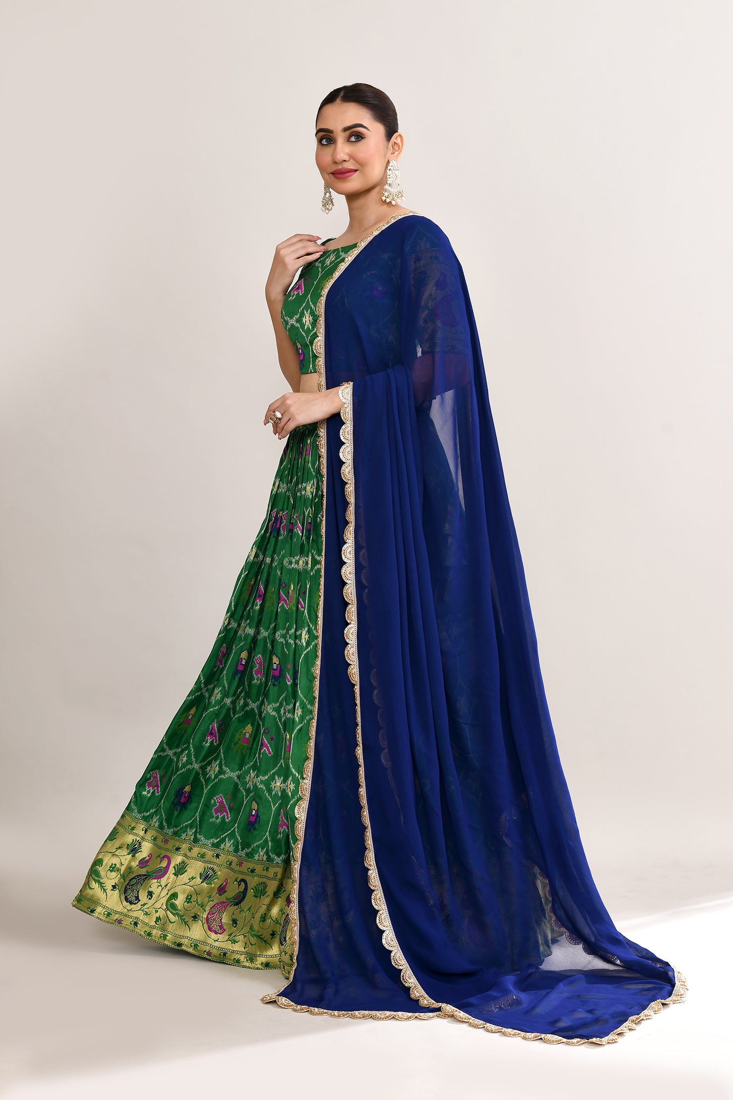 The forest green cotton silk ikat printed lehenga set with paithani border and a georgette dupatta for a beautiful and classy look.