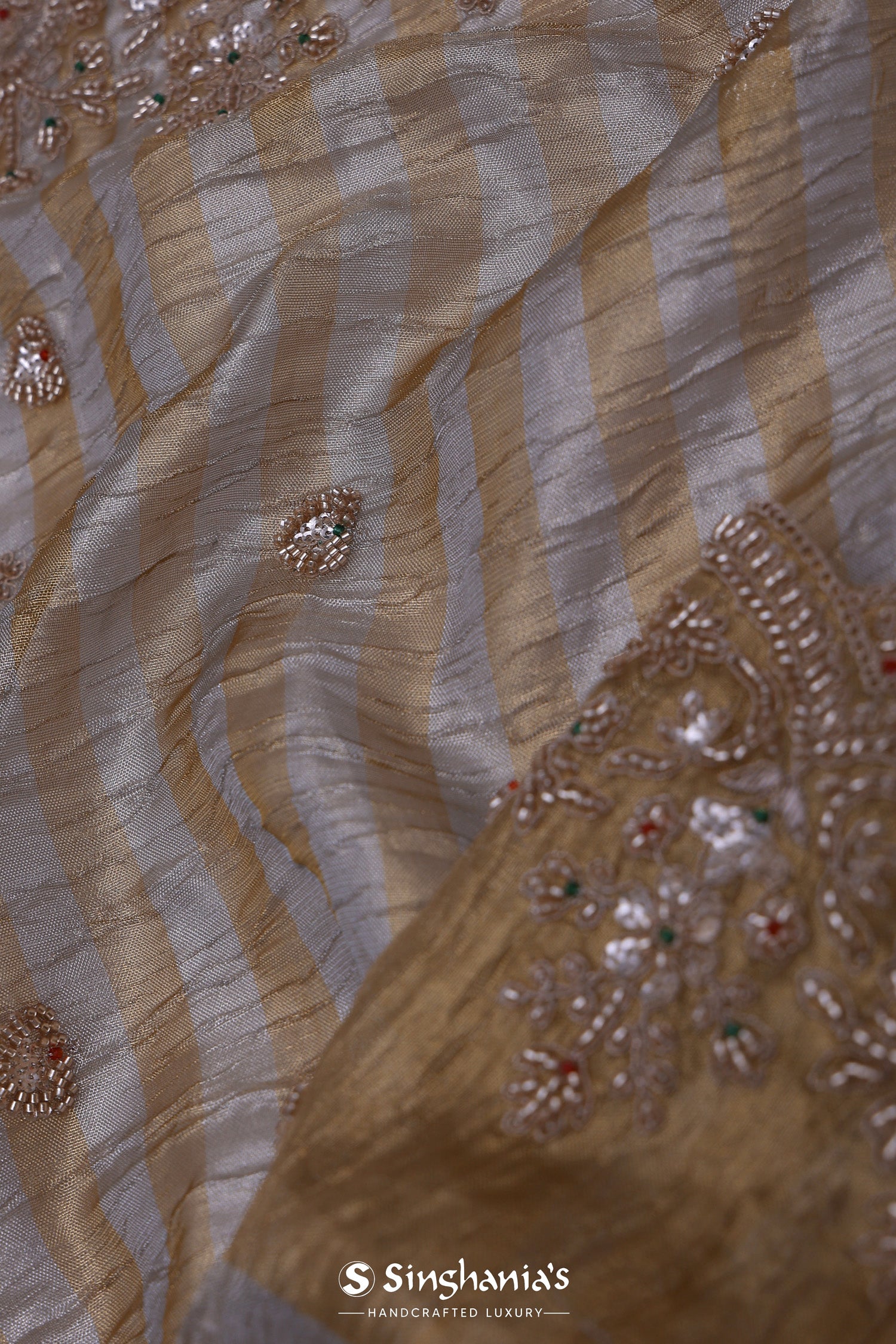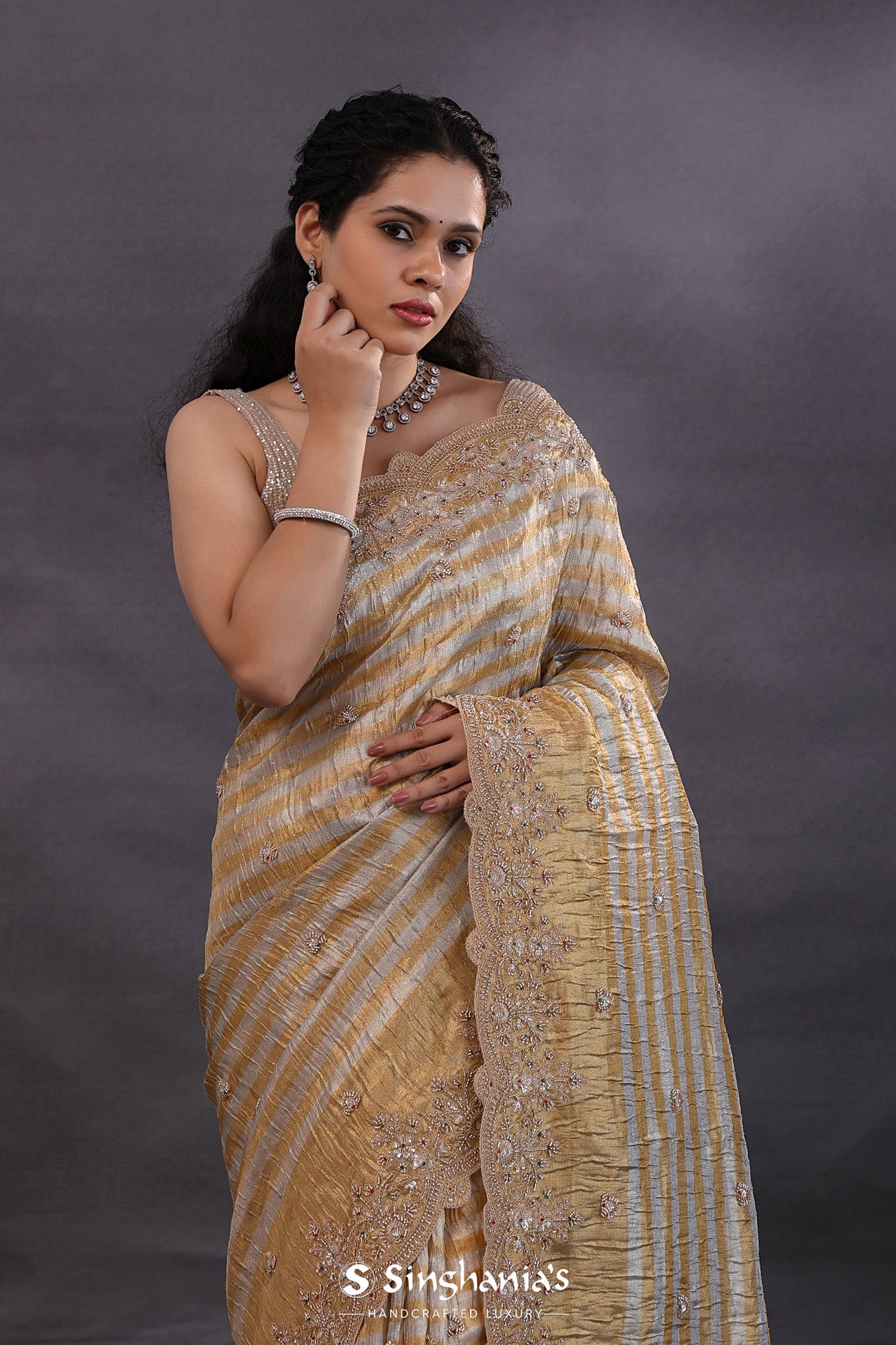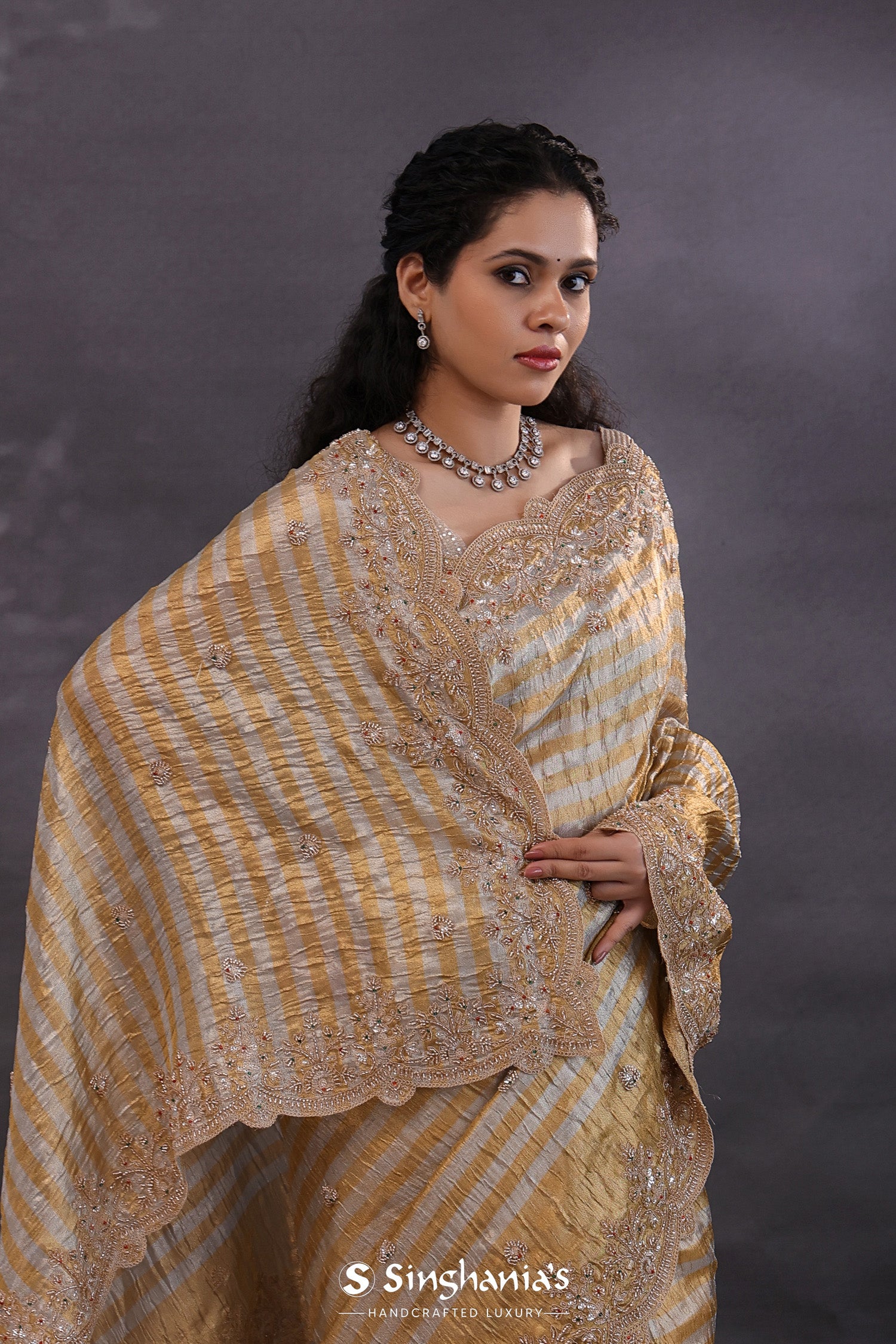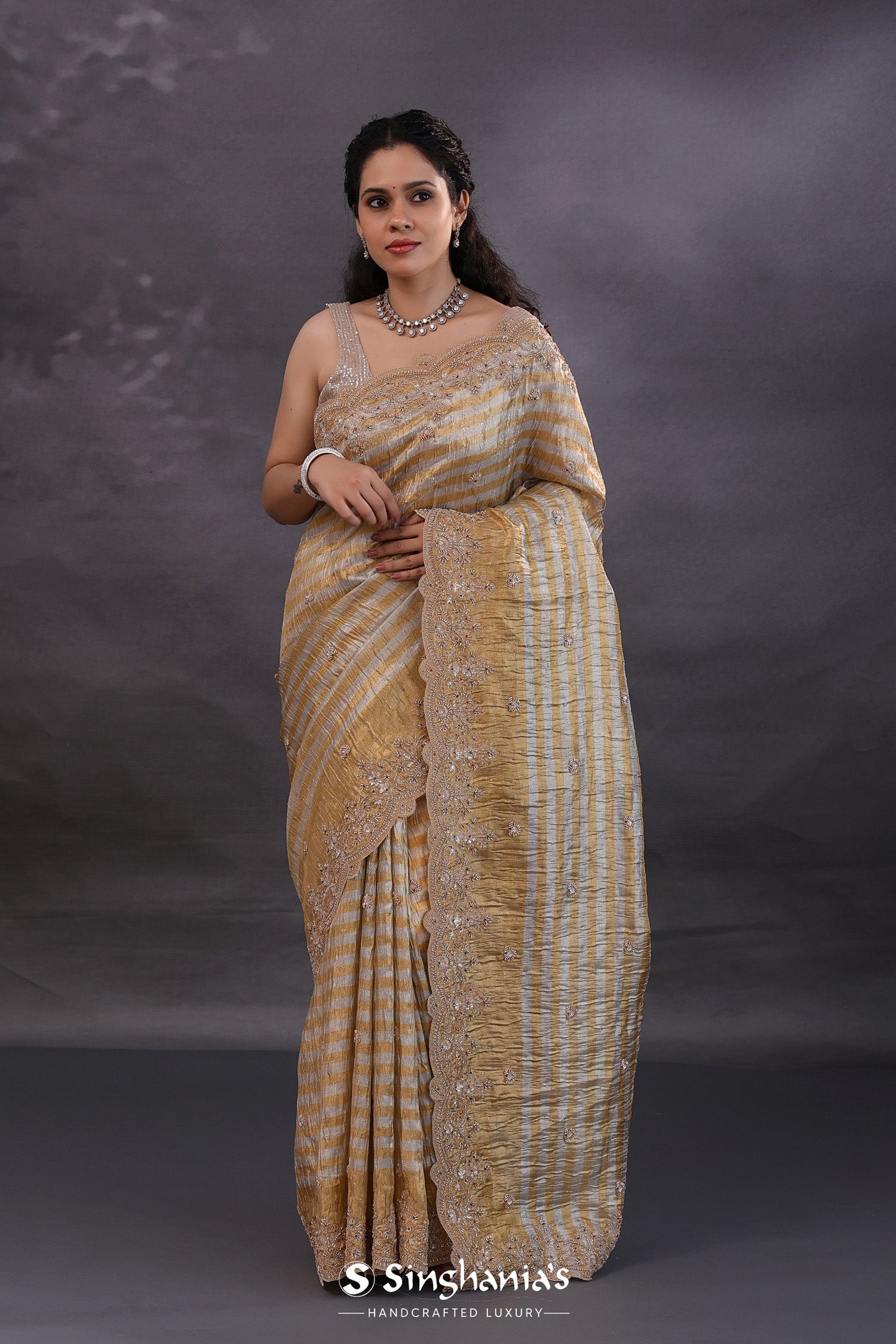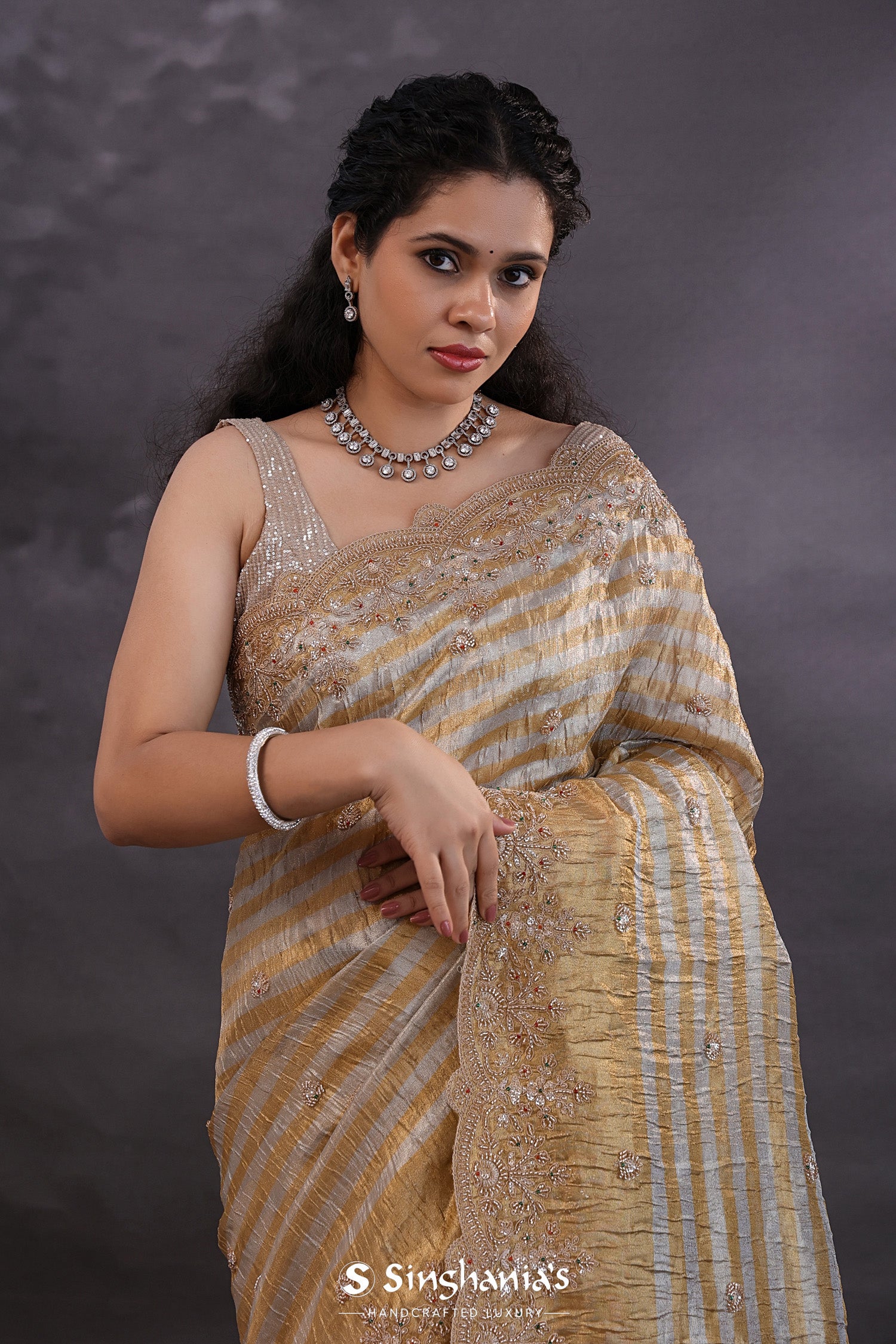 The golden and silver stripes fancy tissue saree with scallop border and floral embroidery for a classy look.