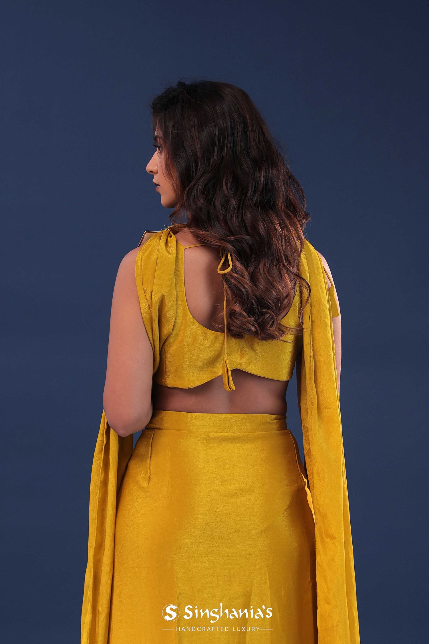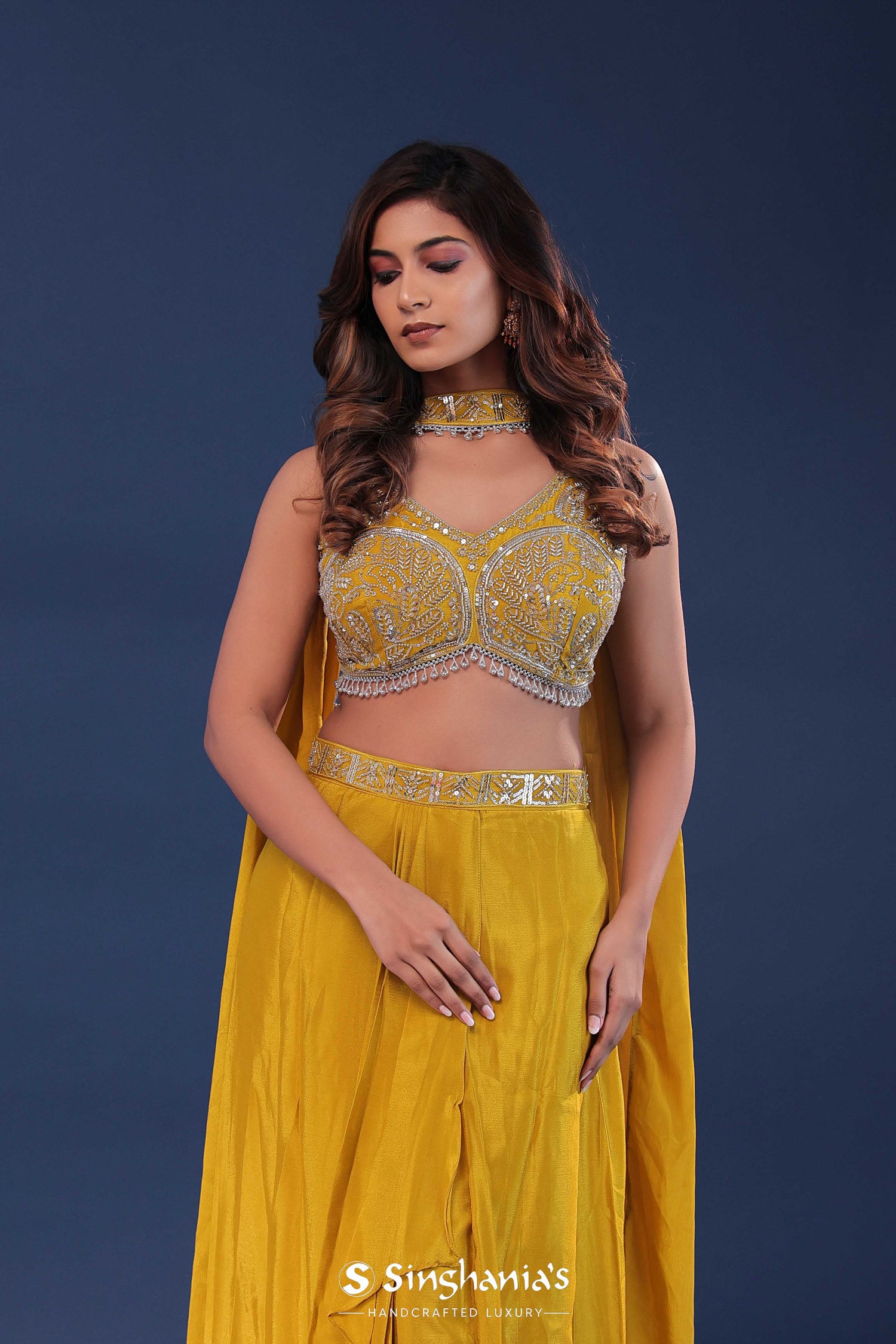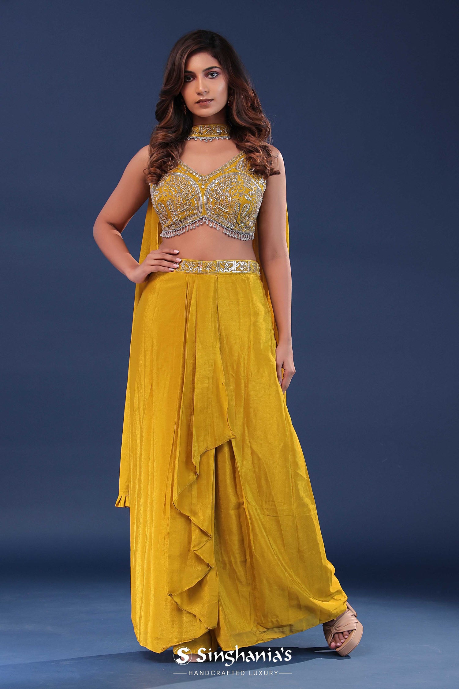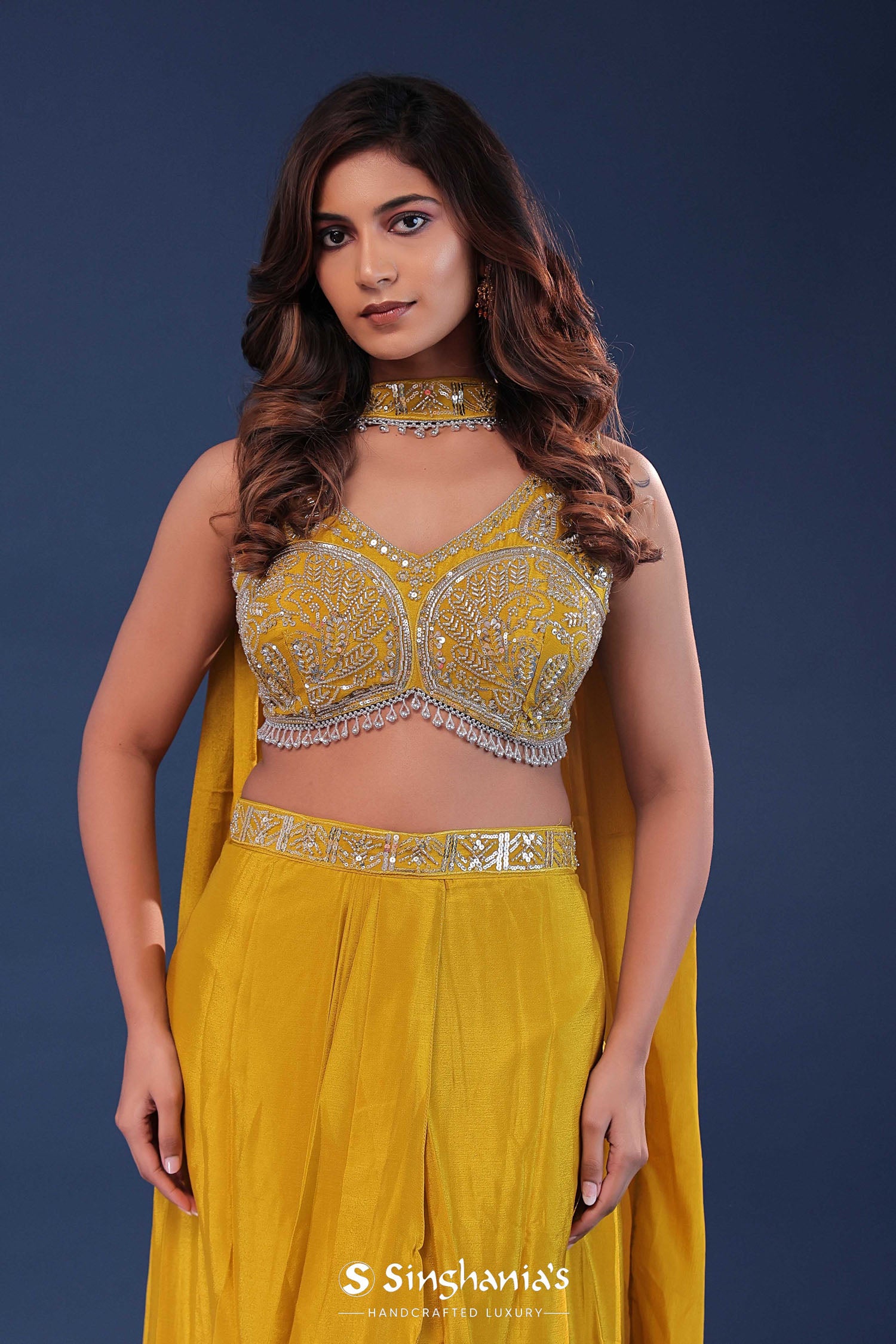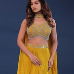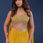 Golden poppy yellow chinon crepe indo-western set features V neck blouse adorned with beads, kardana and sequins along with plain cowl skirt . The choker dupatta adds the extra charm to the entire fit