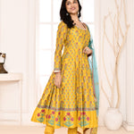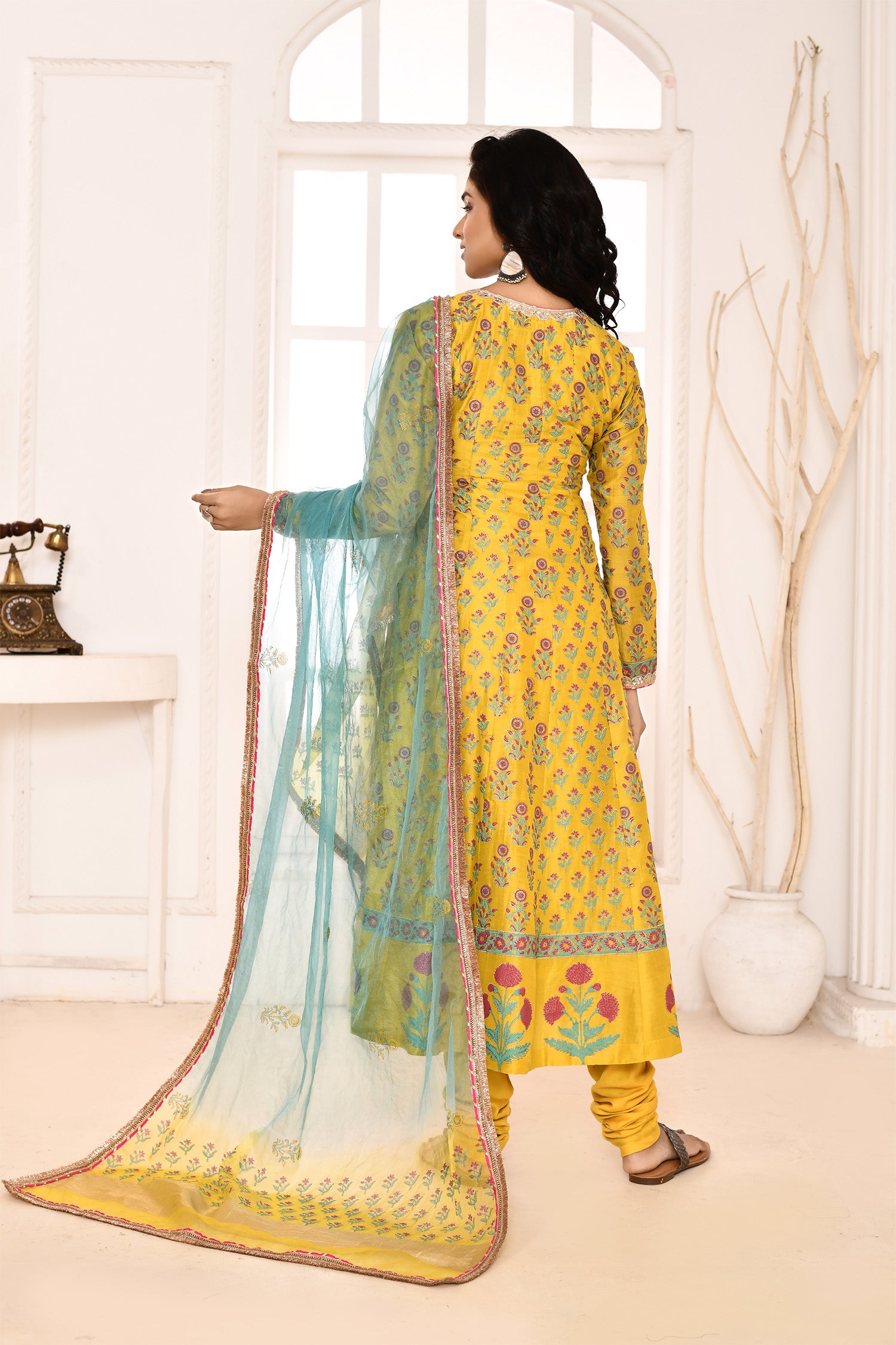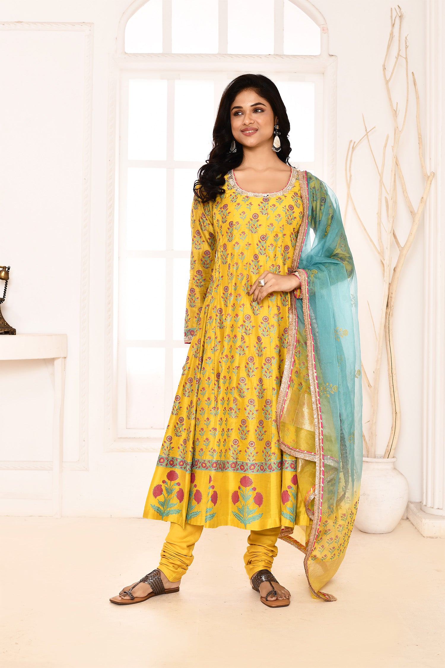 Golden Yellow Block Printed Anarkali And Churidar With Aqua Lace Finish Dupatta