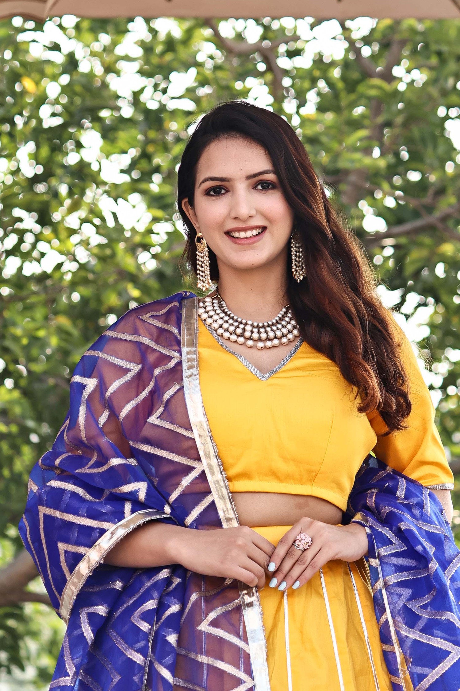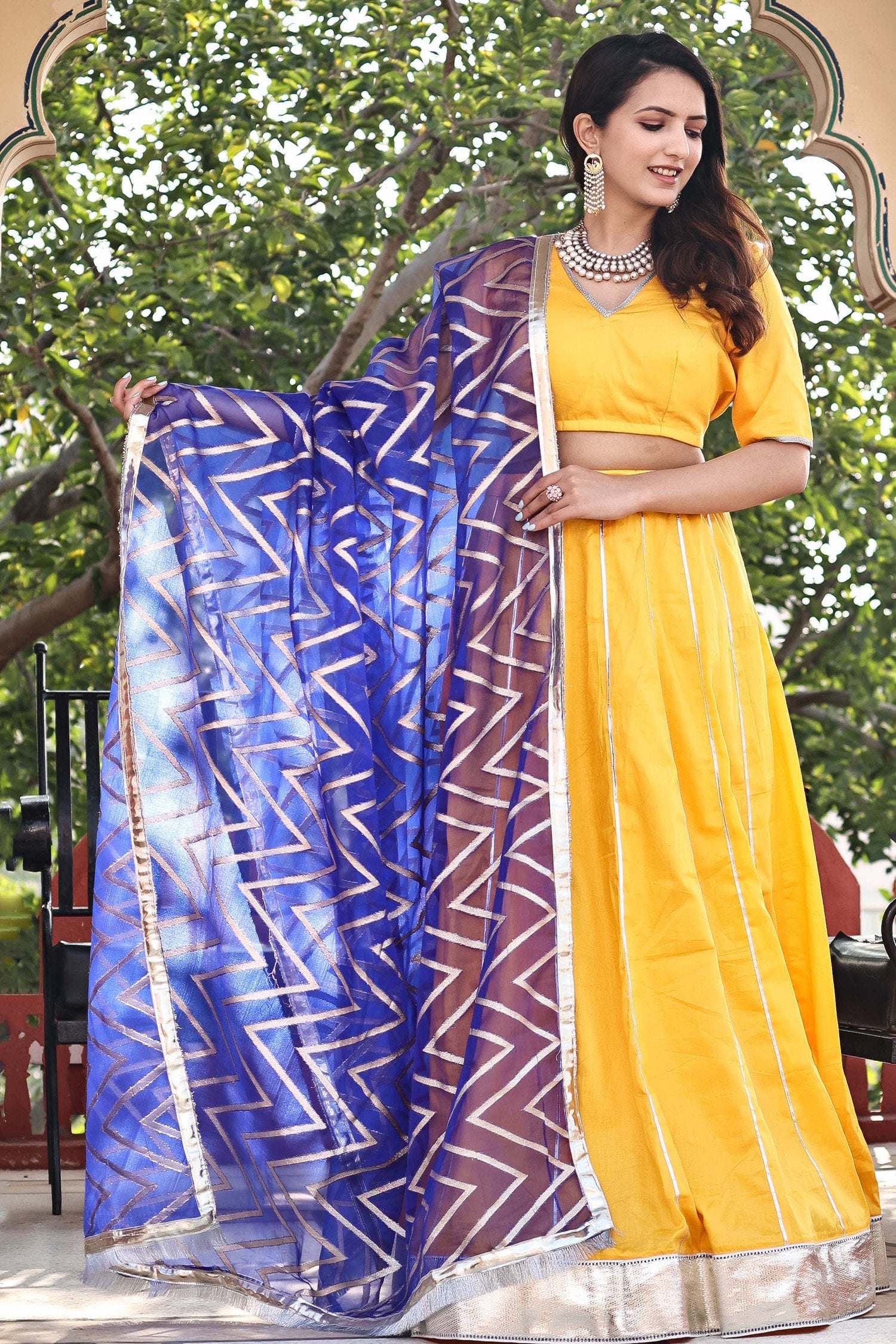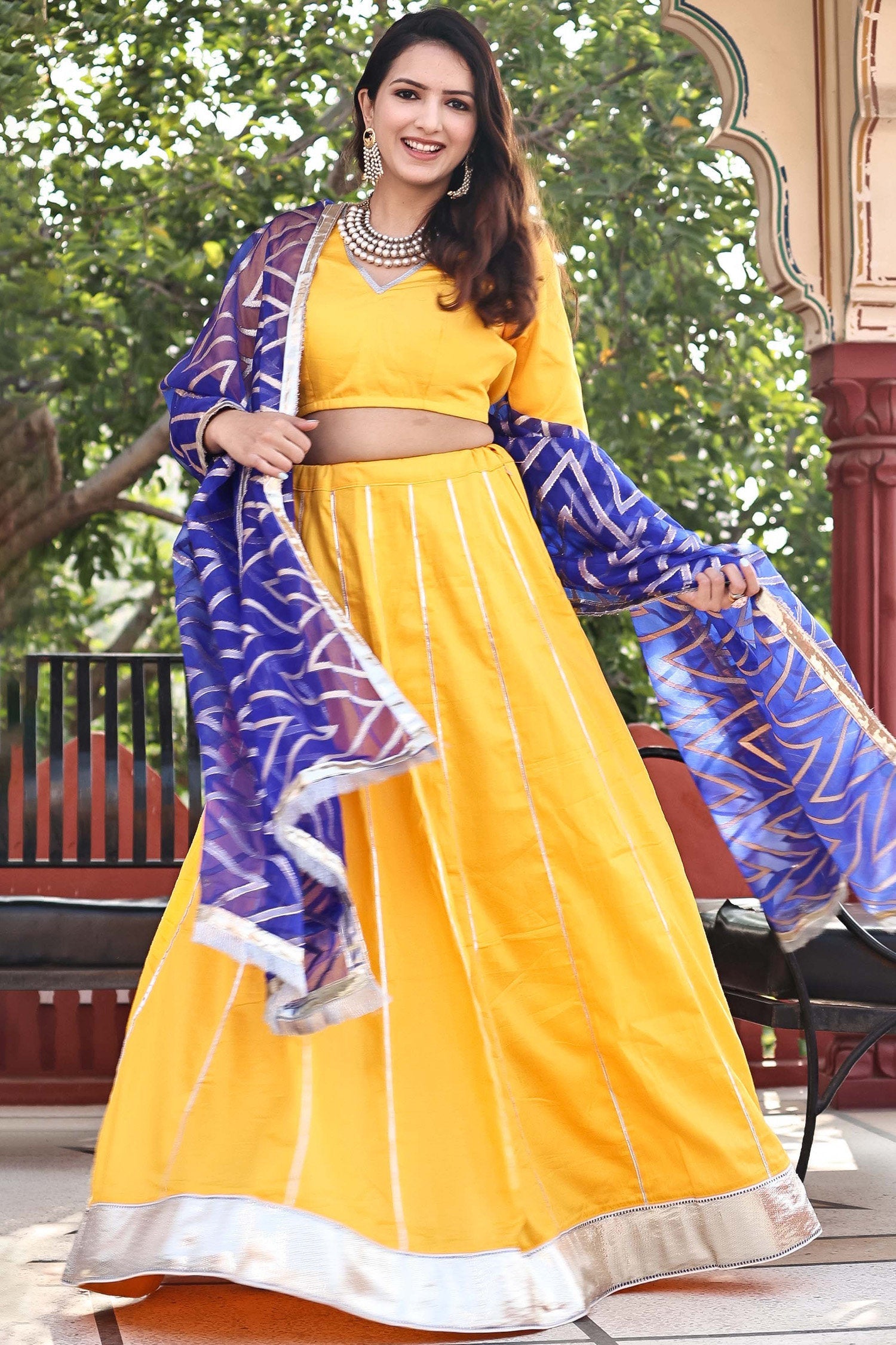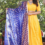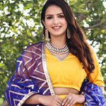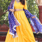 The authentic silk base of the Golden yellow cotton lehenga set featuring V neck blouse with full sleeves blouse adorned with lace design complemented with contrast blue organza dupatta making it every moment festive.