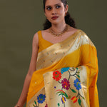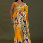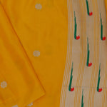 The Golden yellow paithani saree features butti's woven with gold zari complemented with paithani border and unstitched blouse