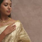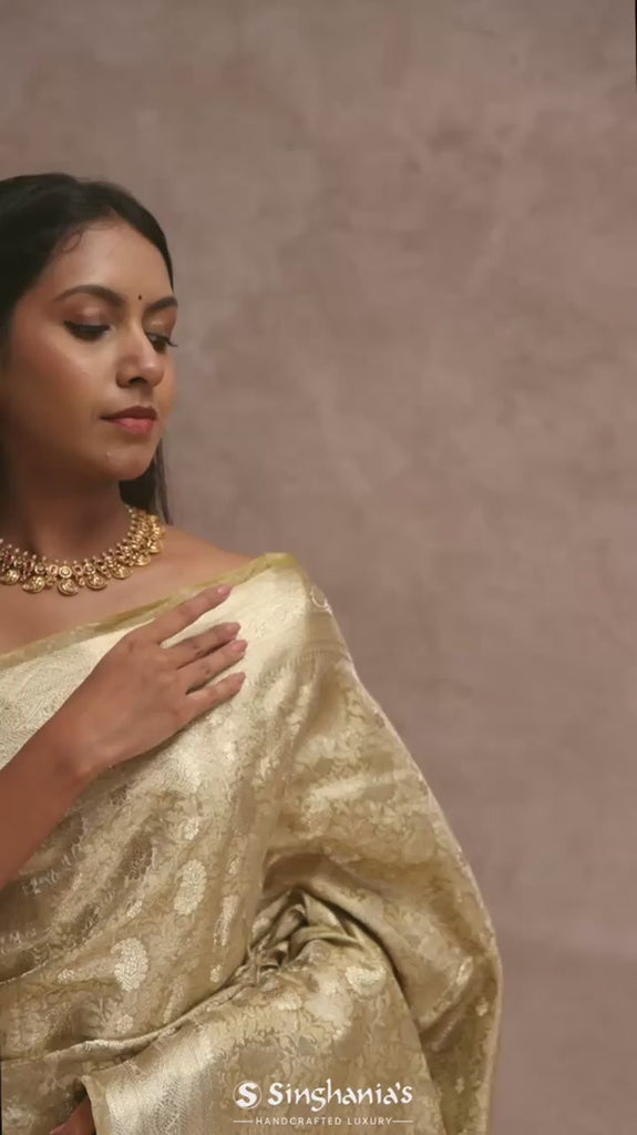 This Granola Yellow Tissue Organza Banarasi Saree presents a delicate gold zari border and floral design. The soft, lightweight fabric makes it perfect for weddings and festive occasions.