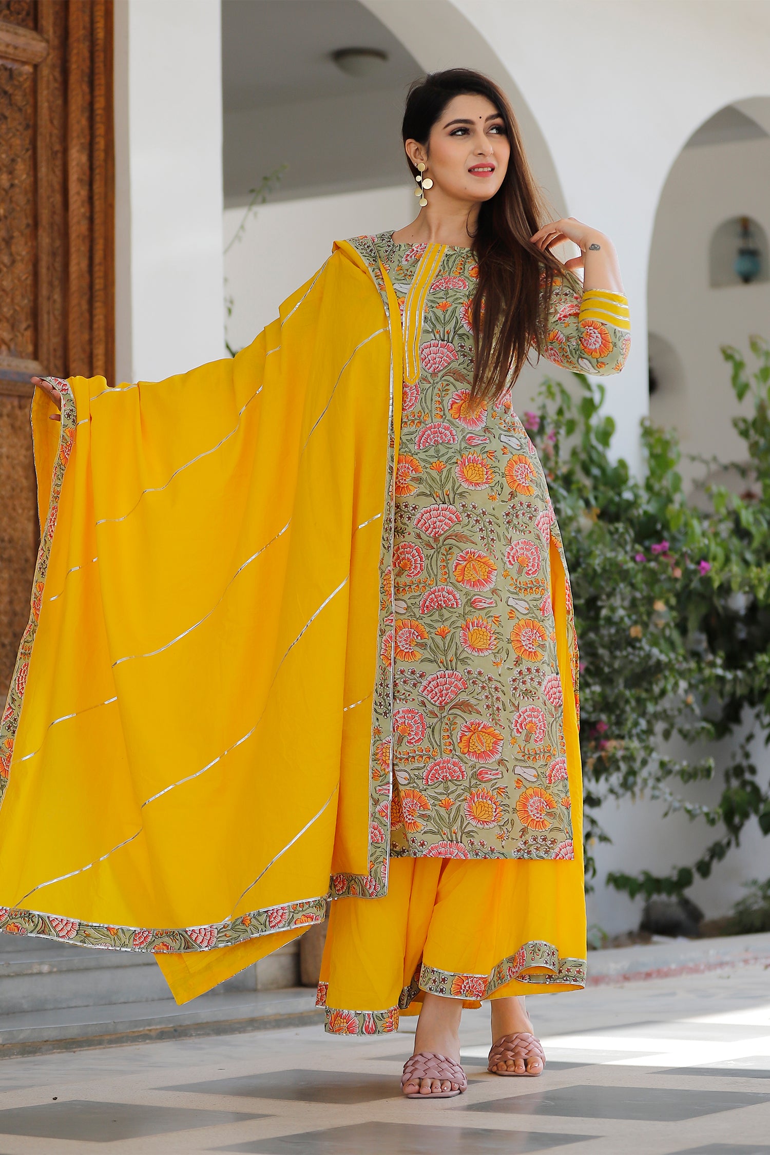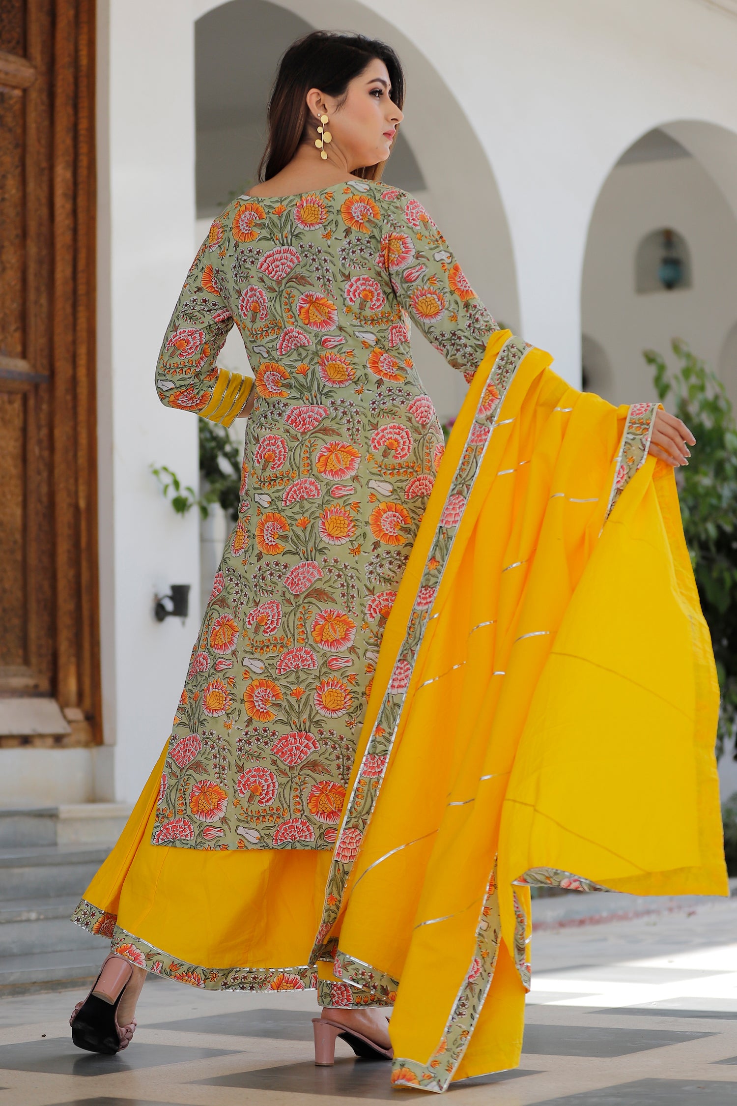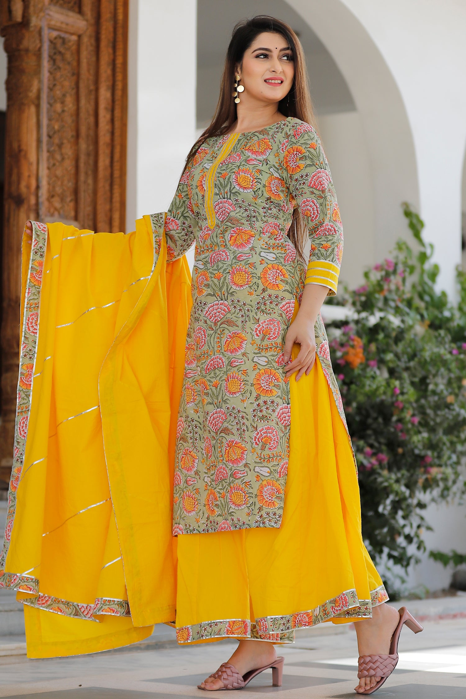The green cotton hand block floral printed kurta set with yellow palazzo and dupatta for a traditional and elegant look with comfortable feel of the cotton fabric.