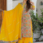 Green Cotton Floral Printed Kurta Set With Yellow Palazzo And Dupatta