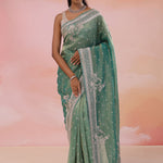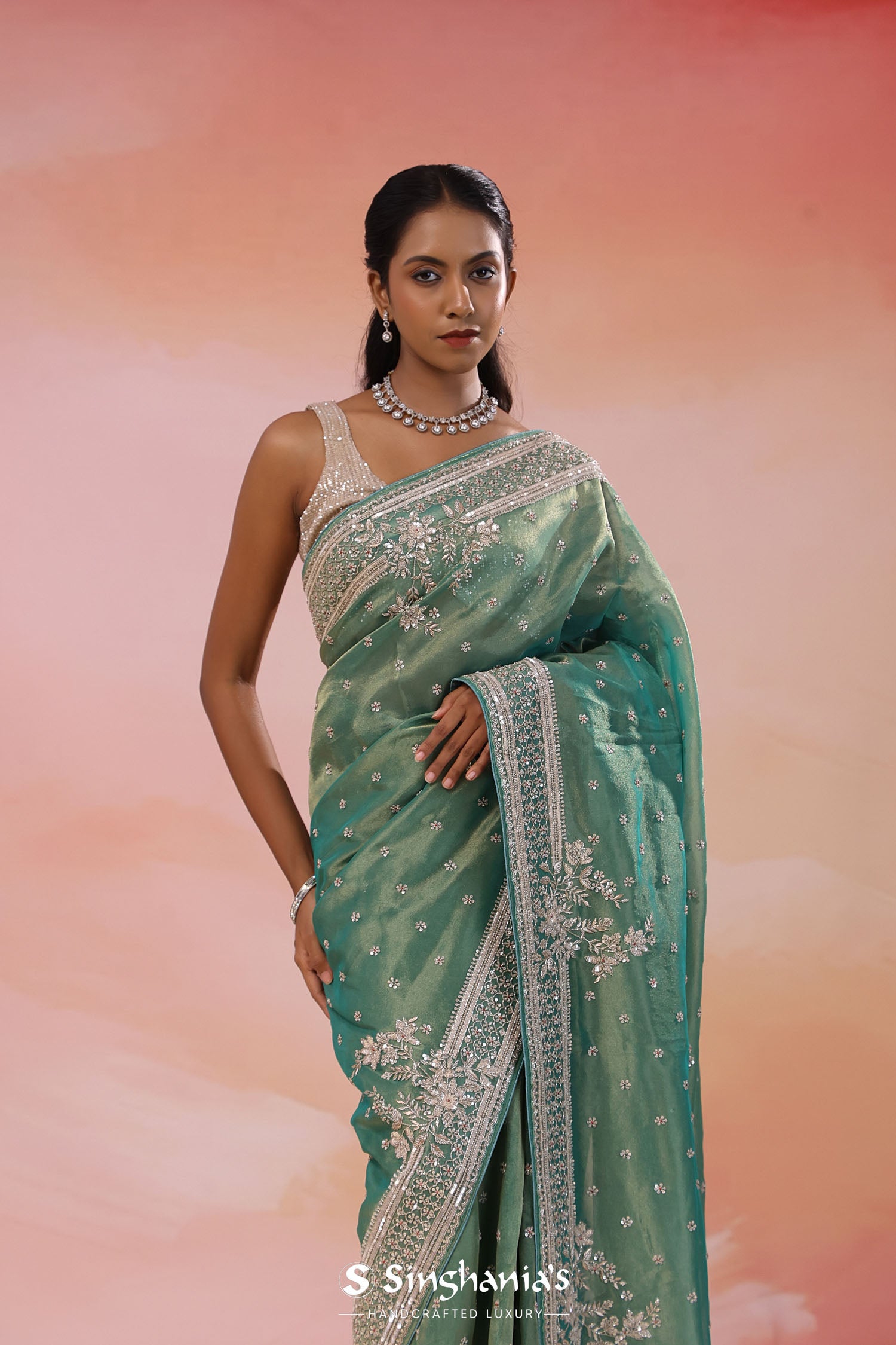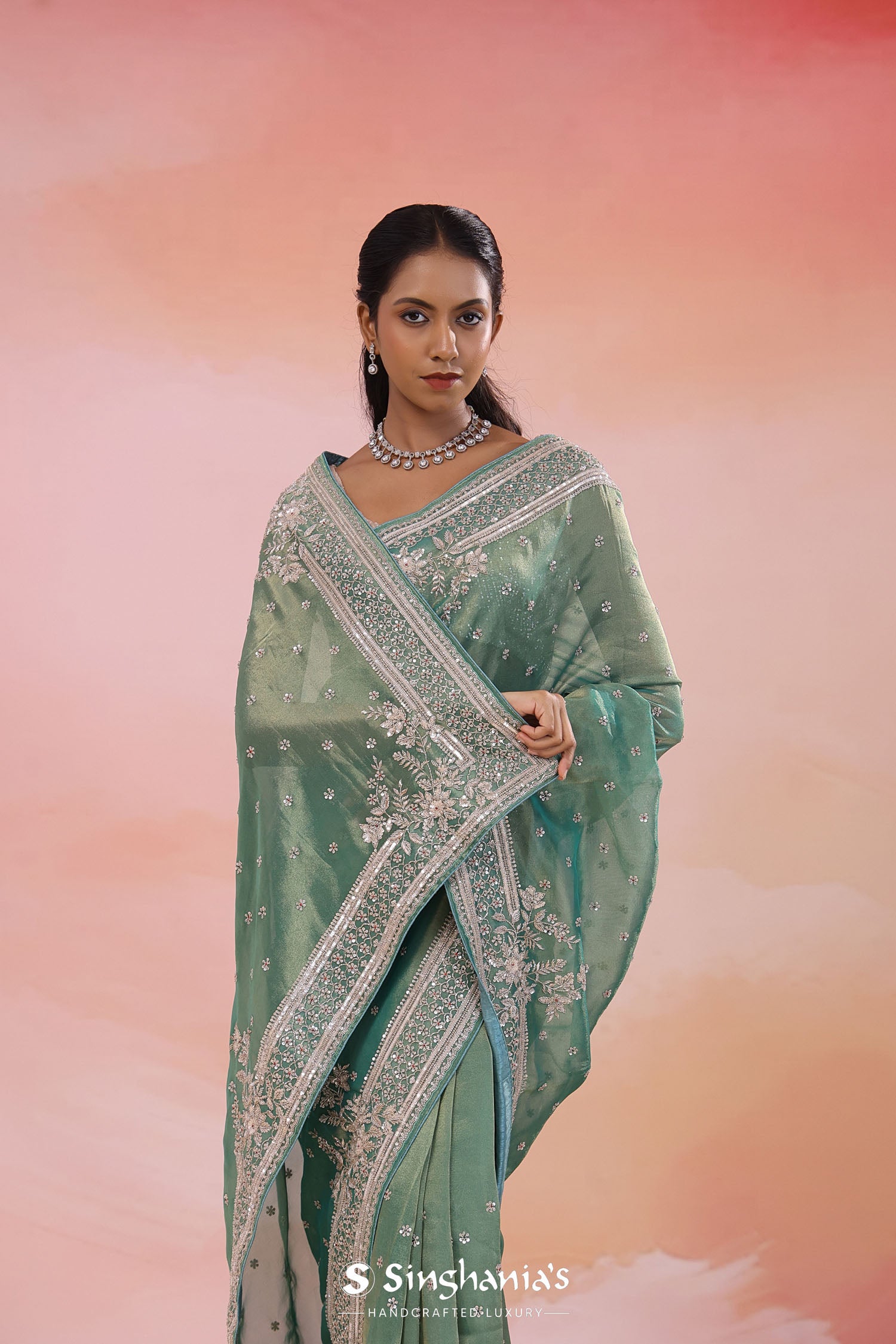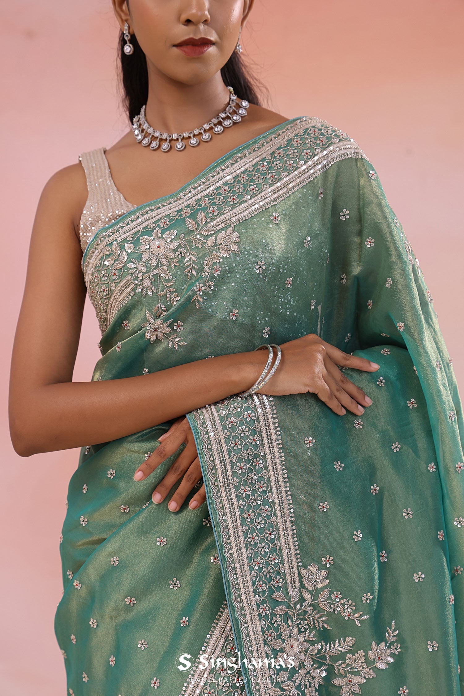 The green georgette tissue saree with fancy border along with an unstitched self blouse for a decent and dignified look.