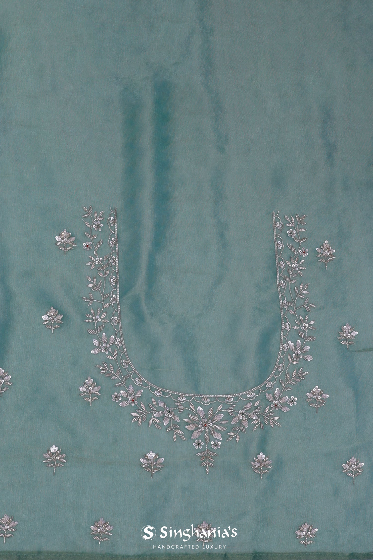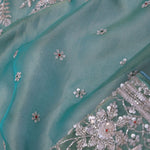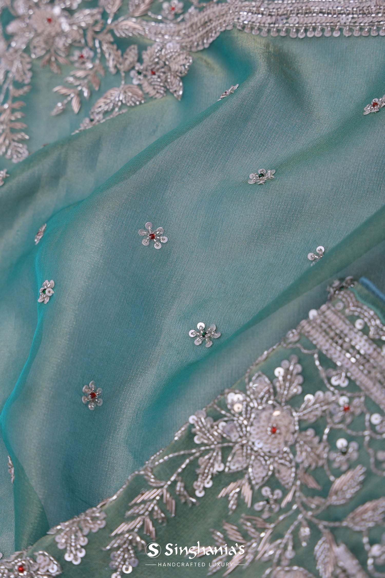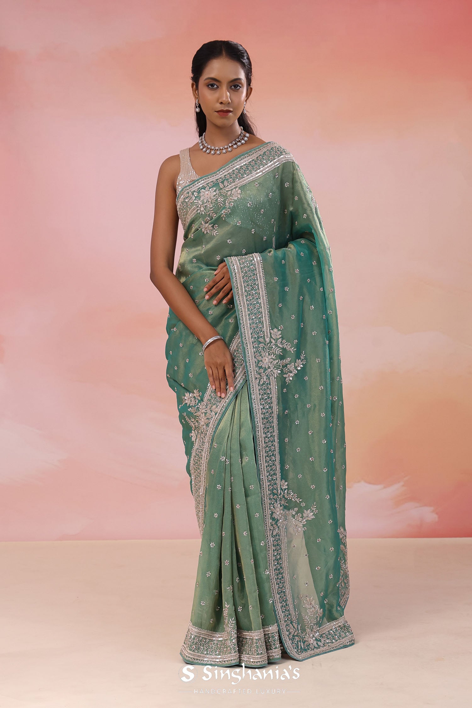 The green georgette tissue saree with fancy border along with an unstitched self blouse for a decent and dignified look.