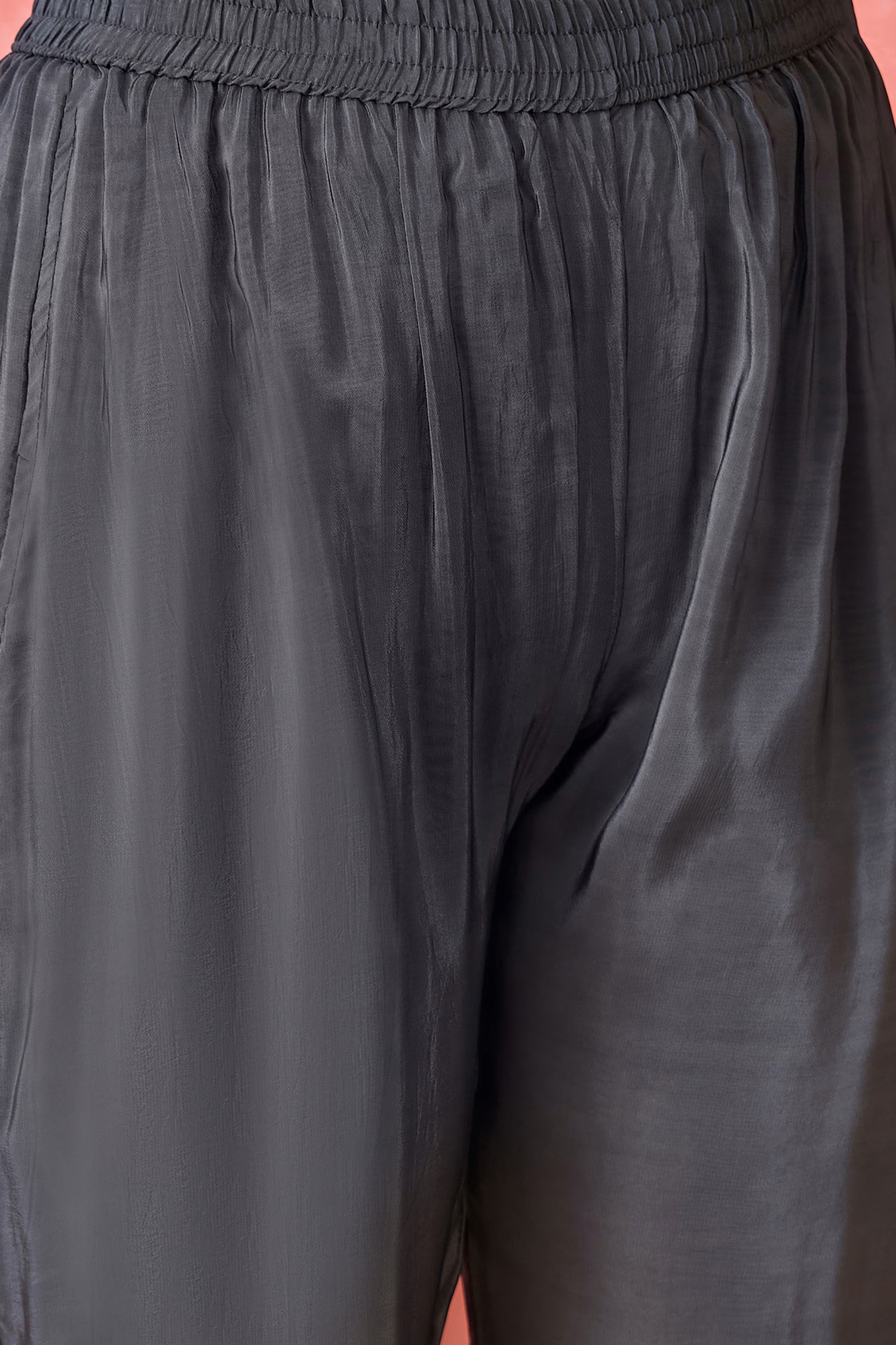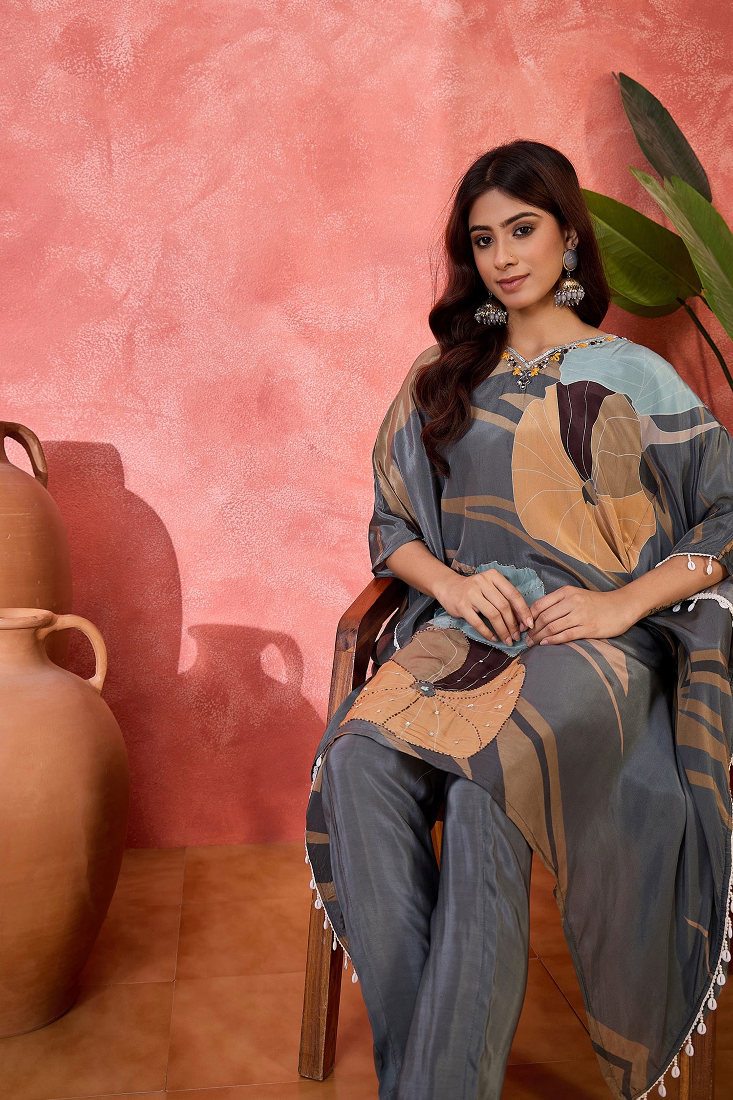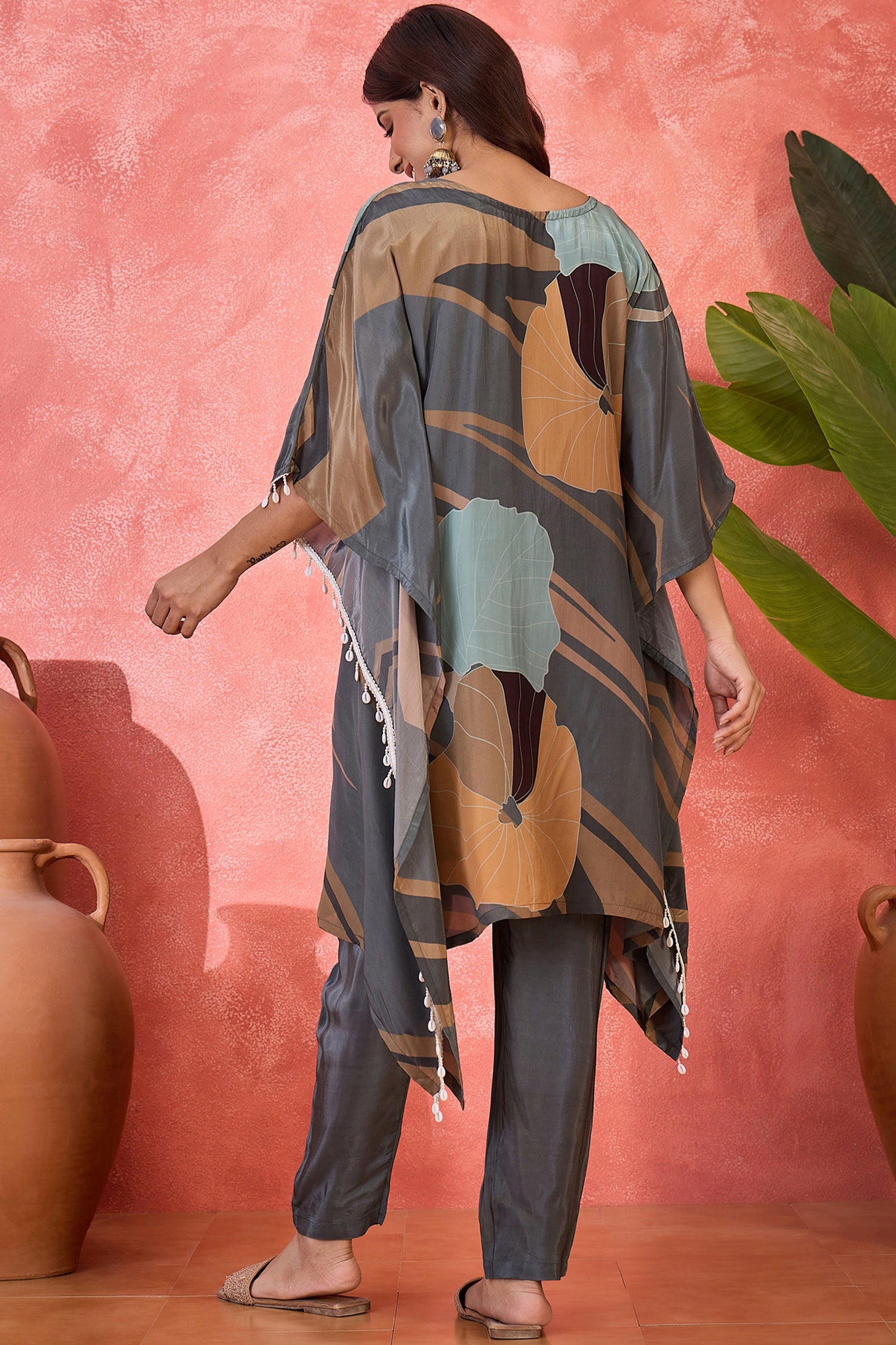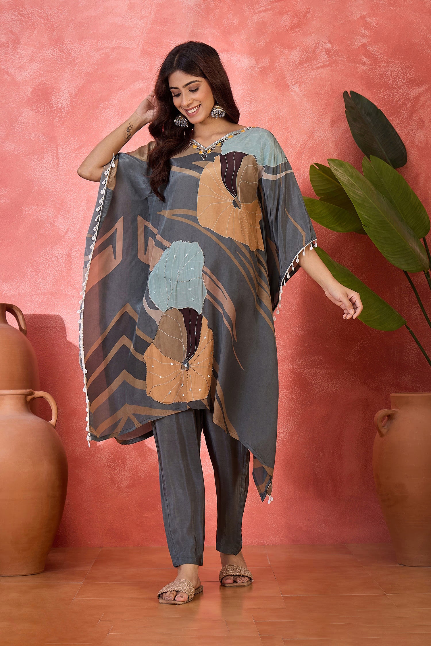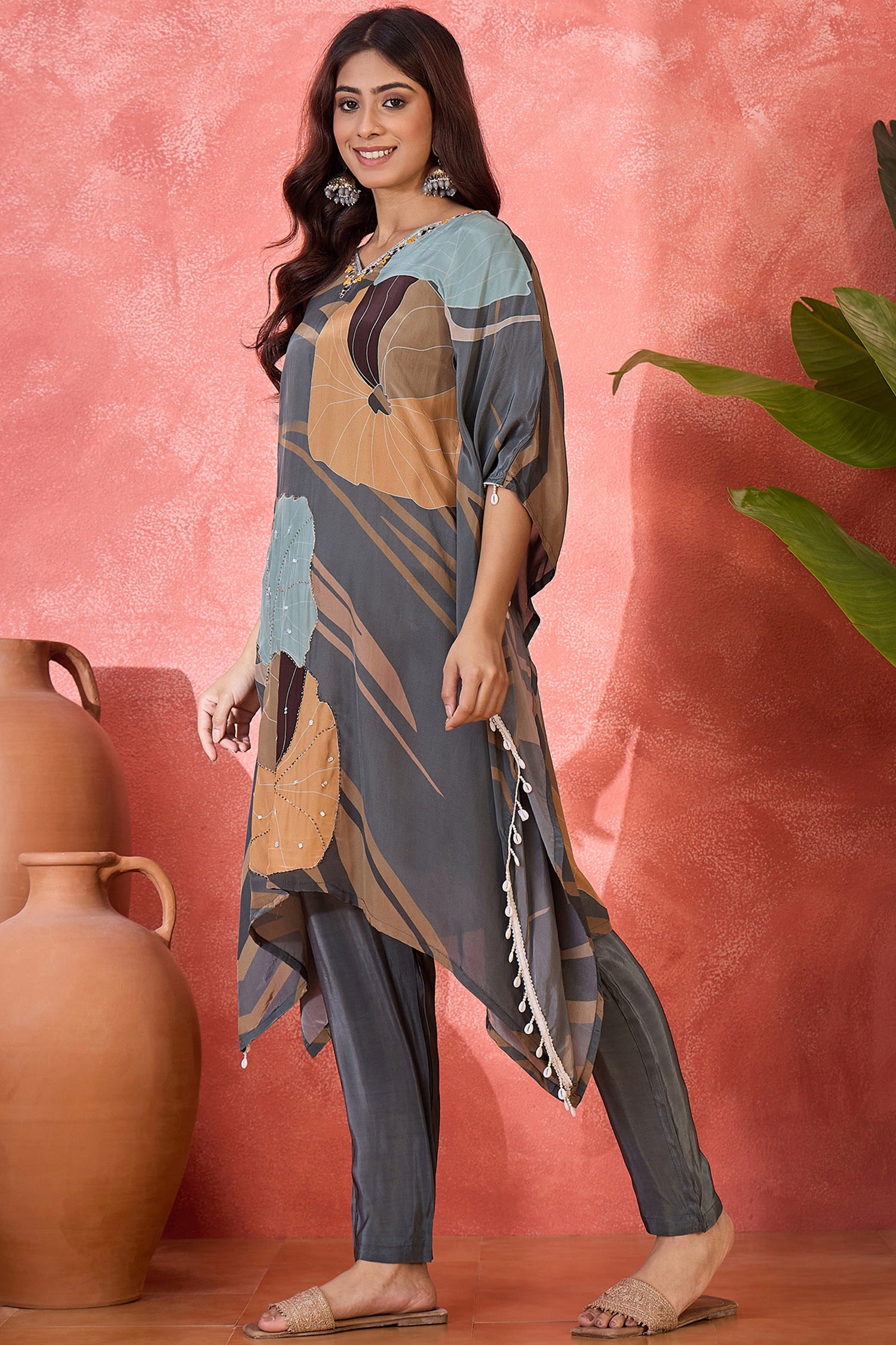 The grey silk printed kaftan style kurti set with leaf prints and subtle sequin work that blends ethnic look with the modern fashion giving it a classy look.