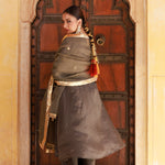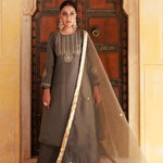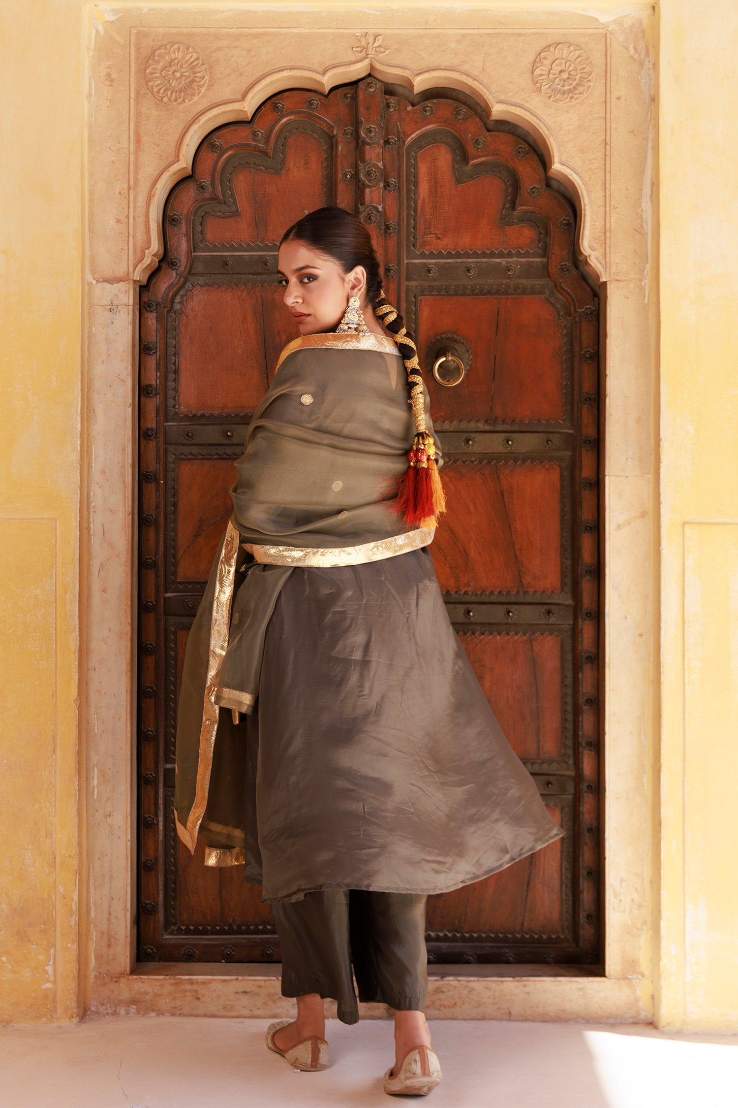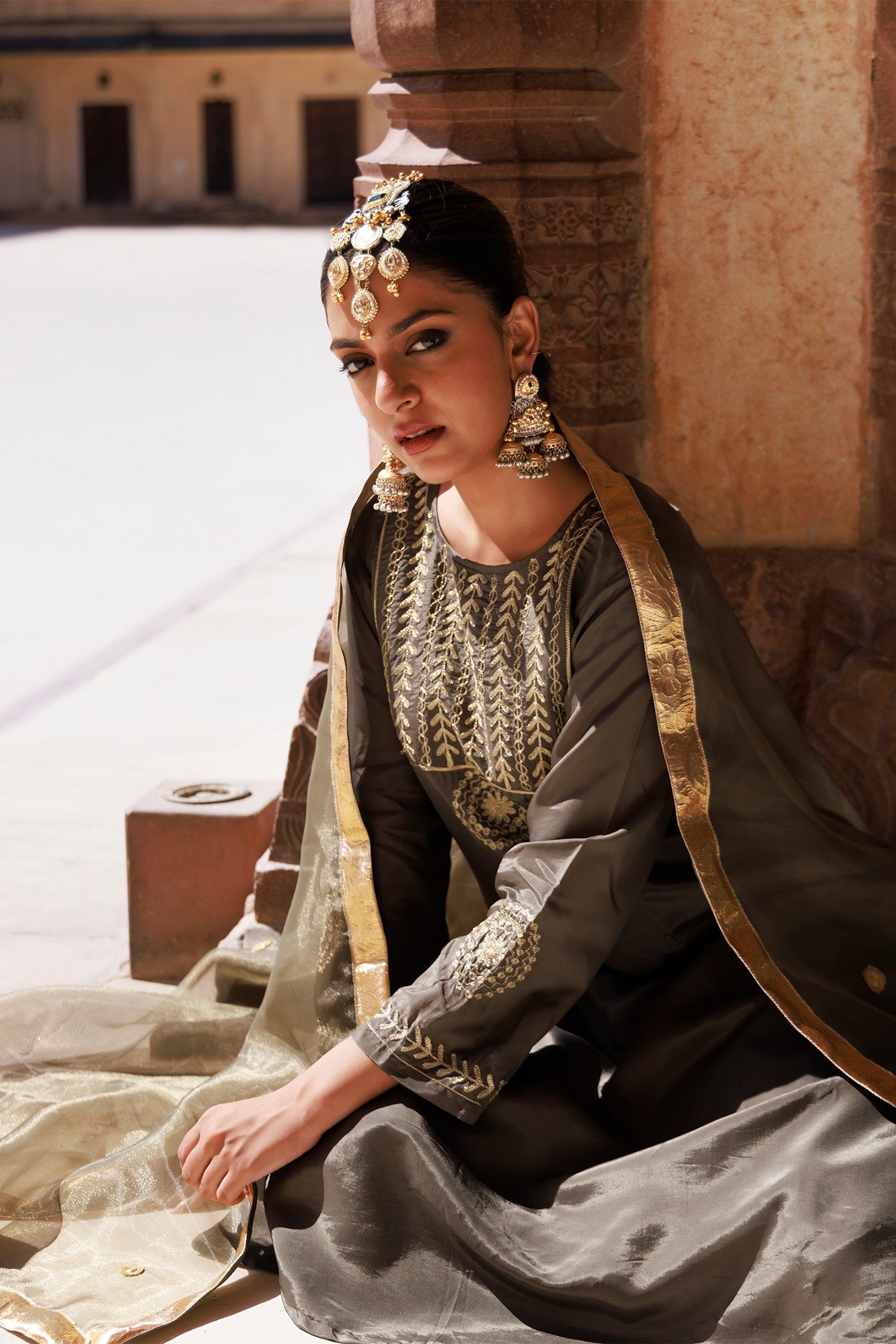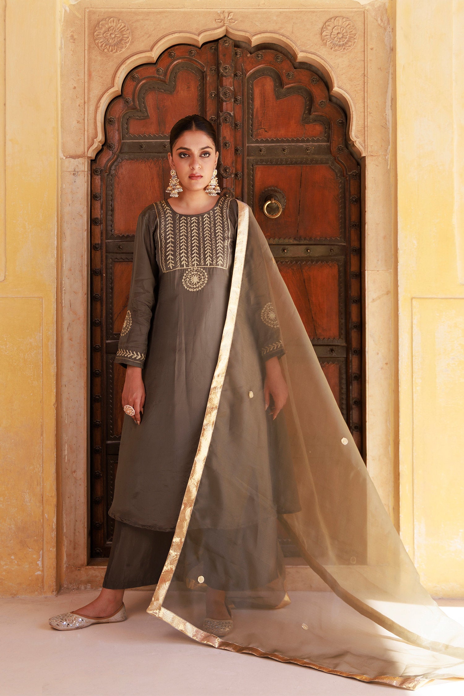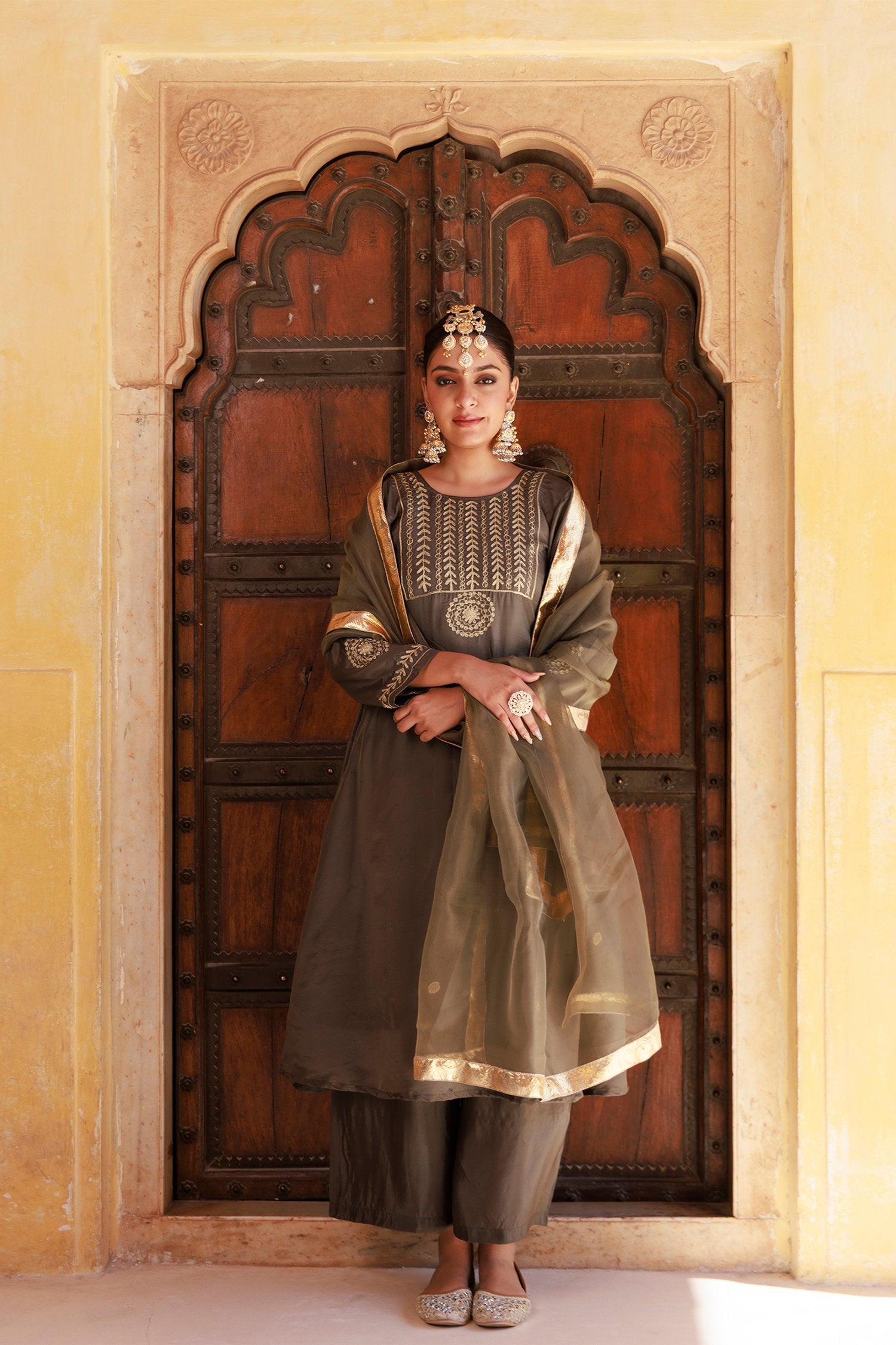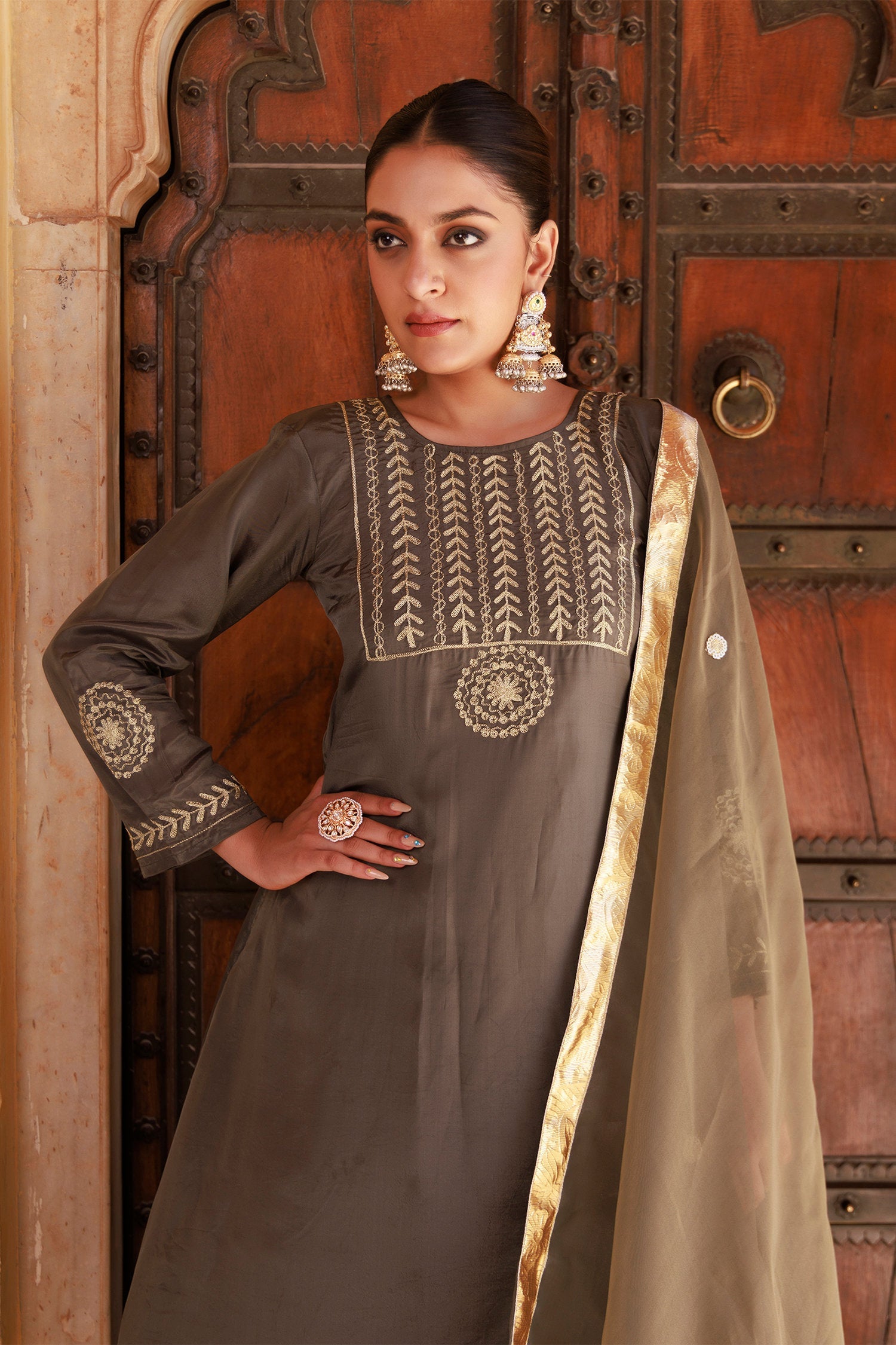 Heavy brown uppada silk kurta set features round neckline and full sleeves adorned with embroidery paired with palazzo pants along with a matching lightweight organza dupatta suitable for any occasions