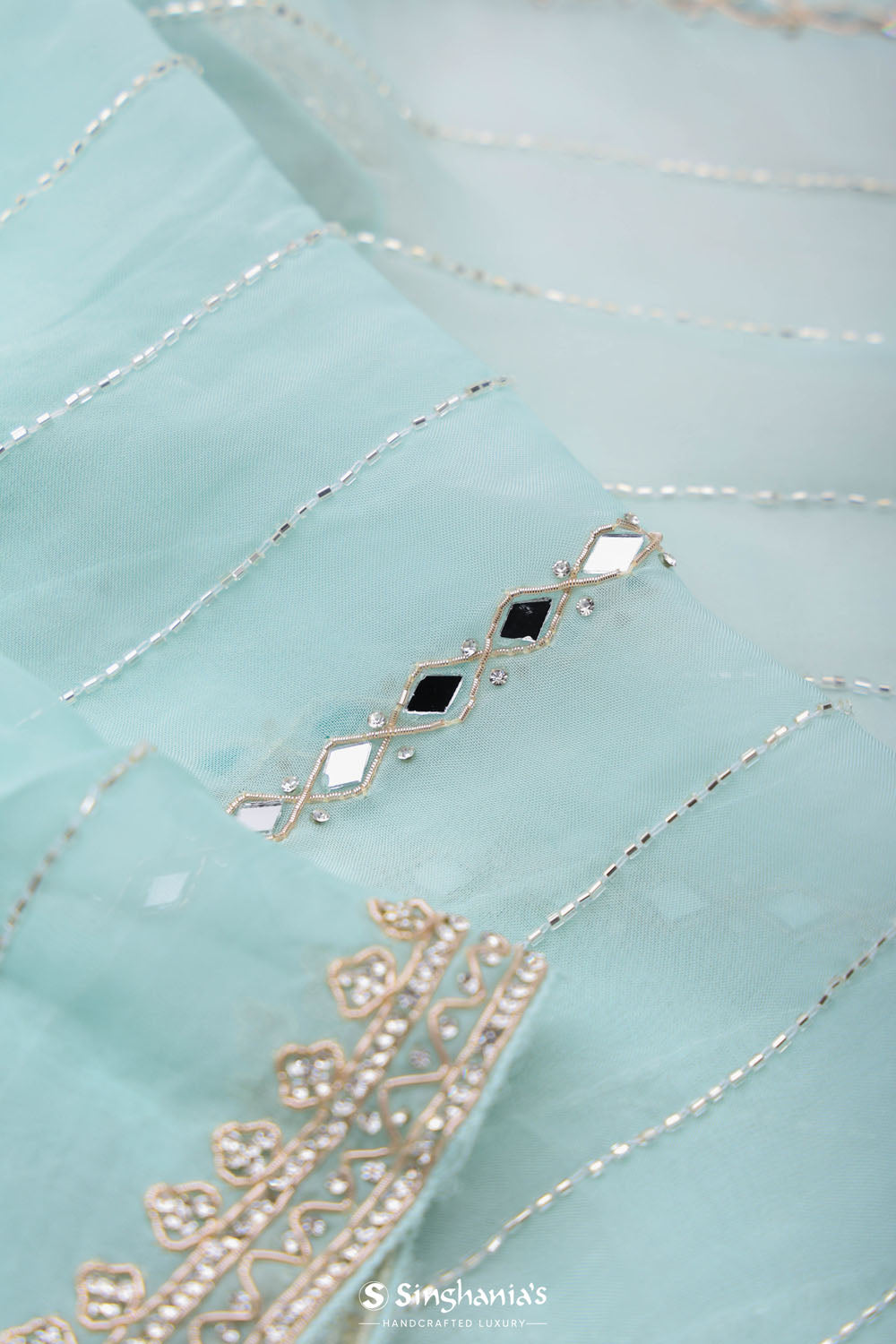 This classic ice blue-coloured saree is made of tissue fabric. It has modern but simple stripe designs embroidered on it with glass beads, stones and mirror work. The big scalloped edge and the neat small border makes it look graceful. It's good for traditional events.