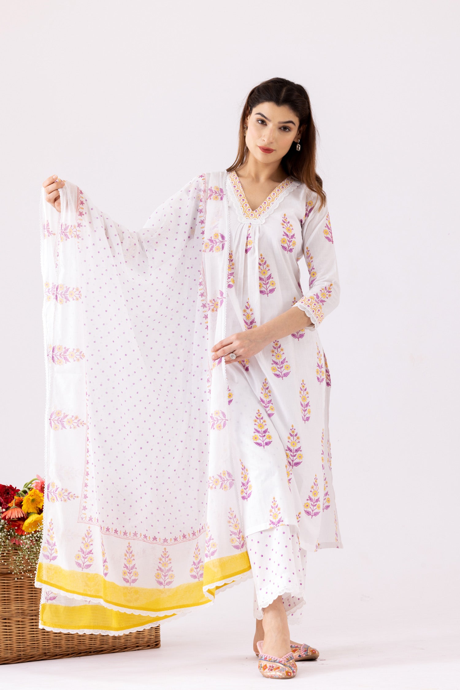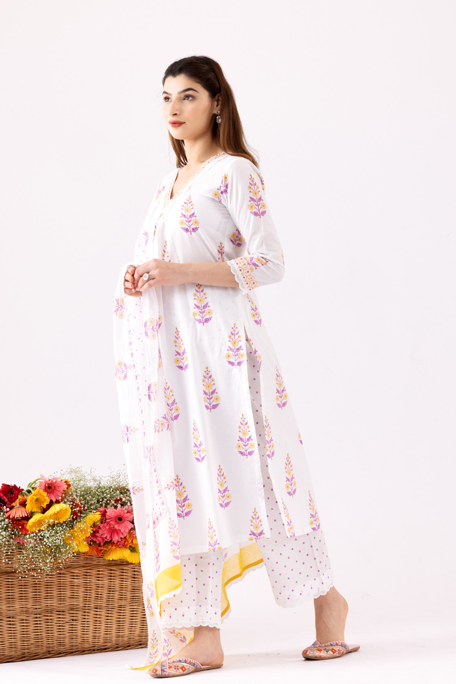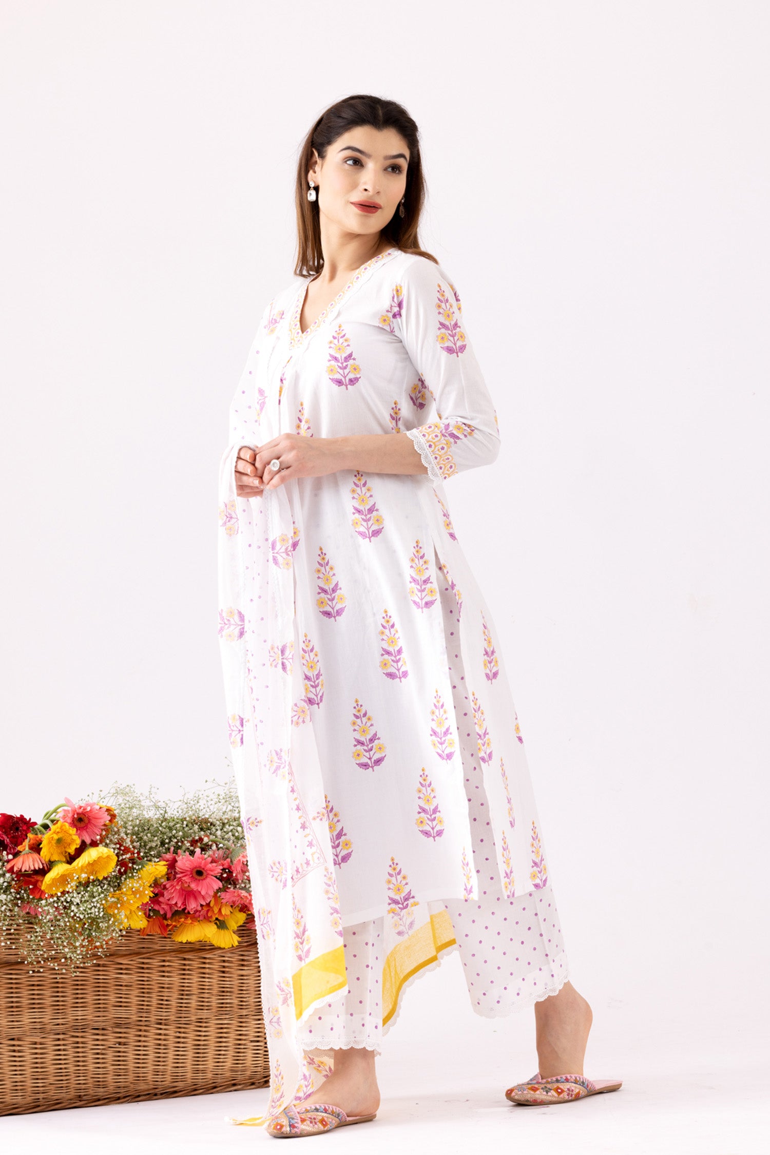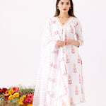 The Ivory Block Print Cotton Kurta With Lace Finish and a Lace Finish Block Print Palazzo and a beautiful dupatta for stylish comfort along with a Trendy look.