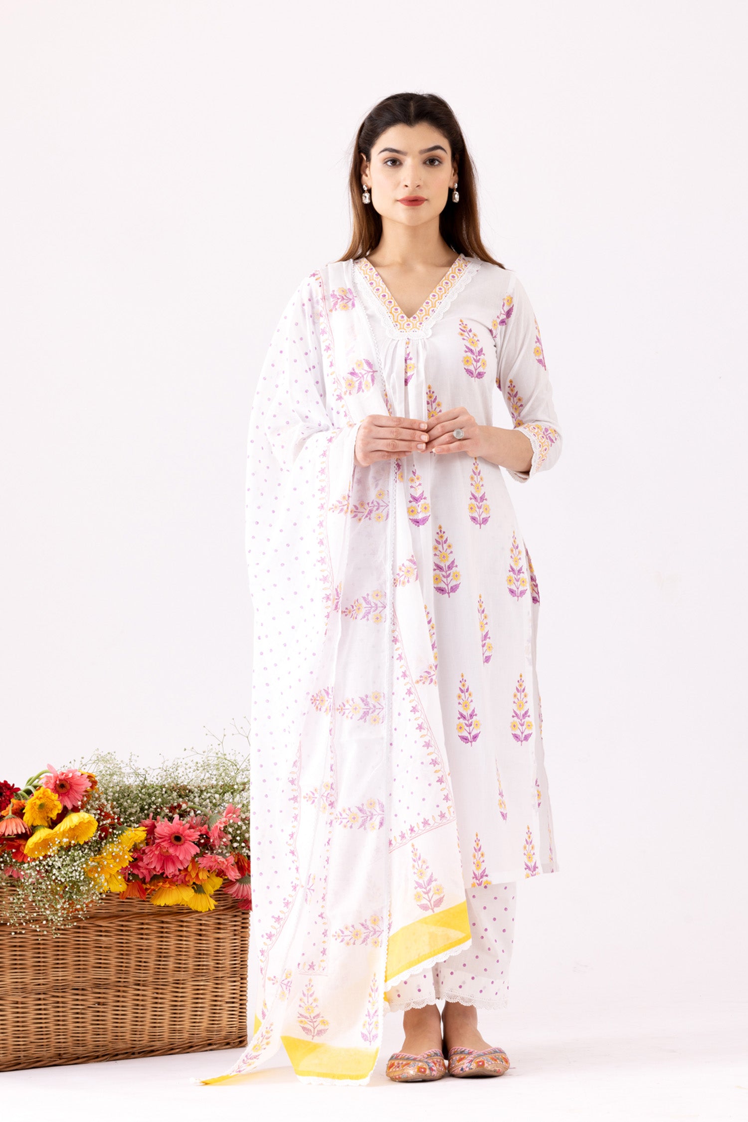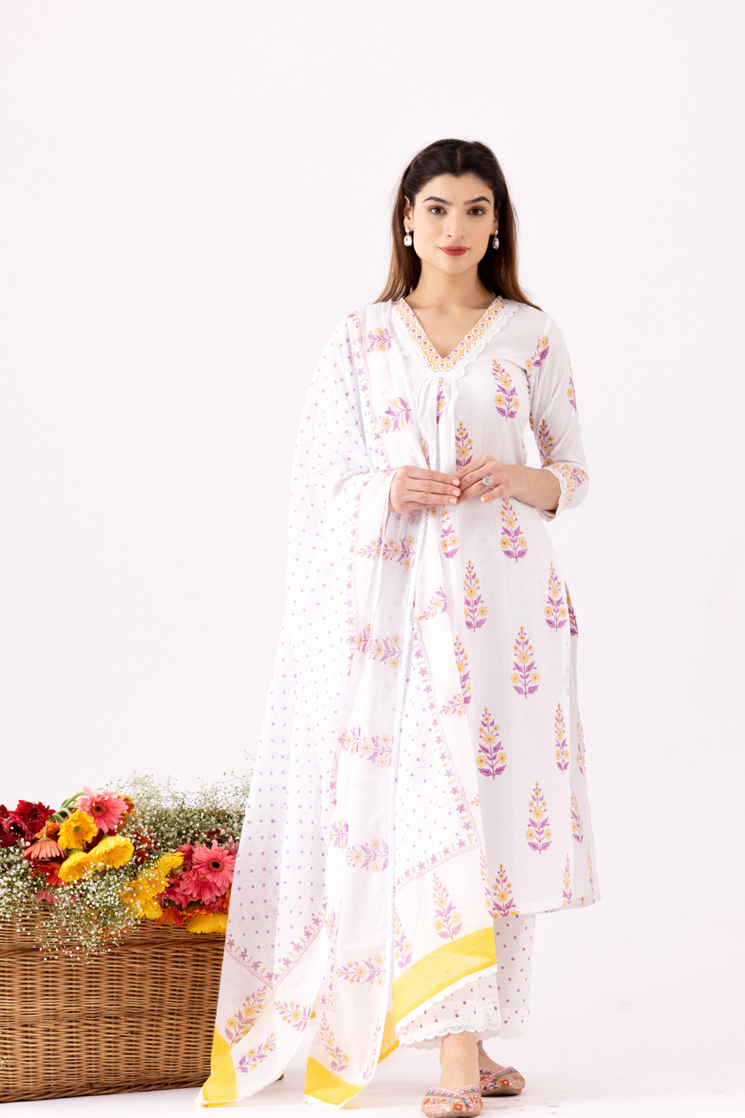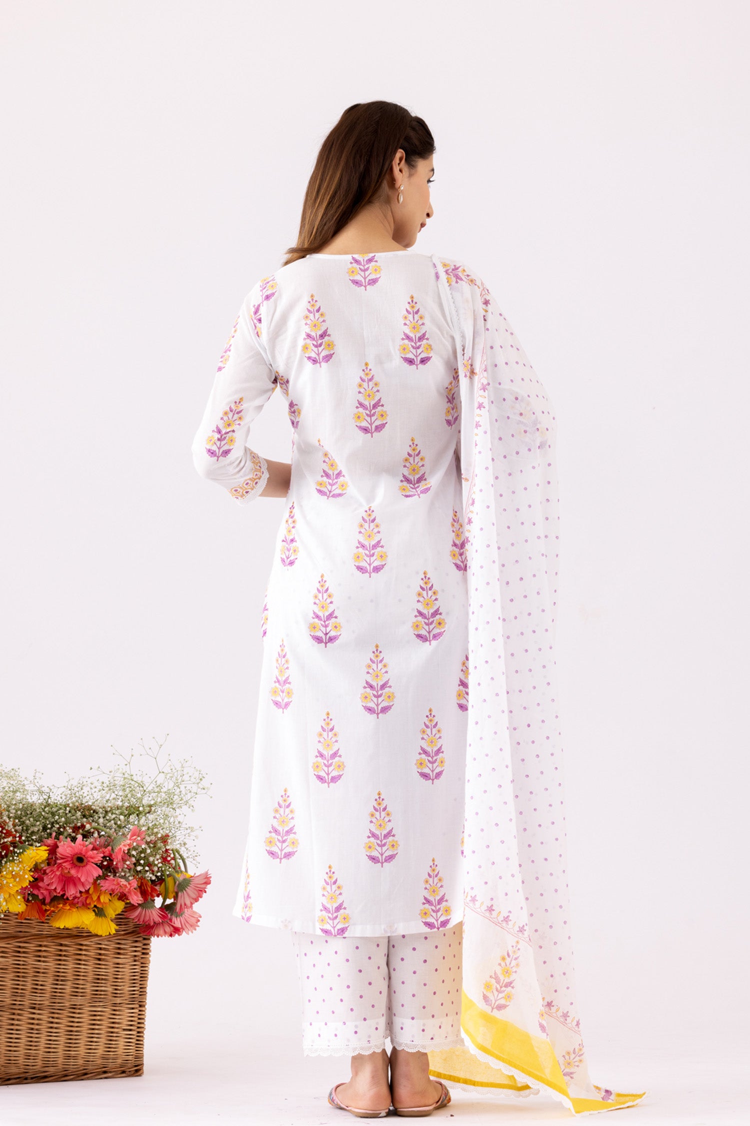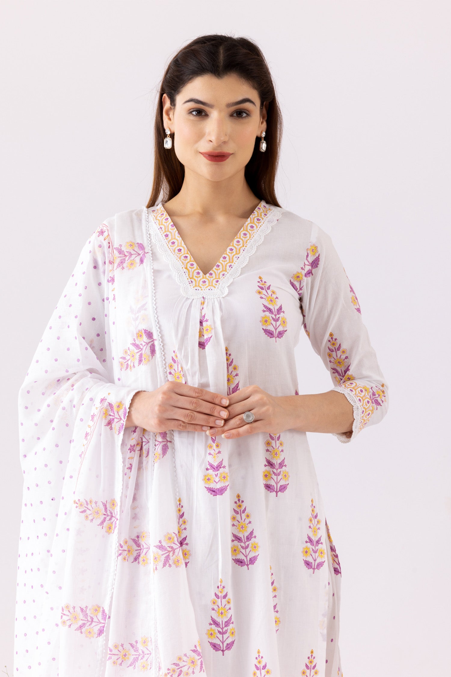 The Ivory Block Print Cotton Kurta With Lace Finish and a Lace Finish Block Print Palazzo and a beautiful dupatta for stylish comfort along with a Trendy look.