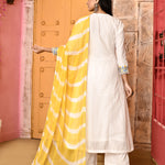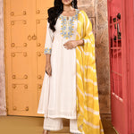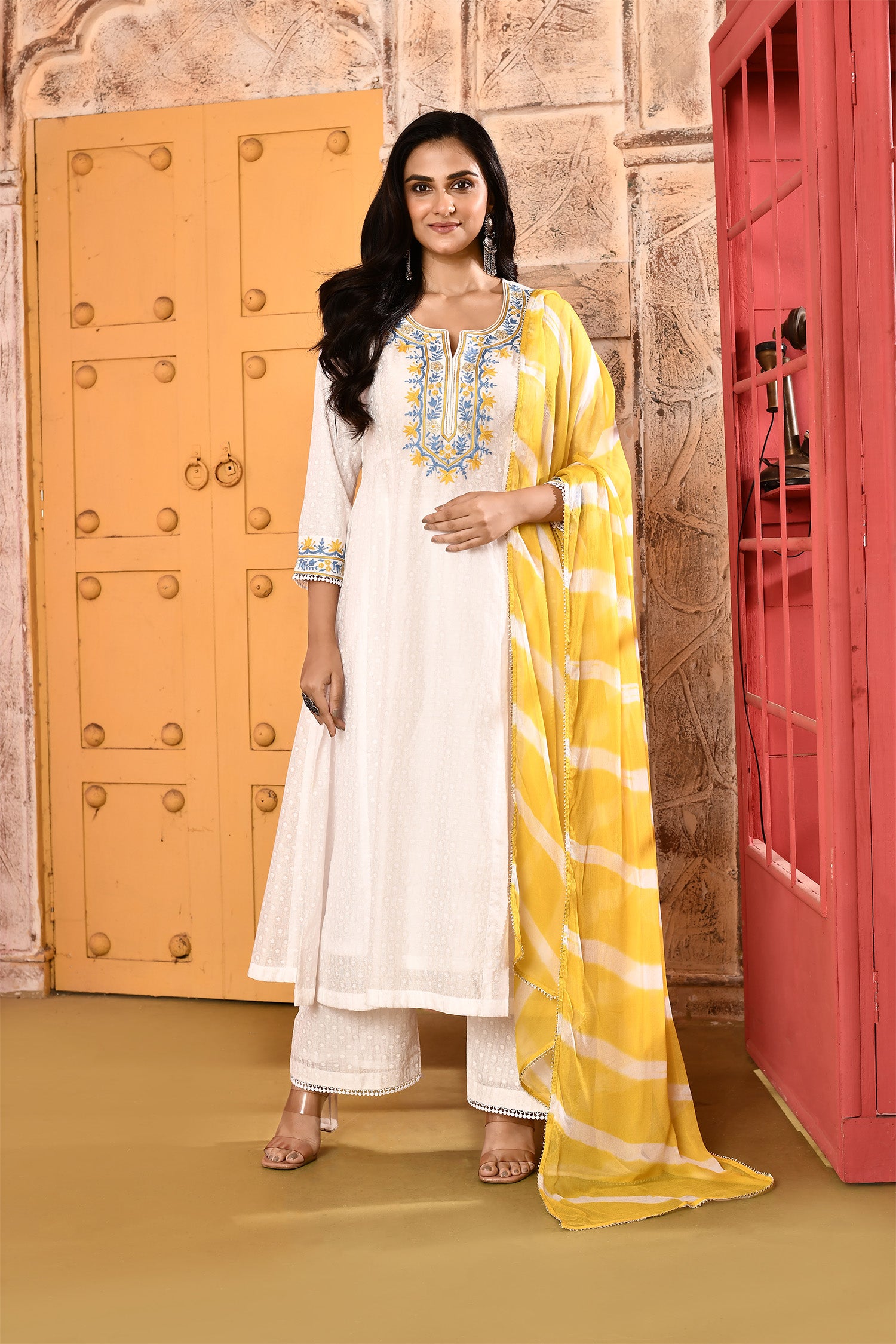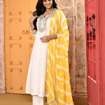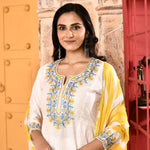 Ivory Neck Embroidered A-Line Kurta And Palazzo With Yellow Dupatta