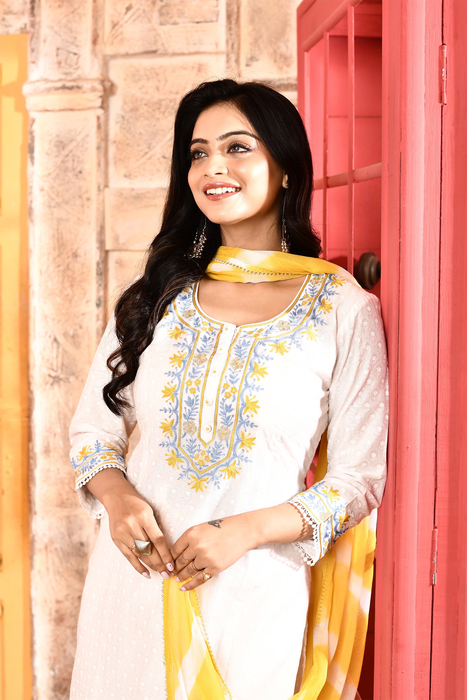 The ivory chanderi kurta and gharara set with contrast chiffon dupatta for a subtle and elegant look with fashion and comfort.