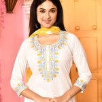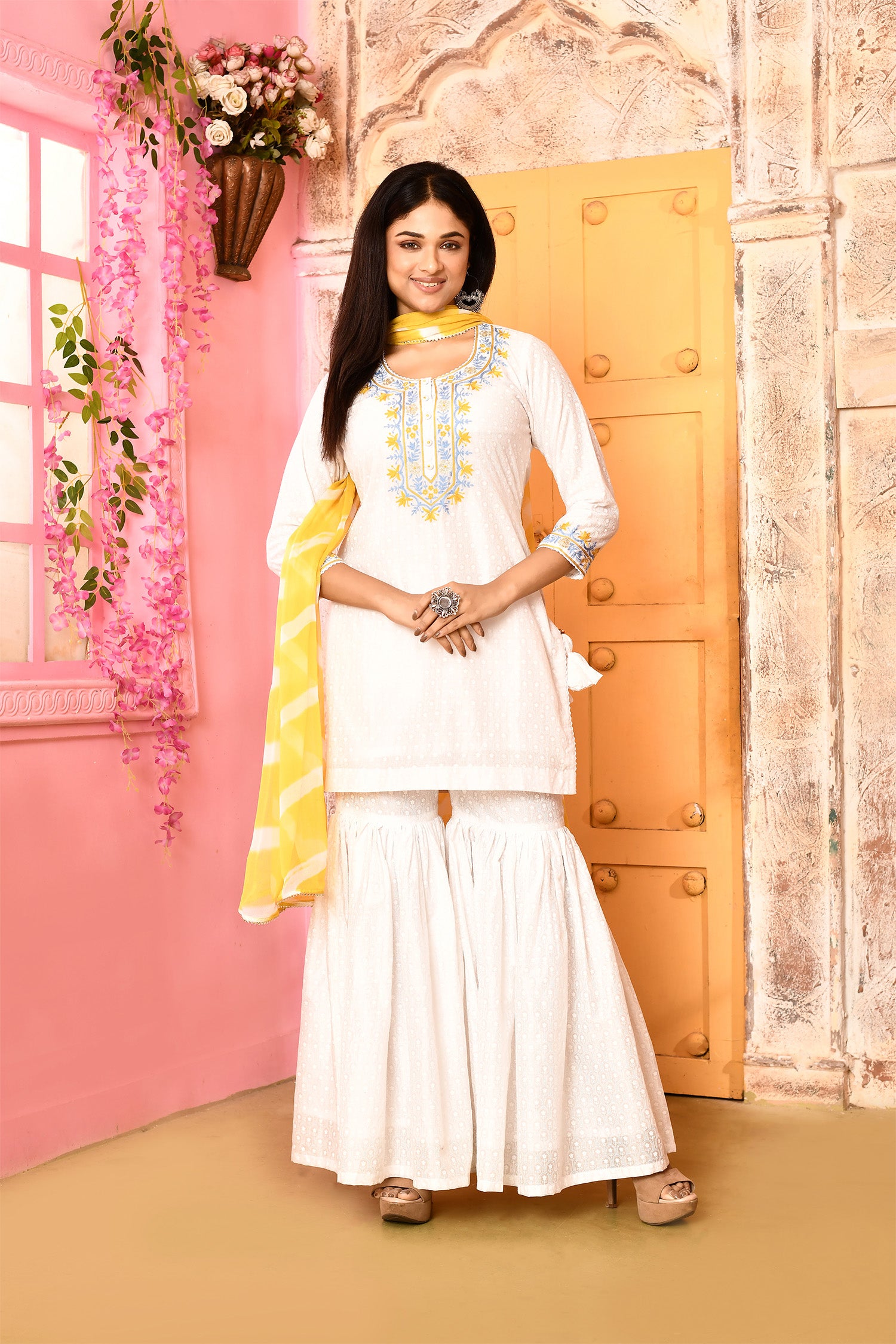 Ivory Neck Embroidered Kurta And Gharara With Yellow Dupatta