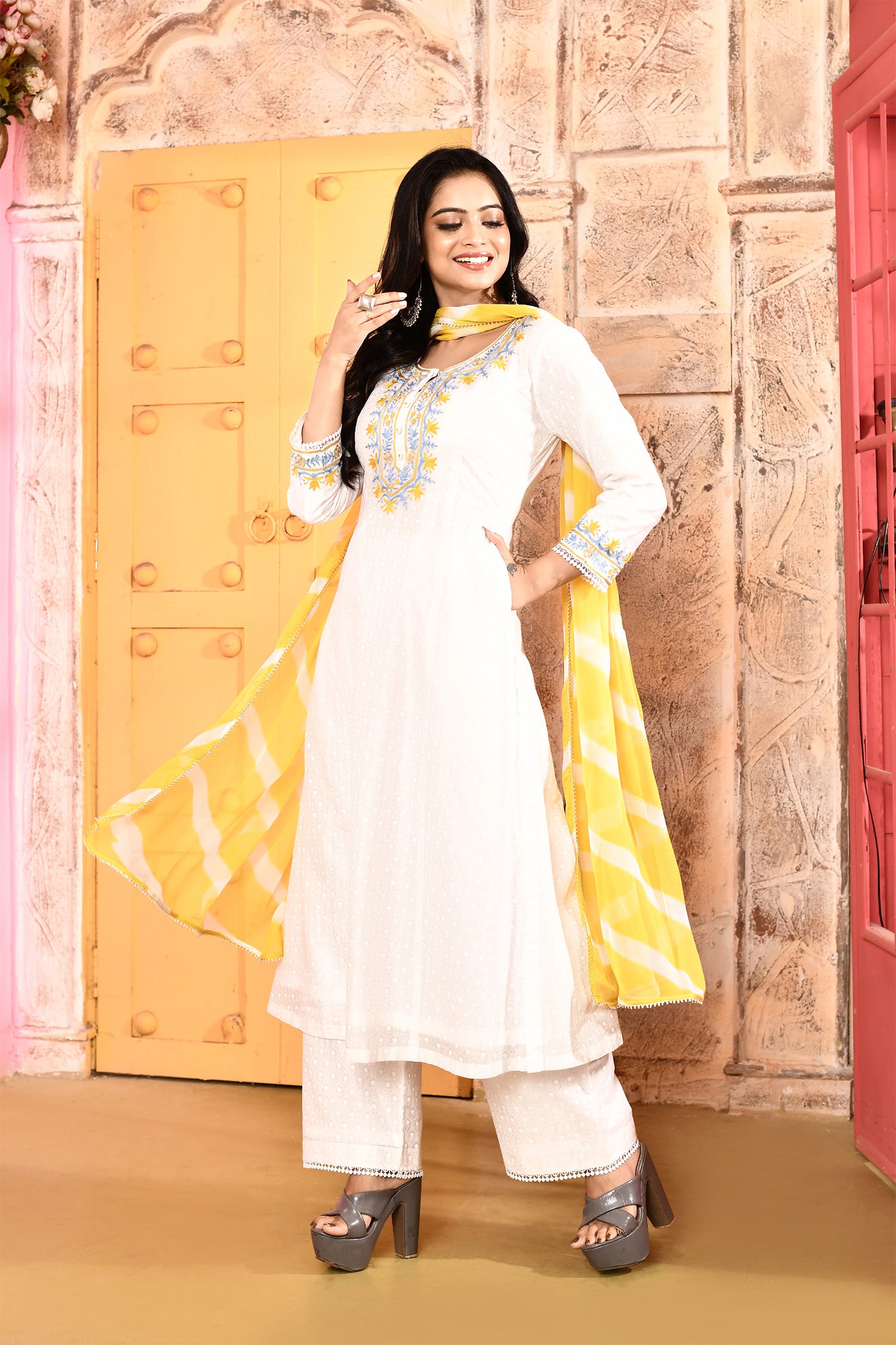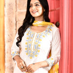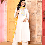 Ivory Neck Embroidered Kurta And Palazzo With Yellow Dupatta