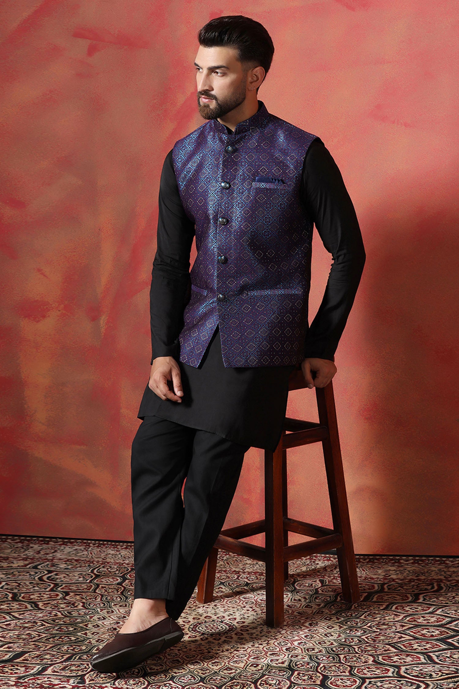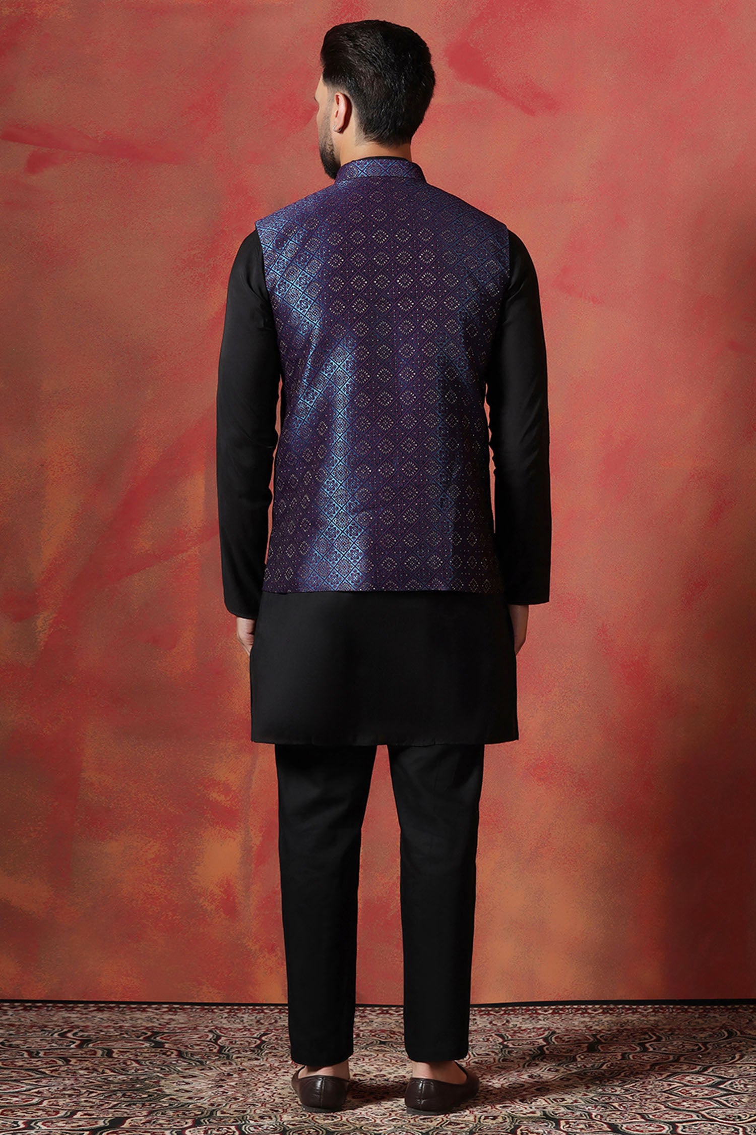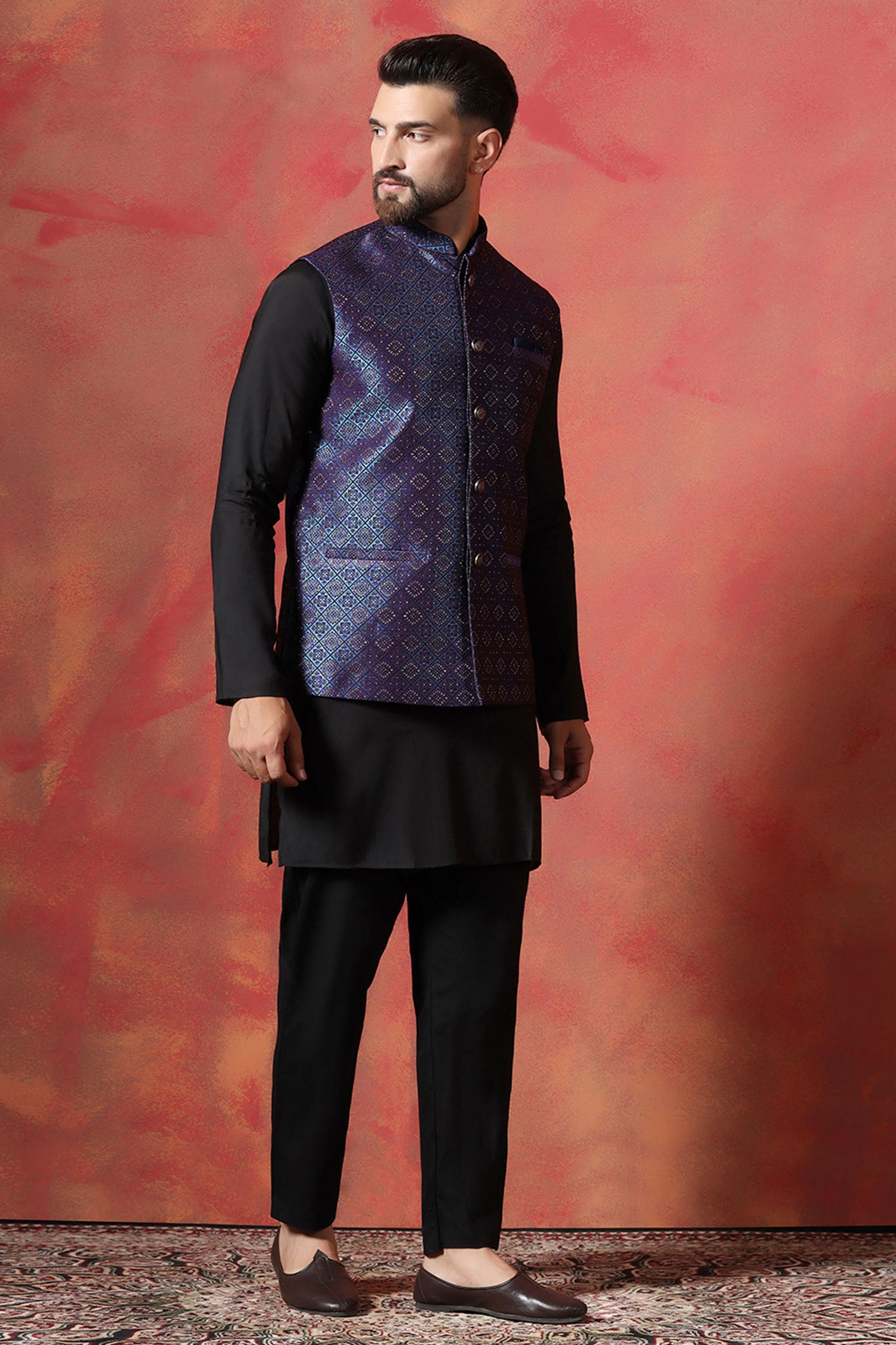 This Jute black kurta complemented with jacquard embroidered jacket features mandarin neckline and sleeveless accompanied with black pants look rich and elegant to pair with any outfit