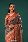 This delightful saree is crafted from moonga silk and features the contrast border and floral - peacock jaal & paisley kani weave from Kashmir. The earthy marengo grey colour is perfect for special occasions. The saree comes with a matching blouse piece.