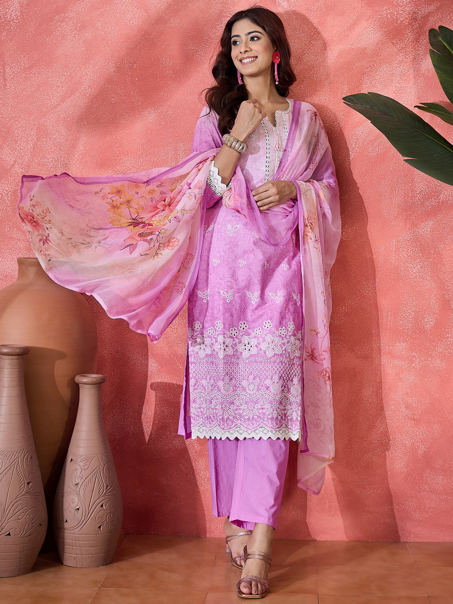 The lavender purple cotton straight cut kurta with floral thread embroidery along with matching solid pant and floral printed dupatta for a neat ethnic look.