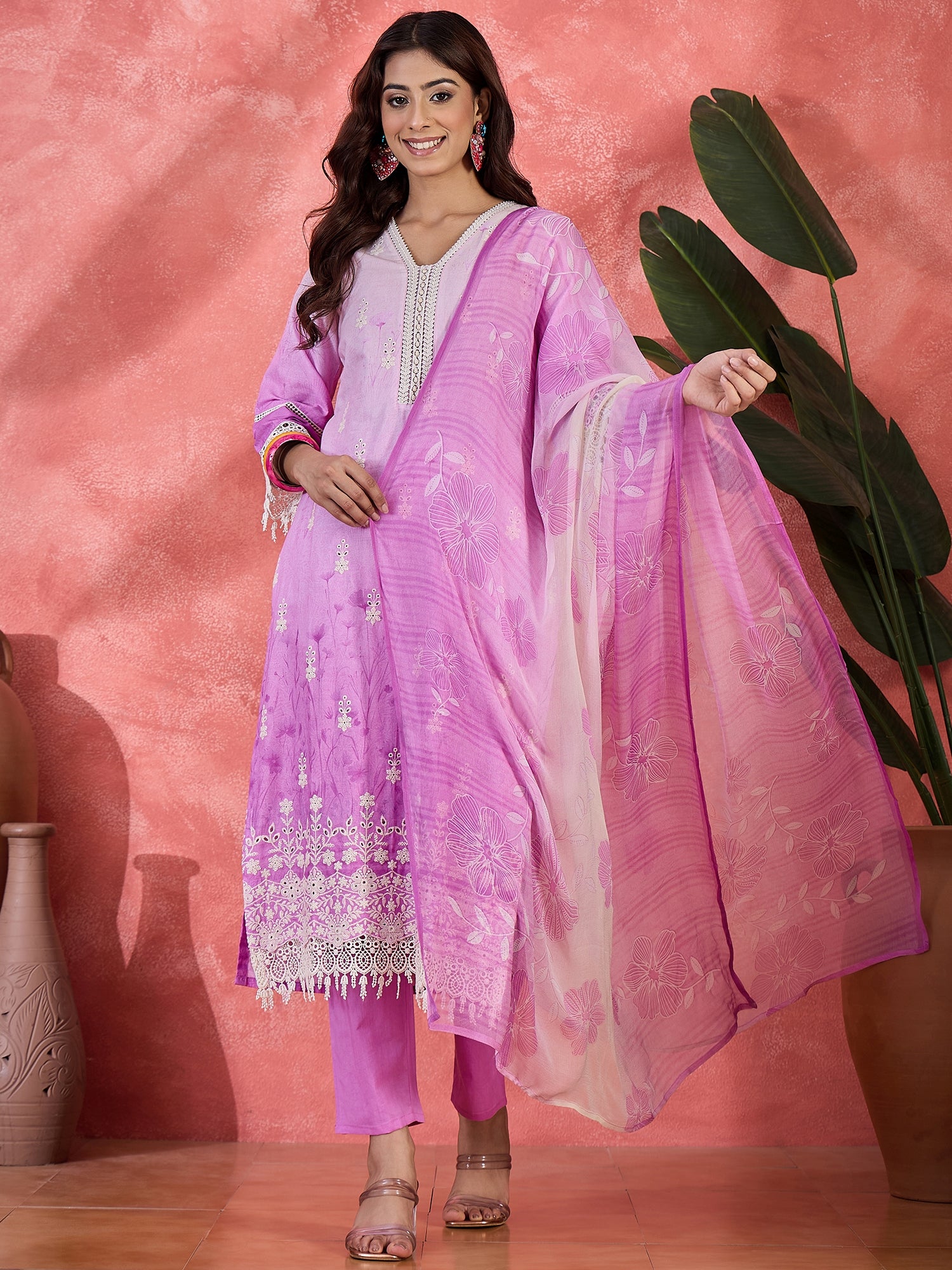 The lavender straight cut cotton kurta with floral thread embroidery along with matching solid pant and floral printed dupatta for an ethnic look with charm.