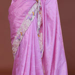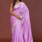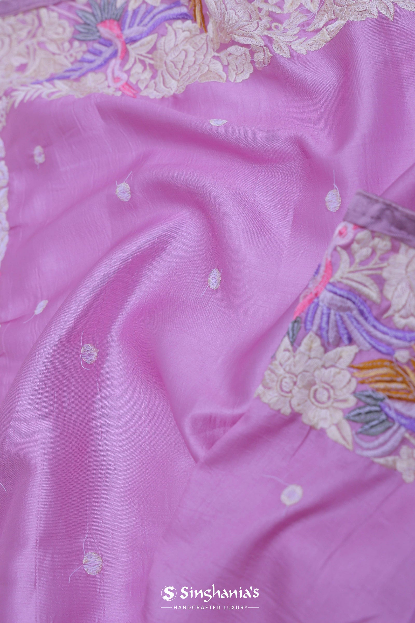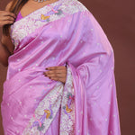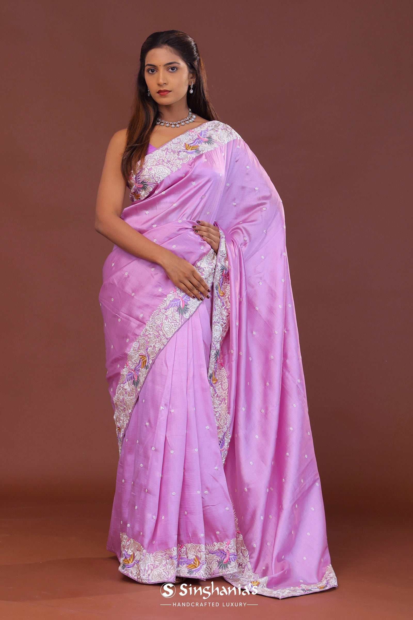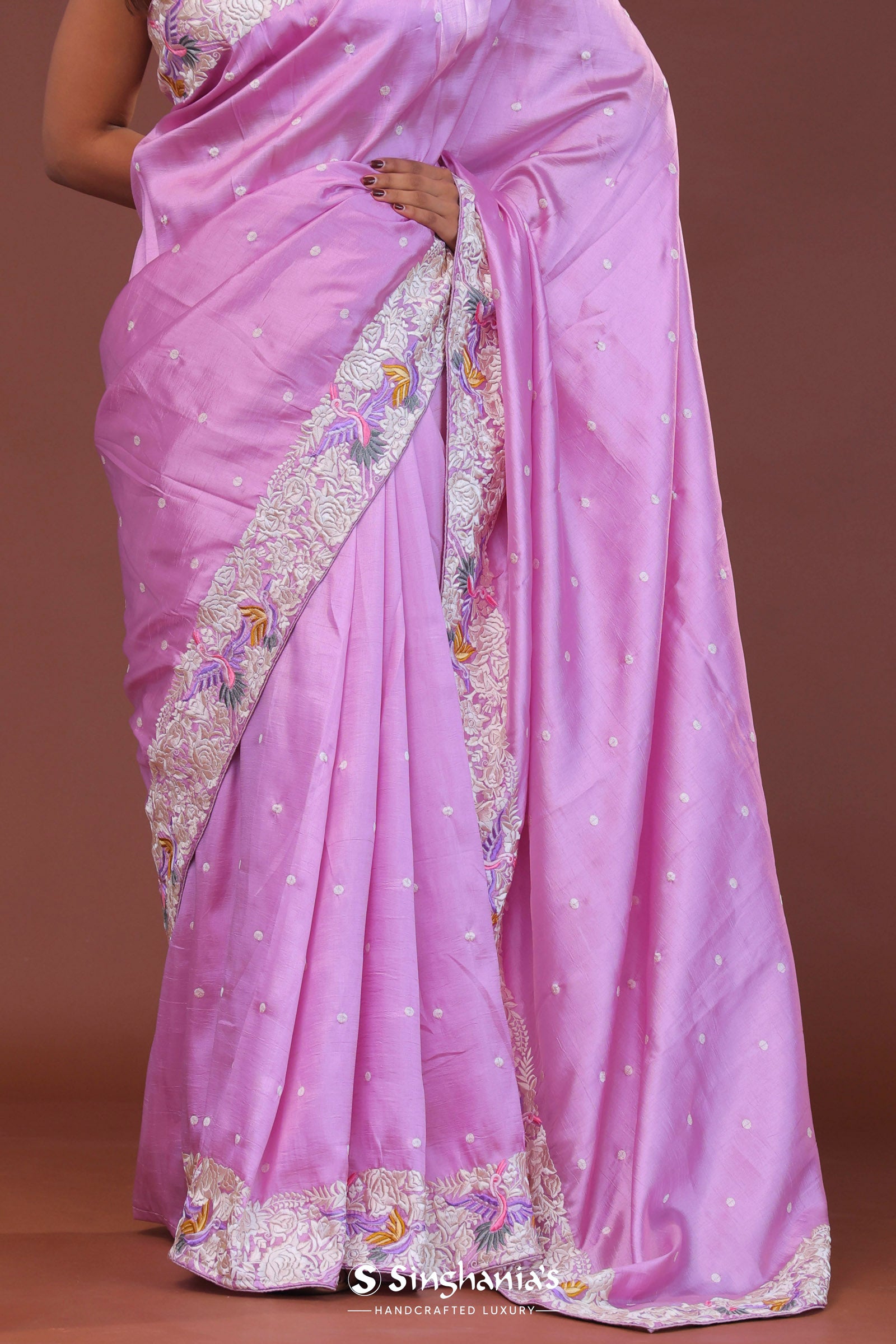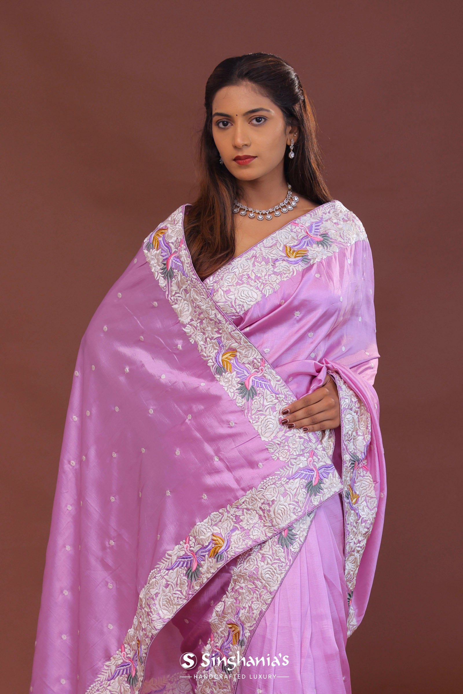 Delicate white parsi embroidery and buttis are dispersed across the body of this lavender soft silk saree. An elegant fusion of softness and tradition, ideal for formal events.
