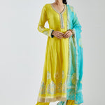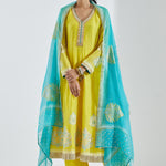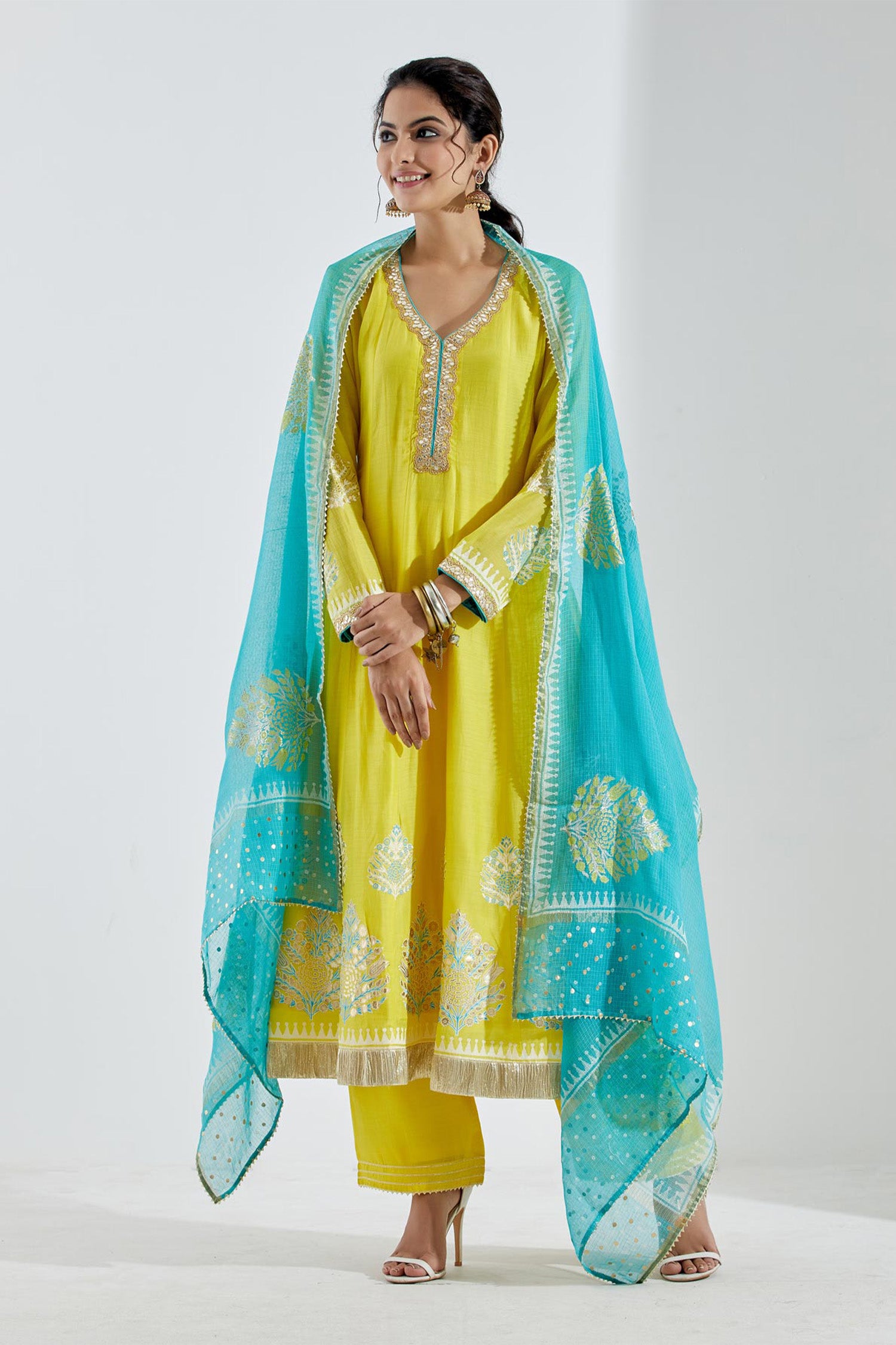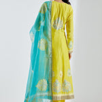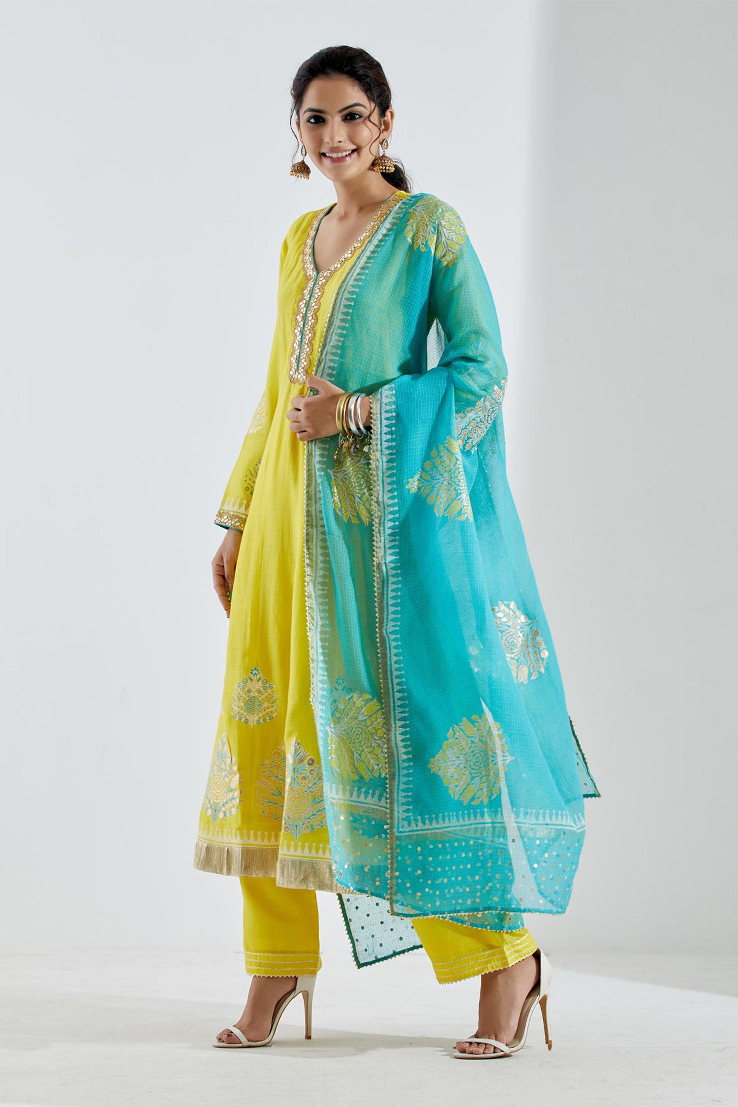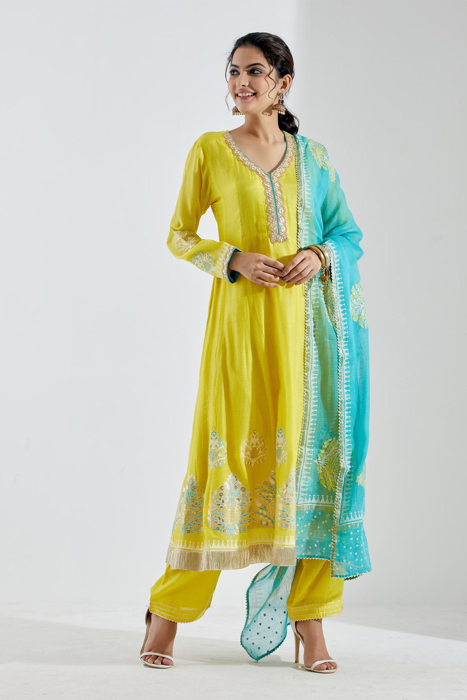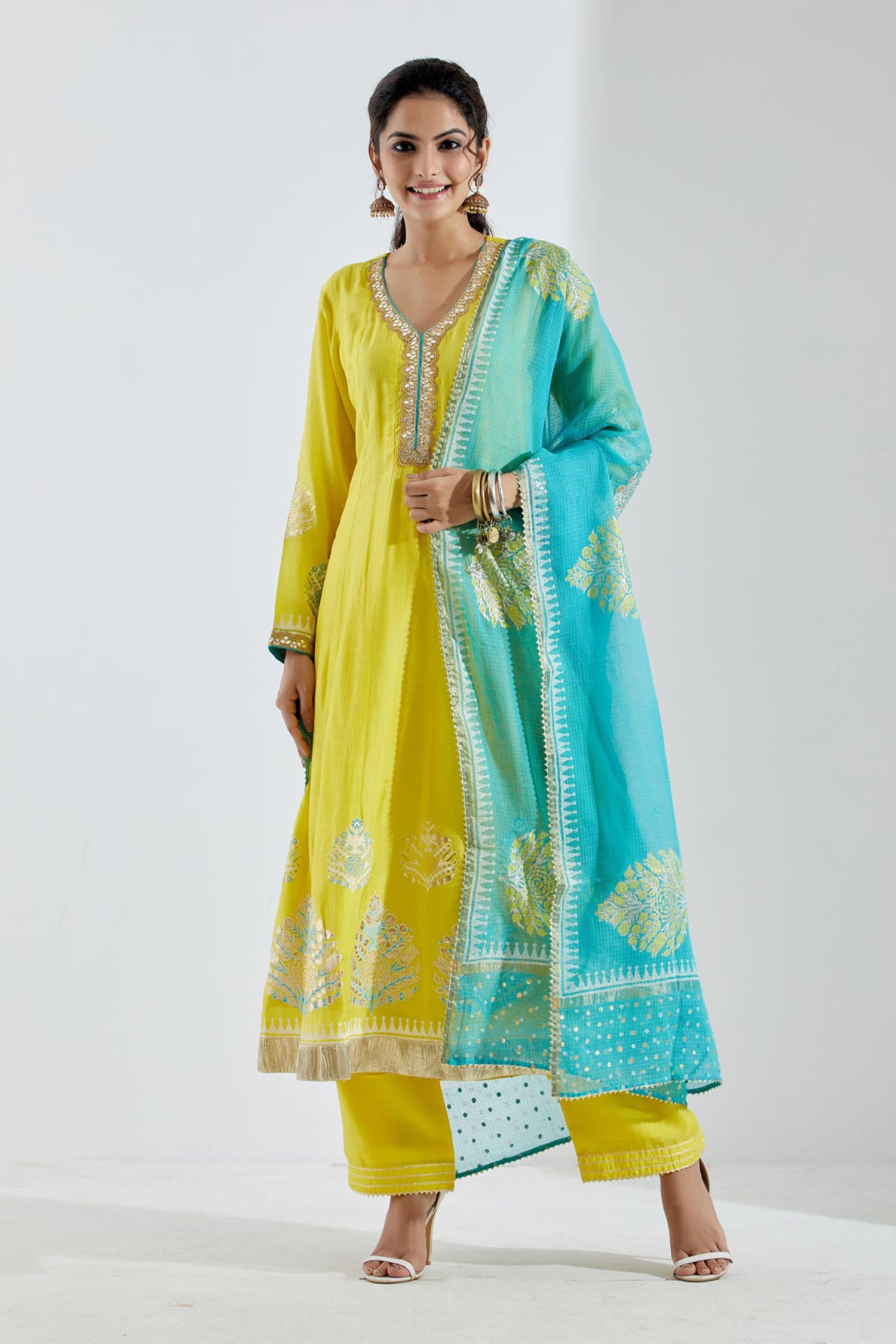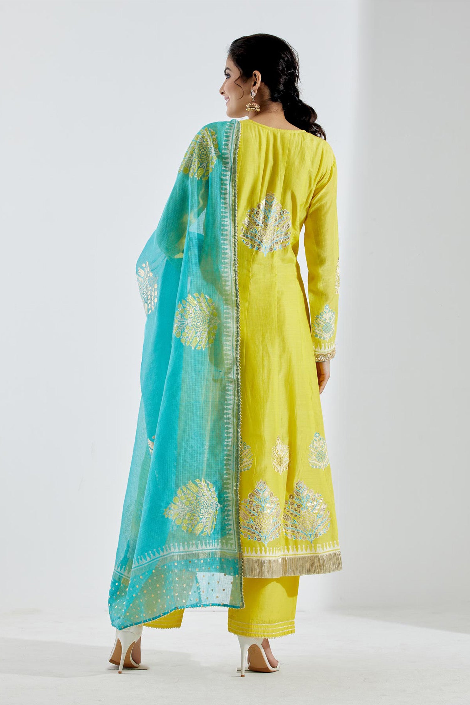 Lemon Yellow Anarkali Set With Gold And Silver Print