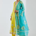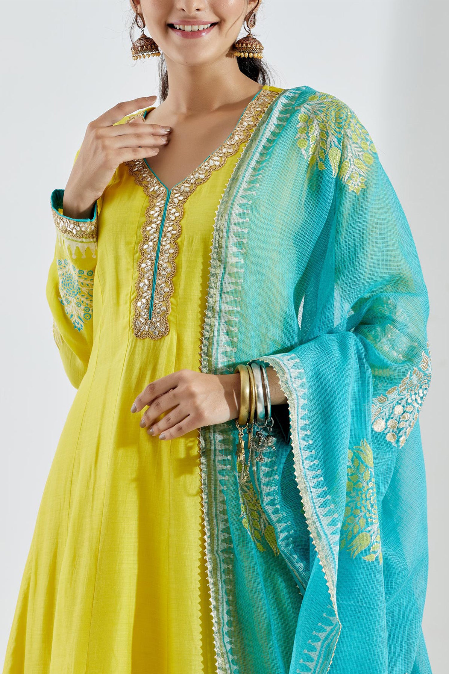 The cotton silk anarkali set with subtle floral patterns gota patti work along with the contrasting Blue dupatta with lace and subtle golden printed design for an charismatic and stand out look.