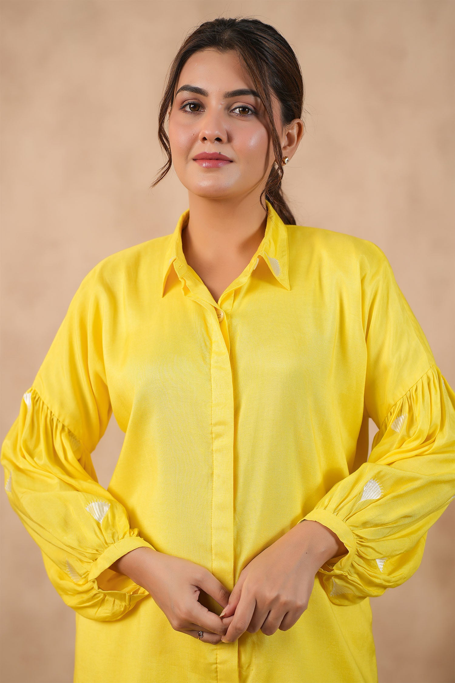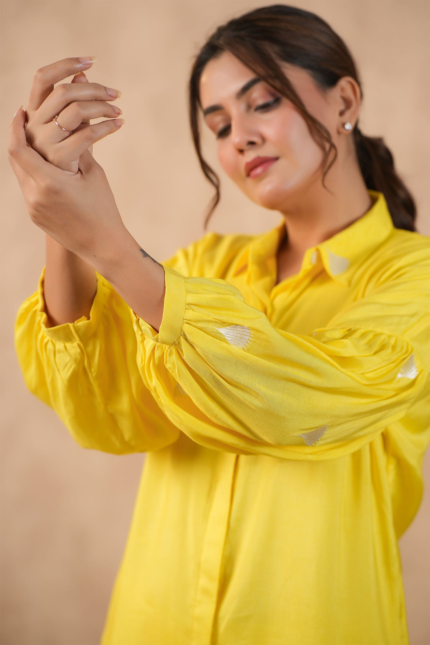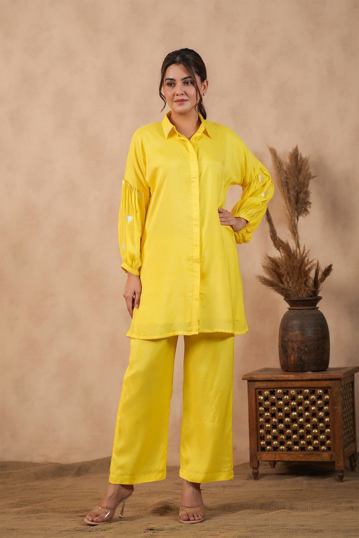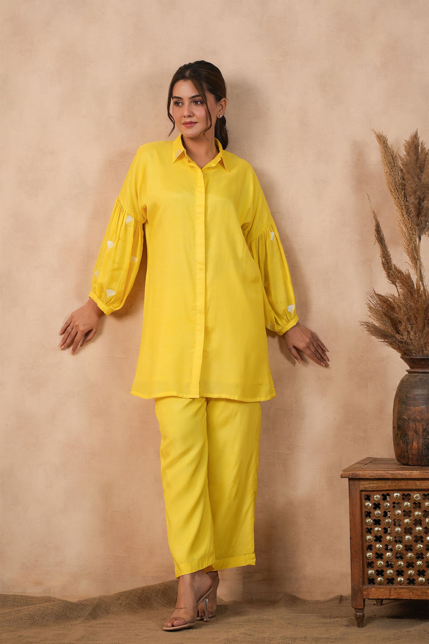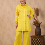 The lemon yellow santoon solid co-ord set with matching solid pant for a simple and neat look with trendy charm.