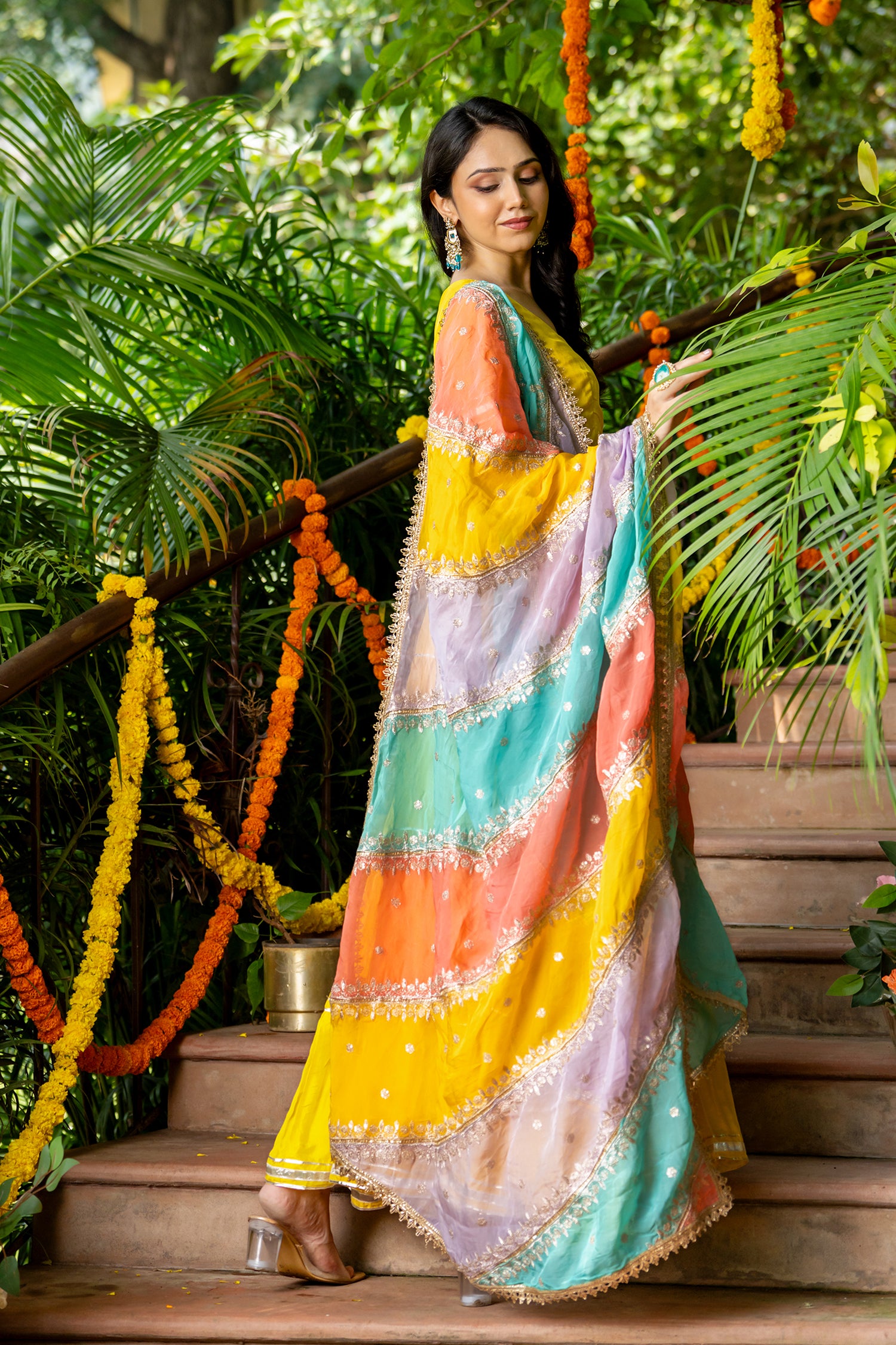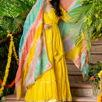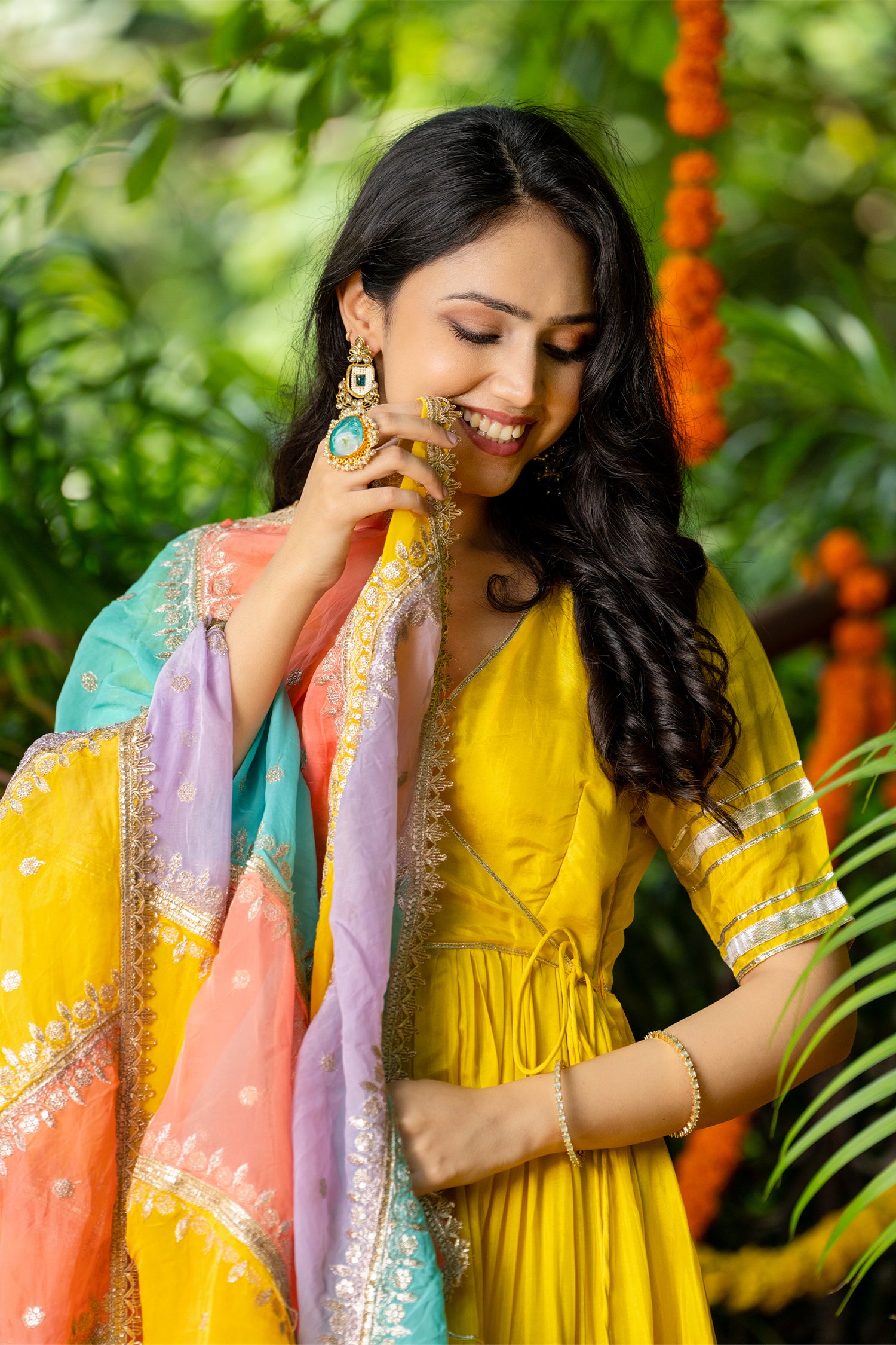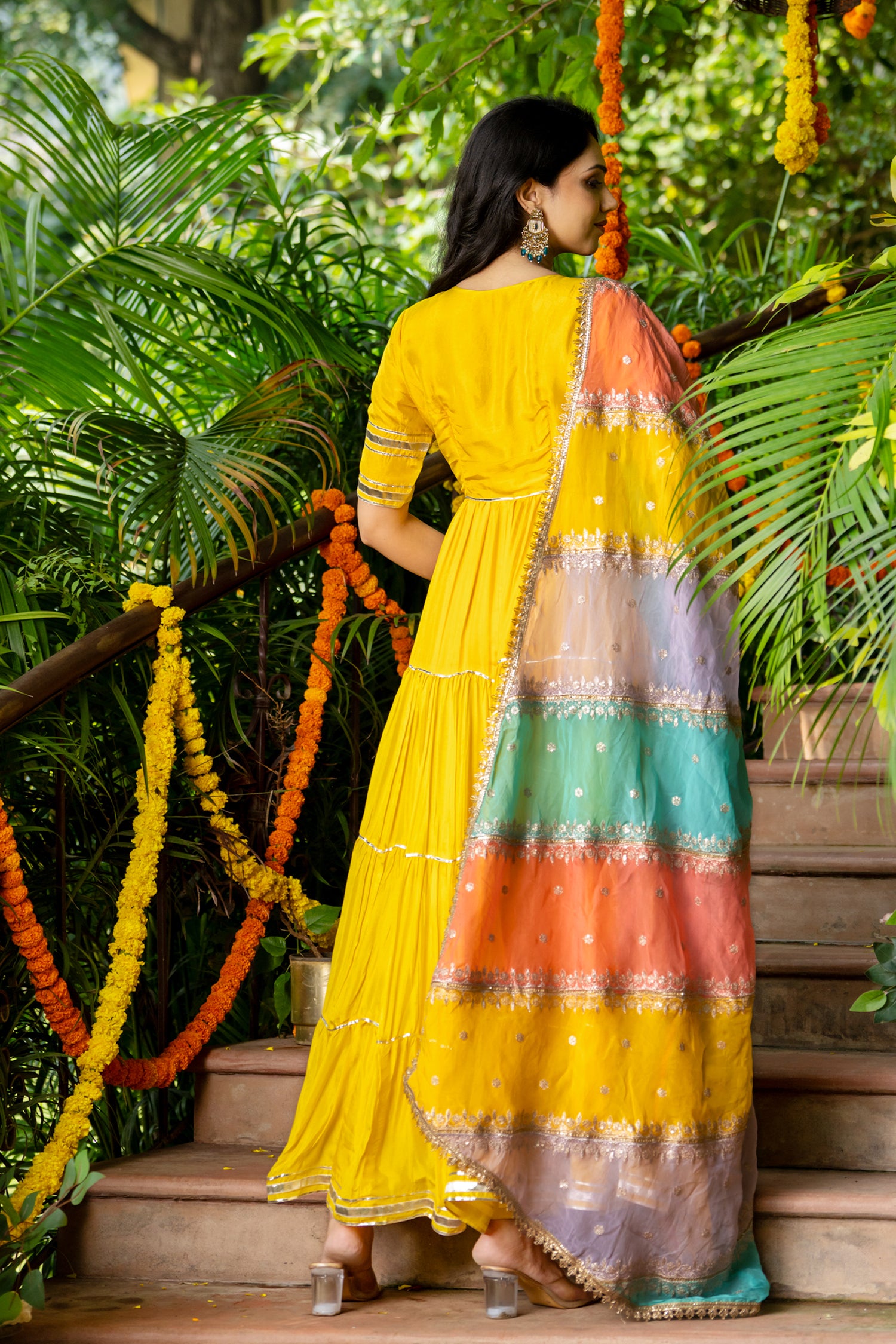 The lemon yellow uppada silk solid anarkali set with subtle gota lace work and matching bottom and an organza dupatta for an elegant traditional look with beautiful flare.
