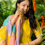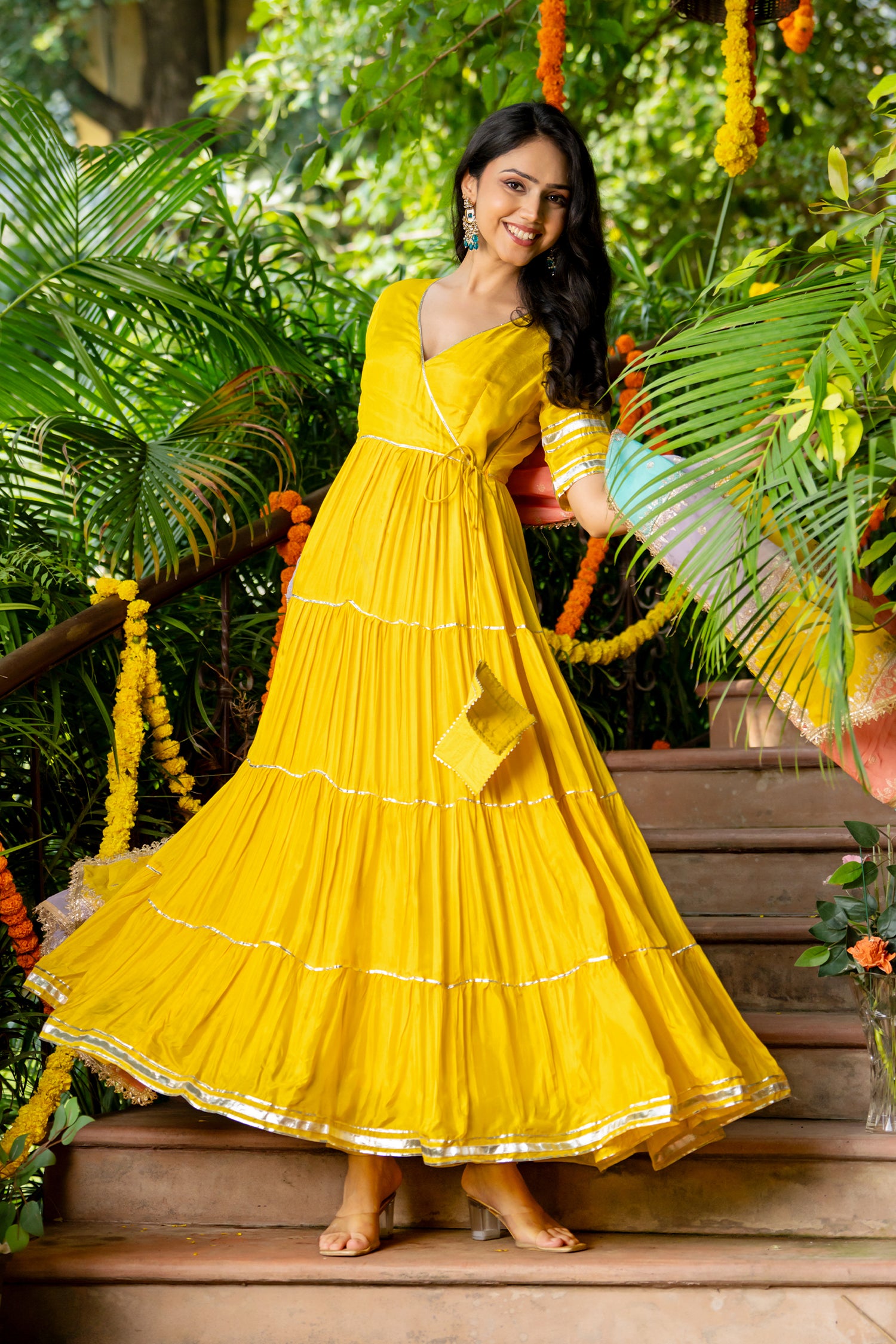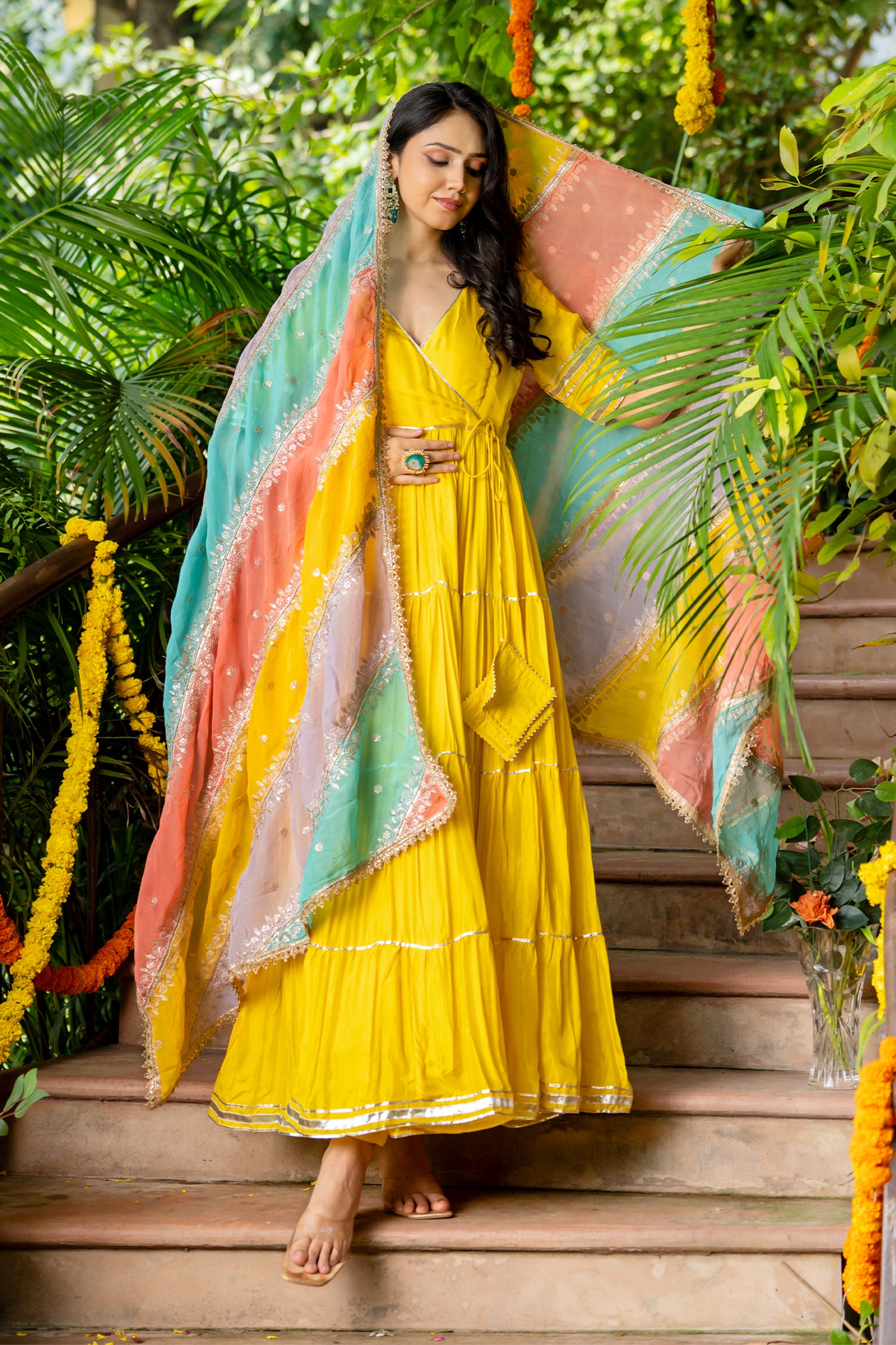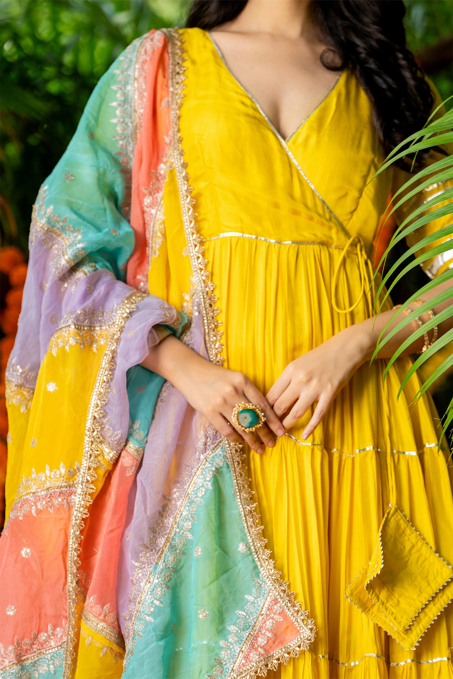 The lemon yellow uppada silk solid anarkali set with subtle gota lace work and matching bottom and an organza dupatta for an elegant traditional look with beautiful flare.