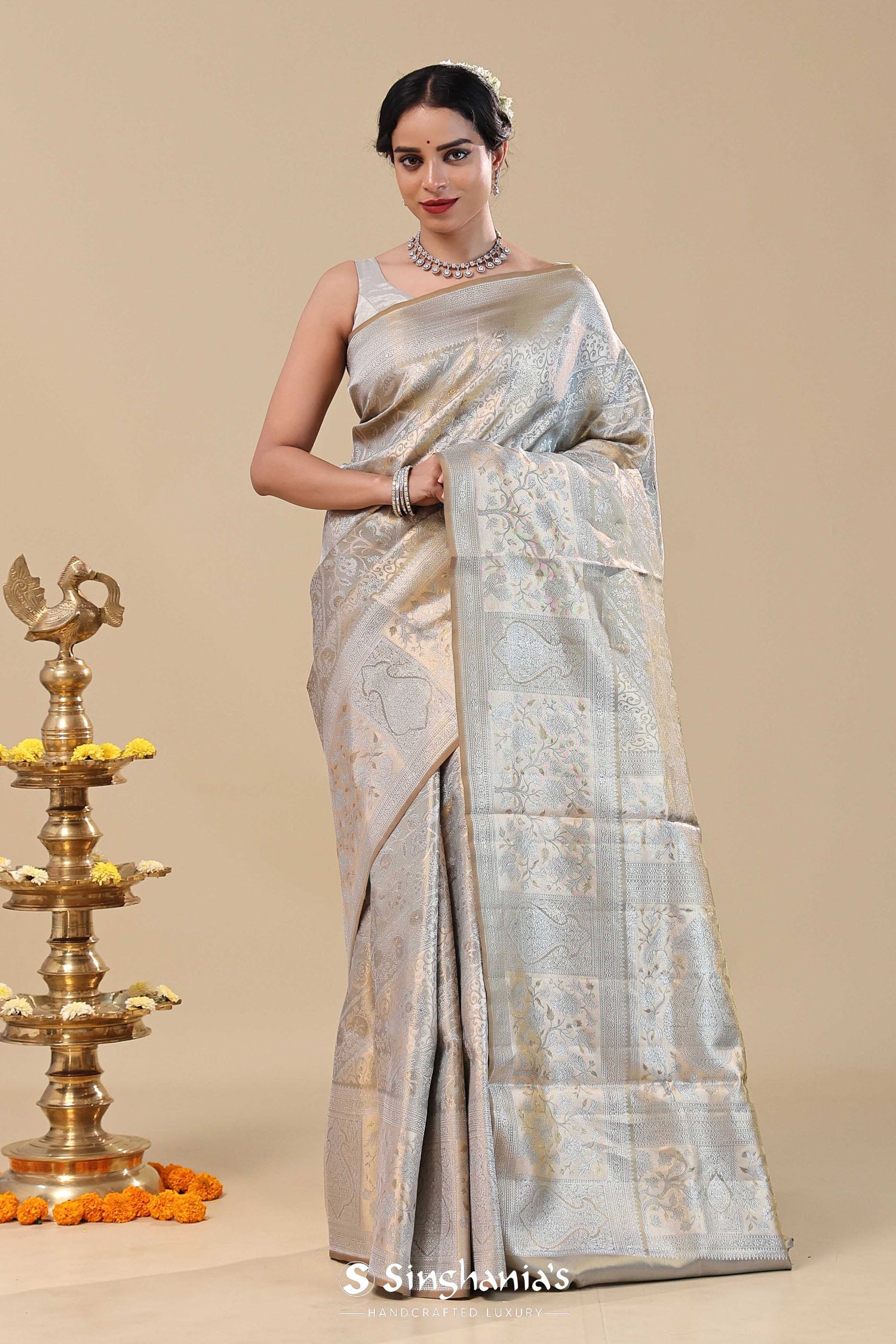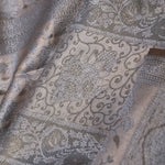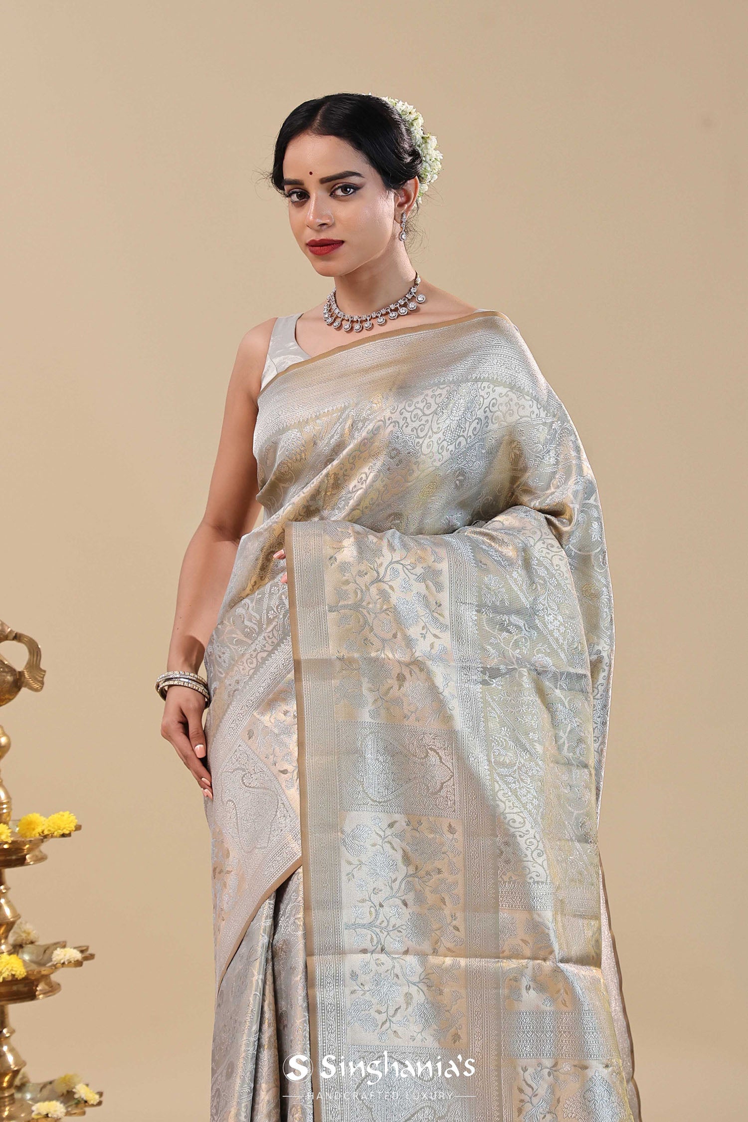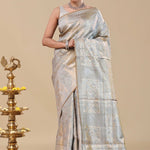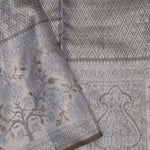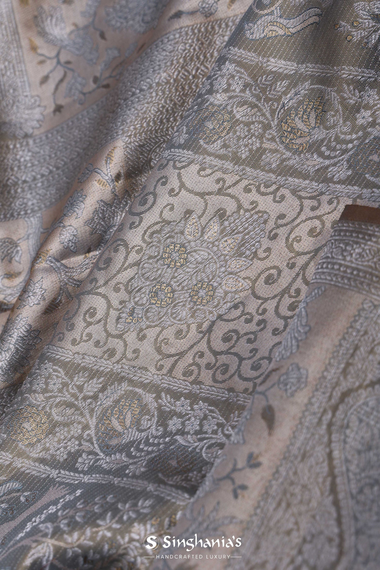 Light brown kanjivaram saree features woven design of creepers and motifs along with jungle themed border with arabesque pattern making it look elegant and traditional for any special occasions like festive and wedding