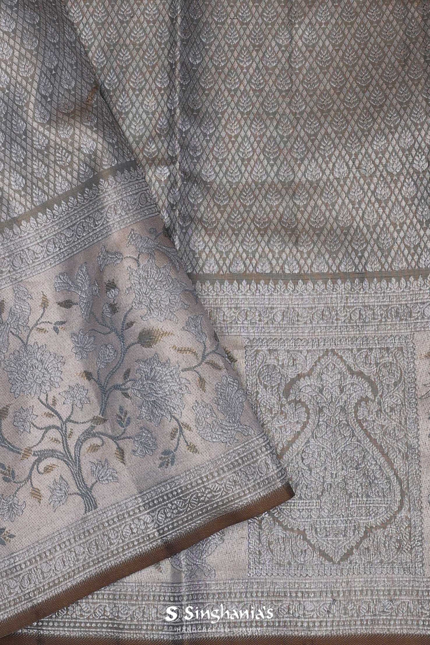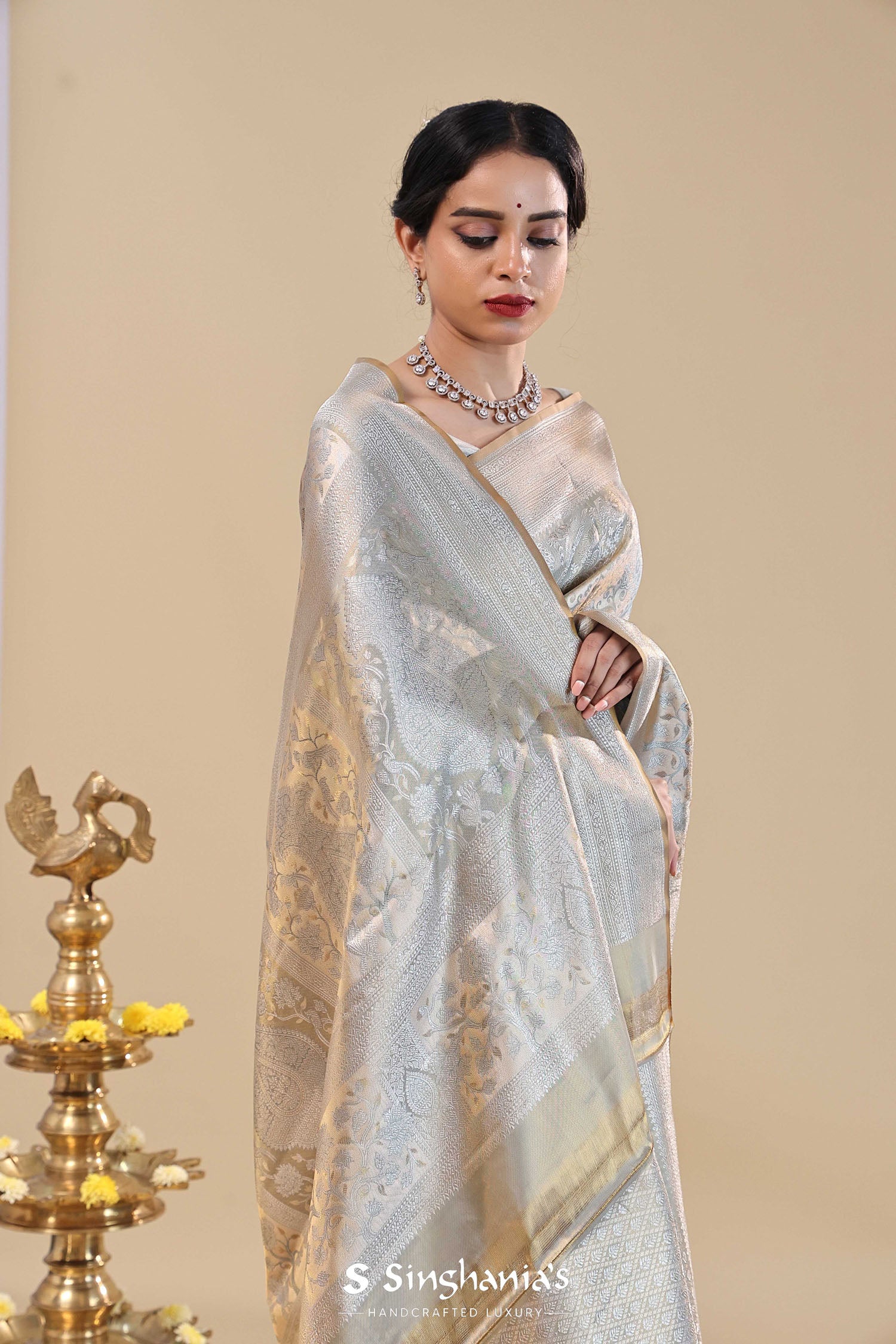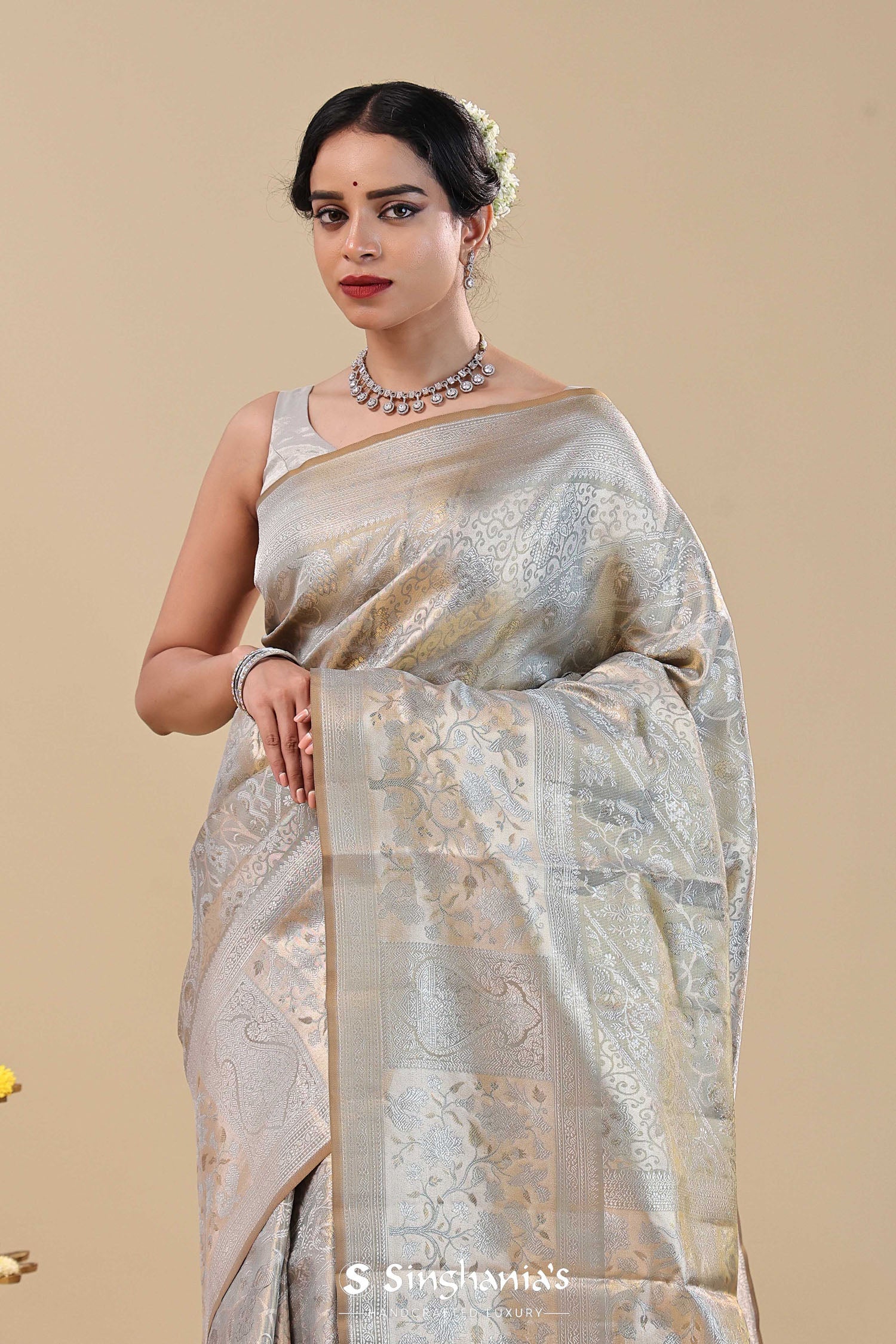 Light brown kanjivaram saree features woven design of creepers and motifs along with jungle themed border with arabesque pattern making it look elegant and traditional for any special occasions like festive and wedding