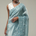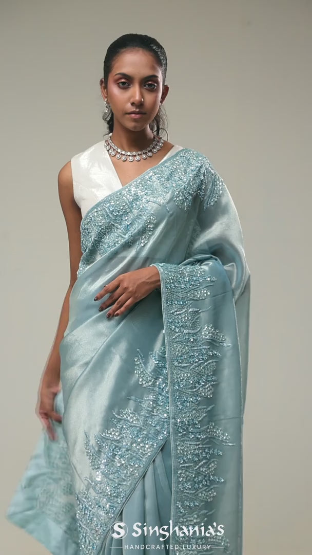 A soothing light turquoise tissue saree with a plain body. The pallu and border are embellished with a floral leaf pattern in sequins and glass beads embroidery, which accentuates the whole look. Suitable for festive wear and wedding parties.