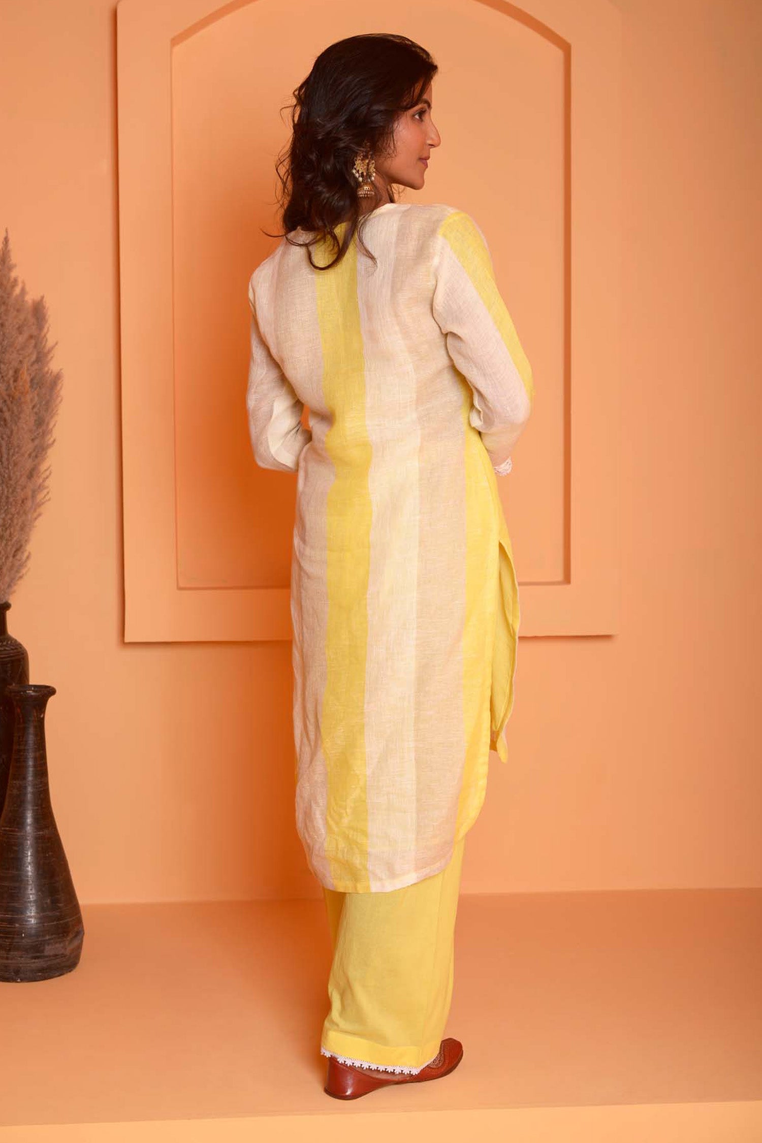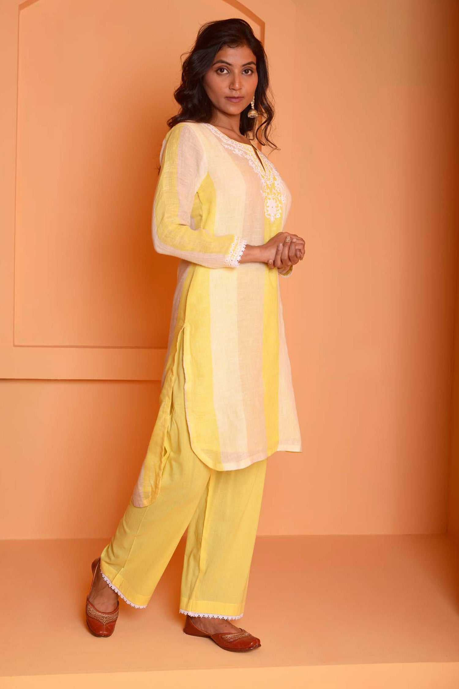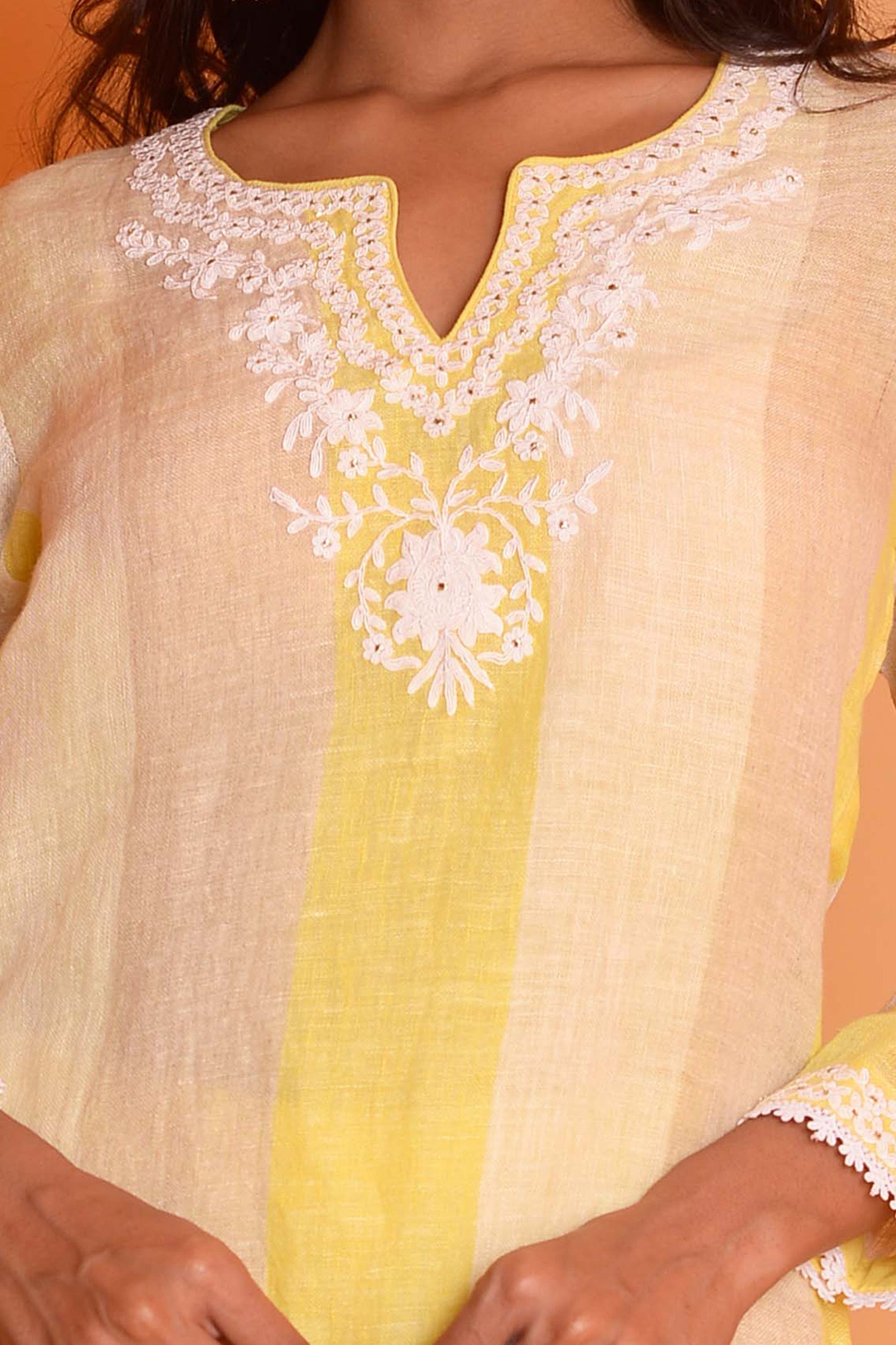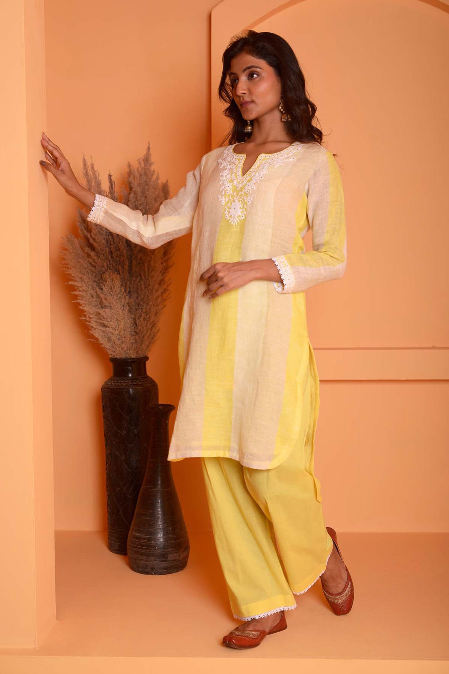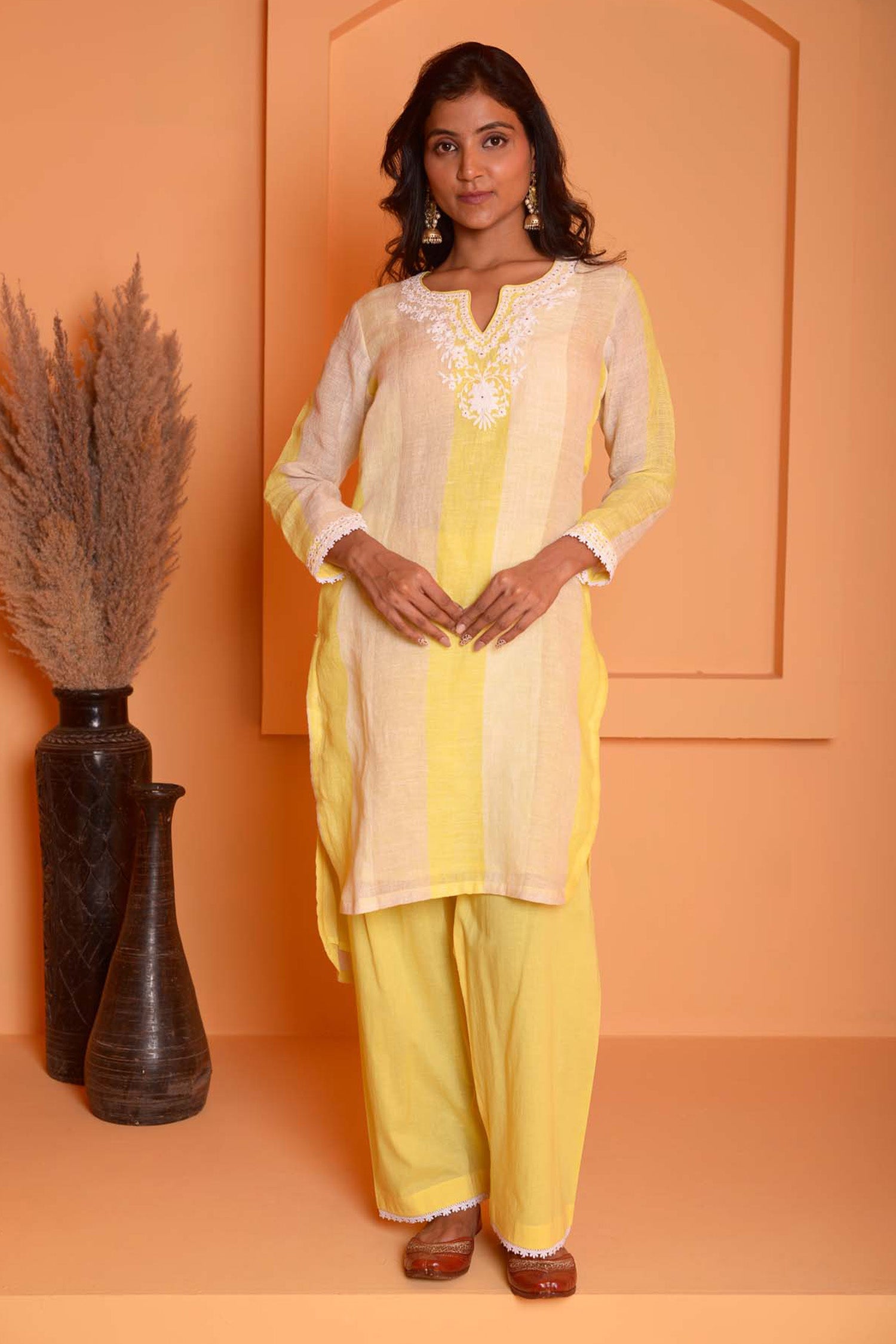 Light Yellow Linen Embroidery Kurta Set With Pant