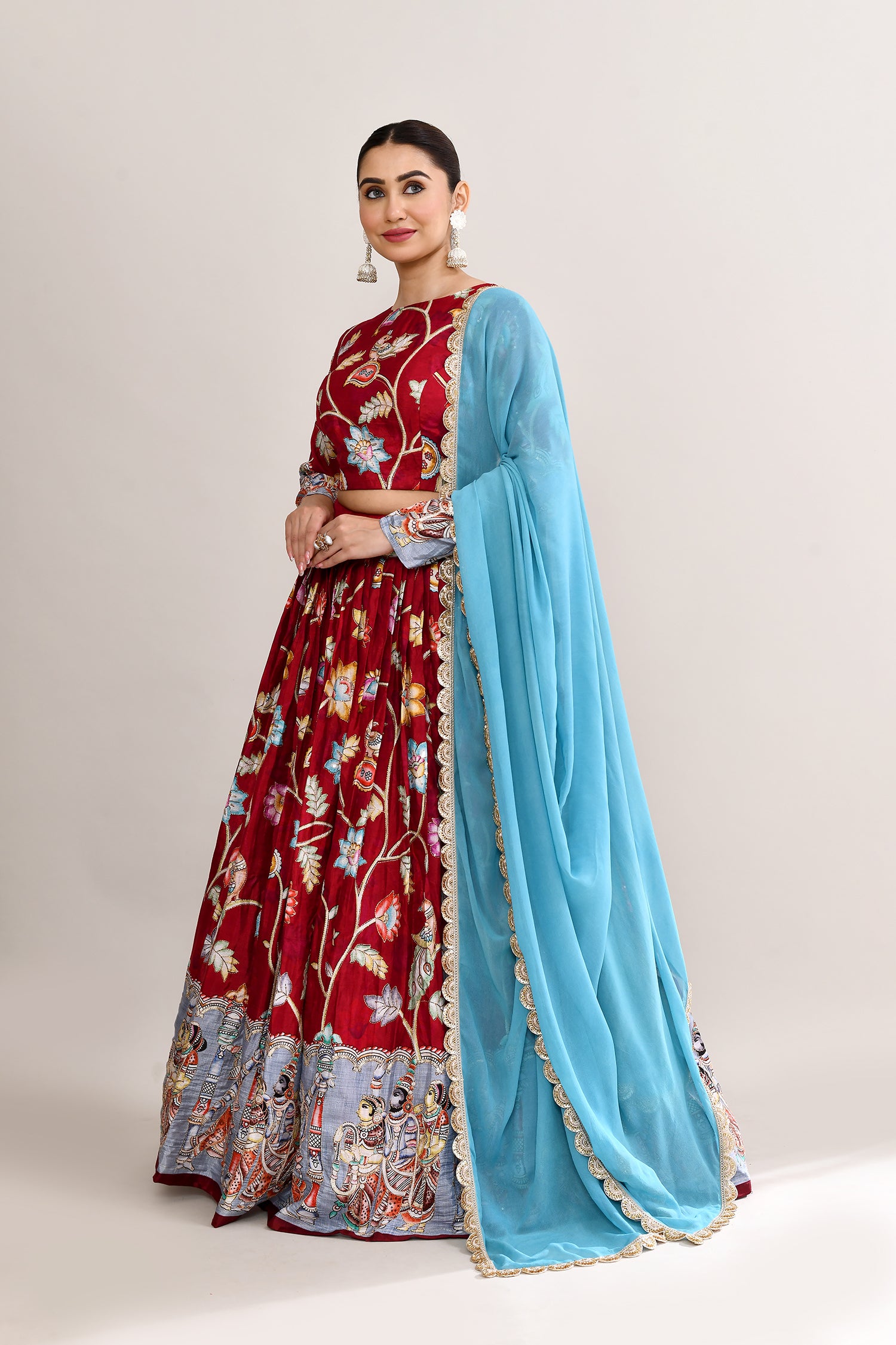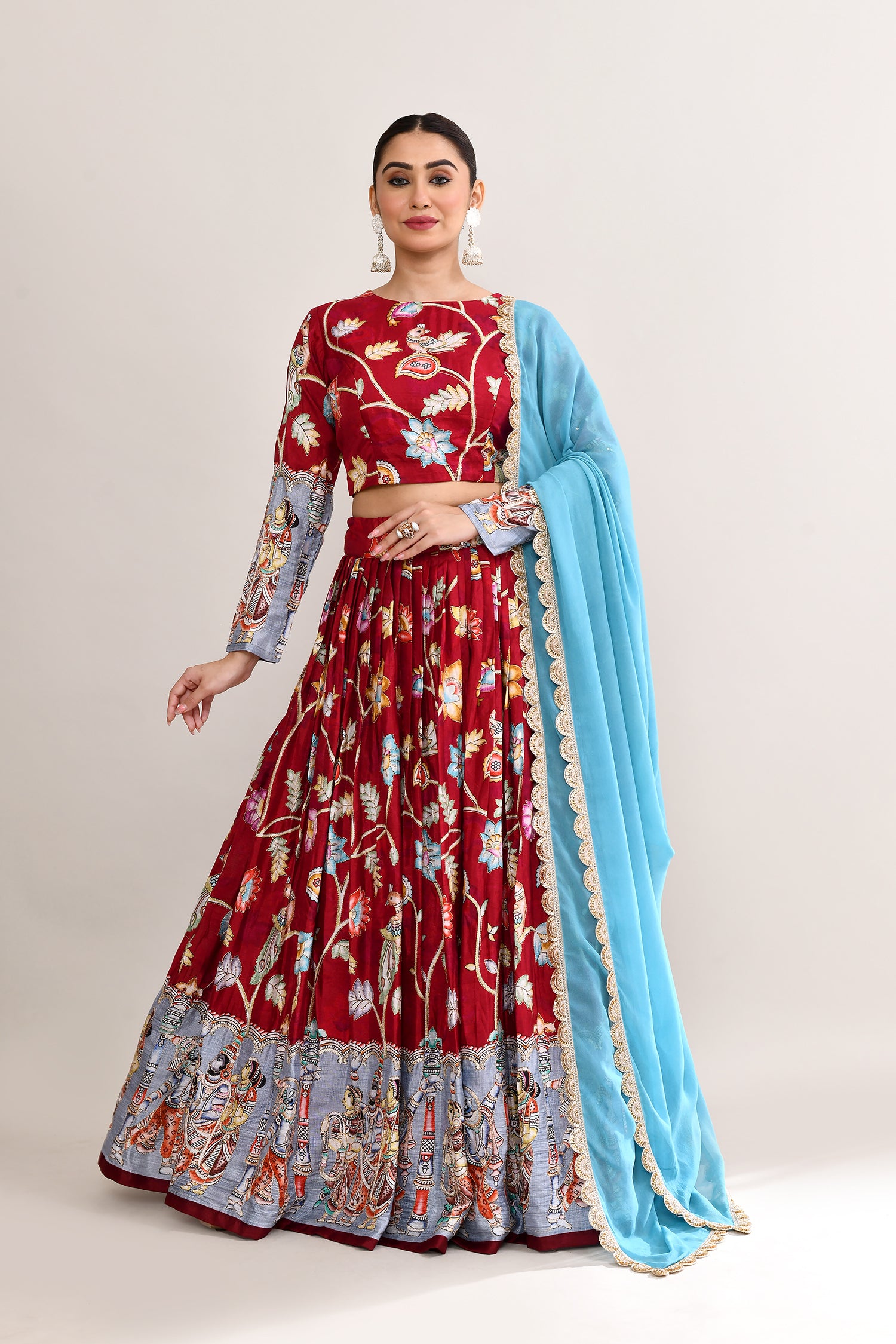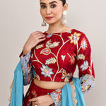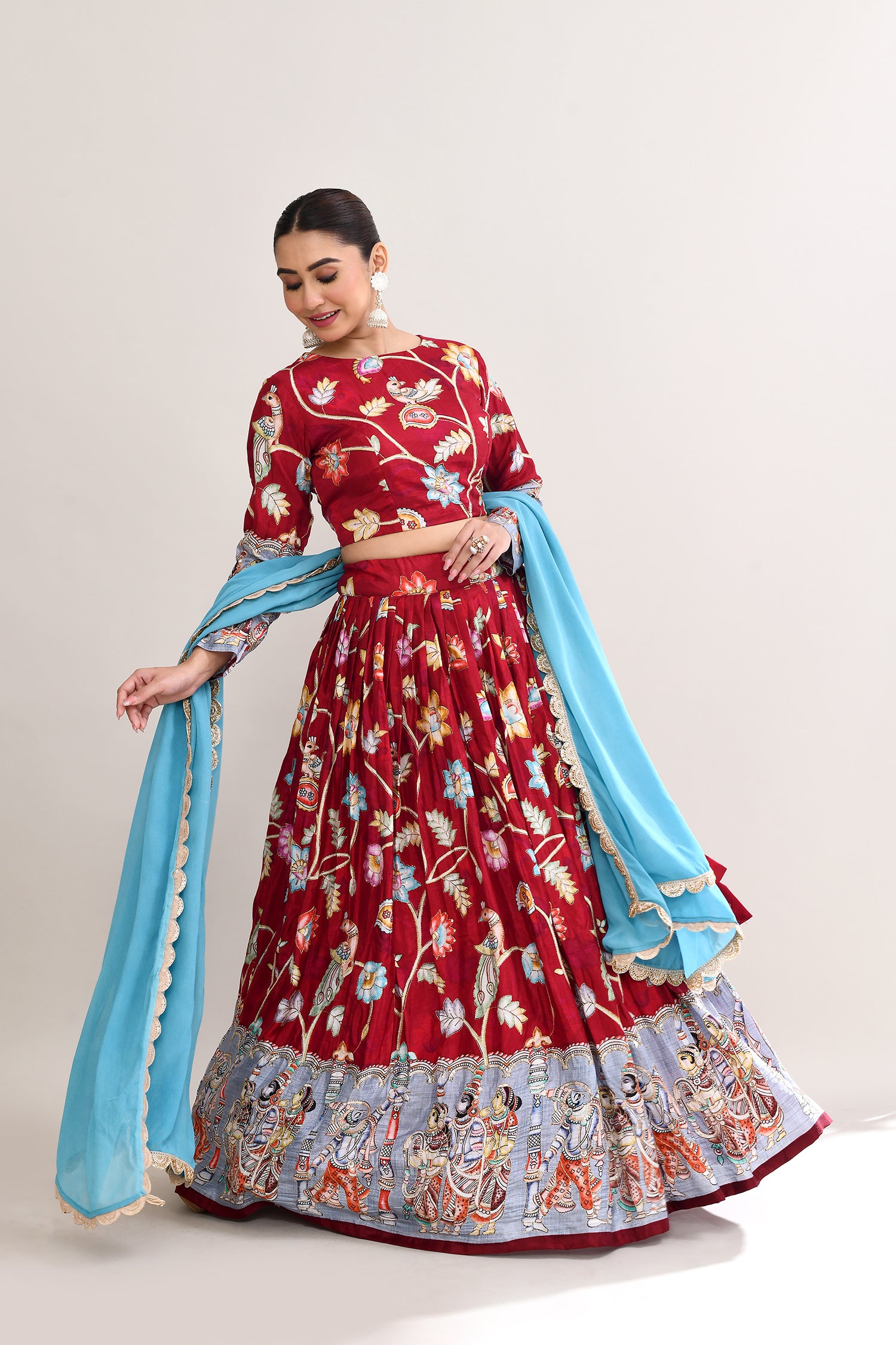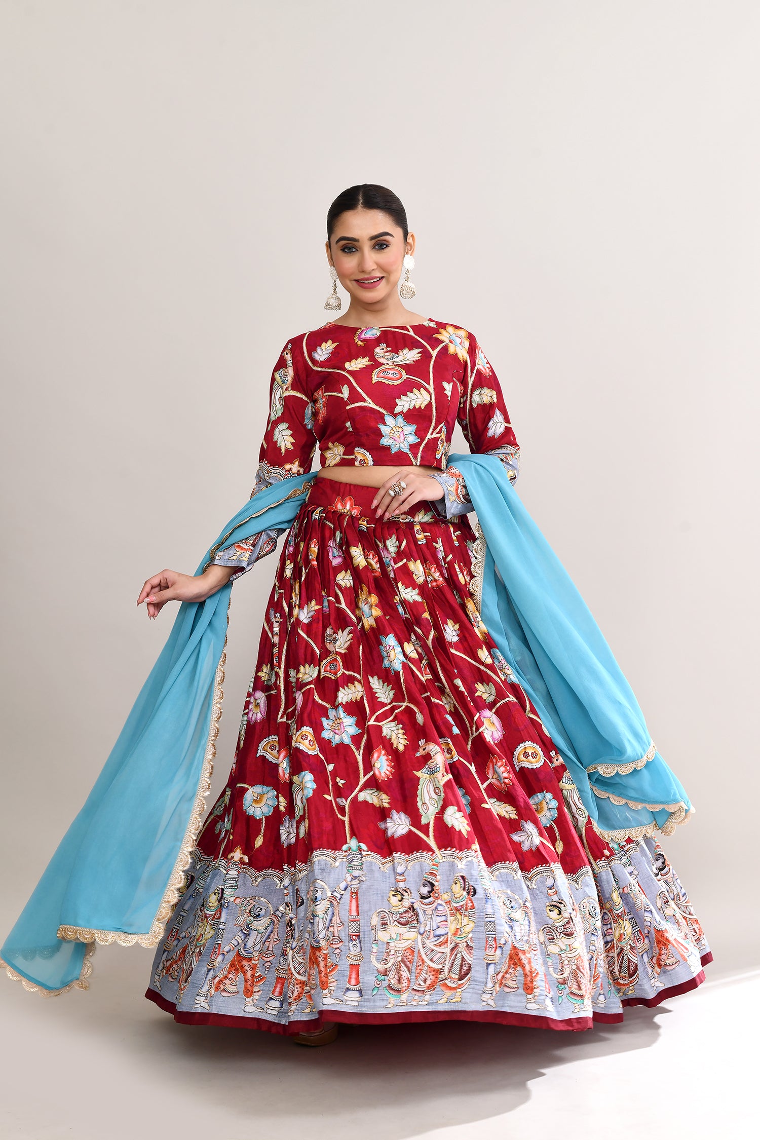 The maroon raw silk lehenga set with kalamkari floral and bird print with silver zari work and a georgette dupatta for a gorgeous look.