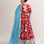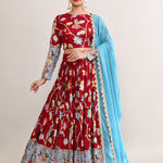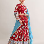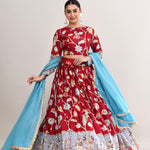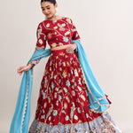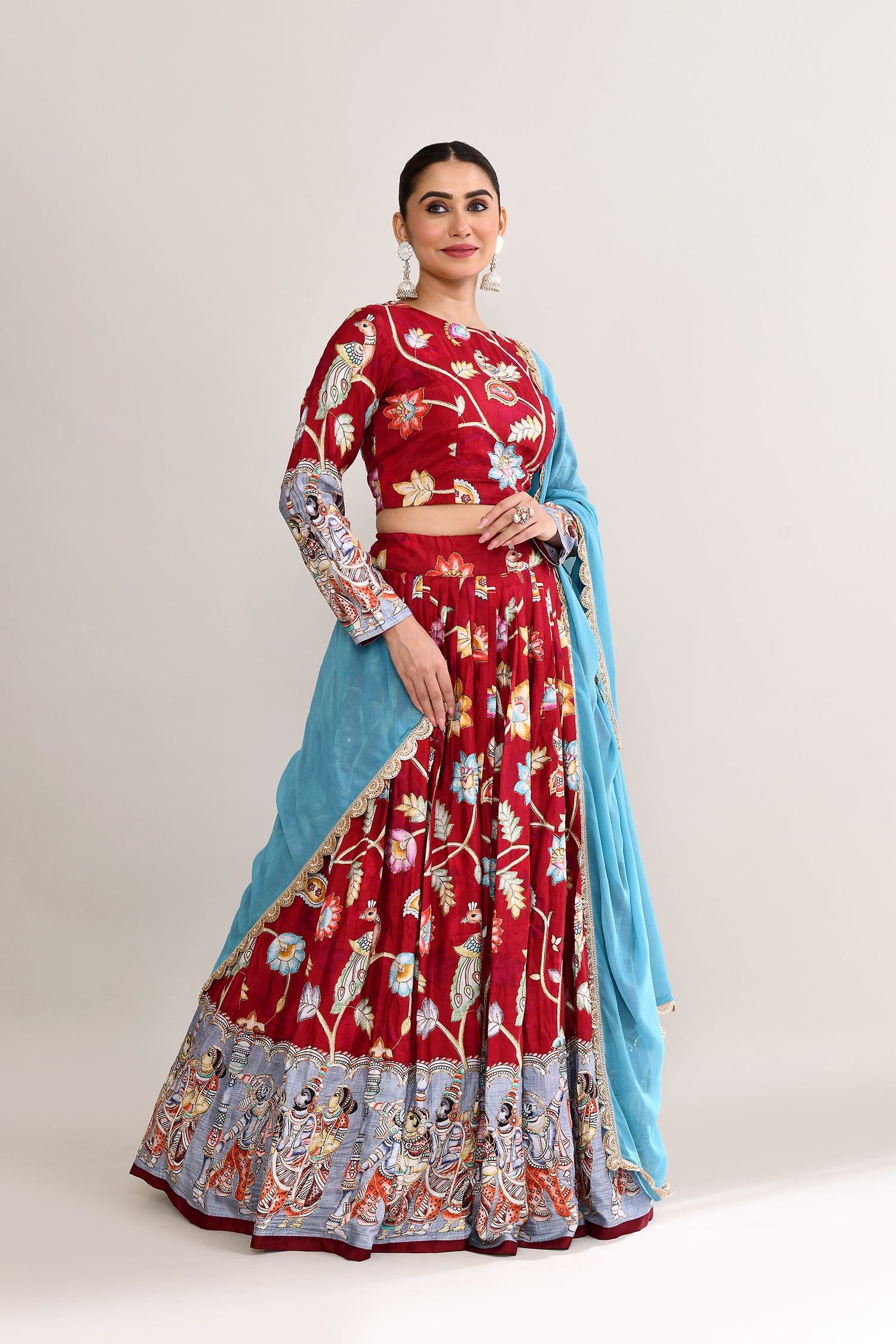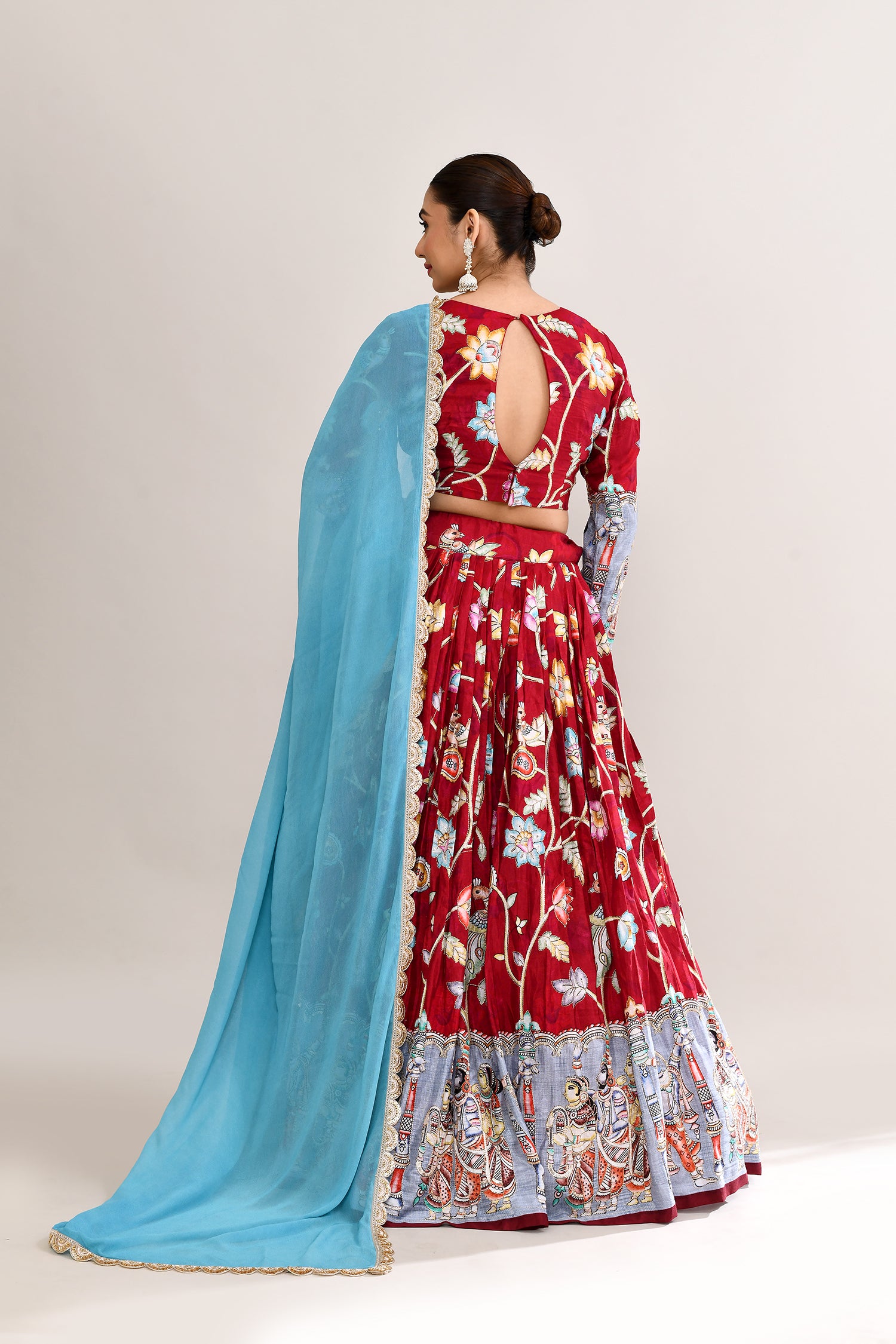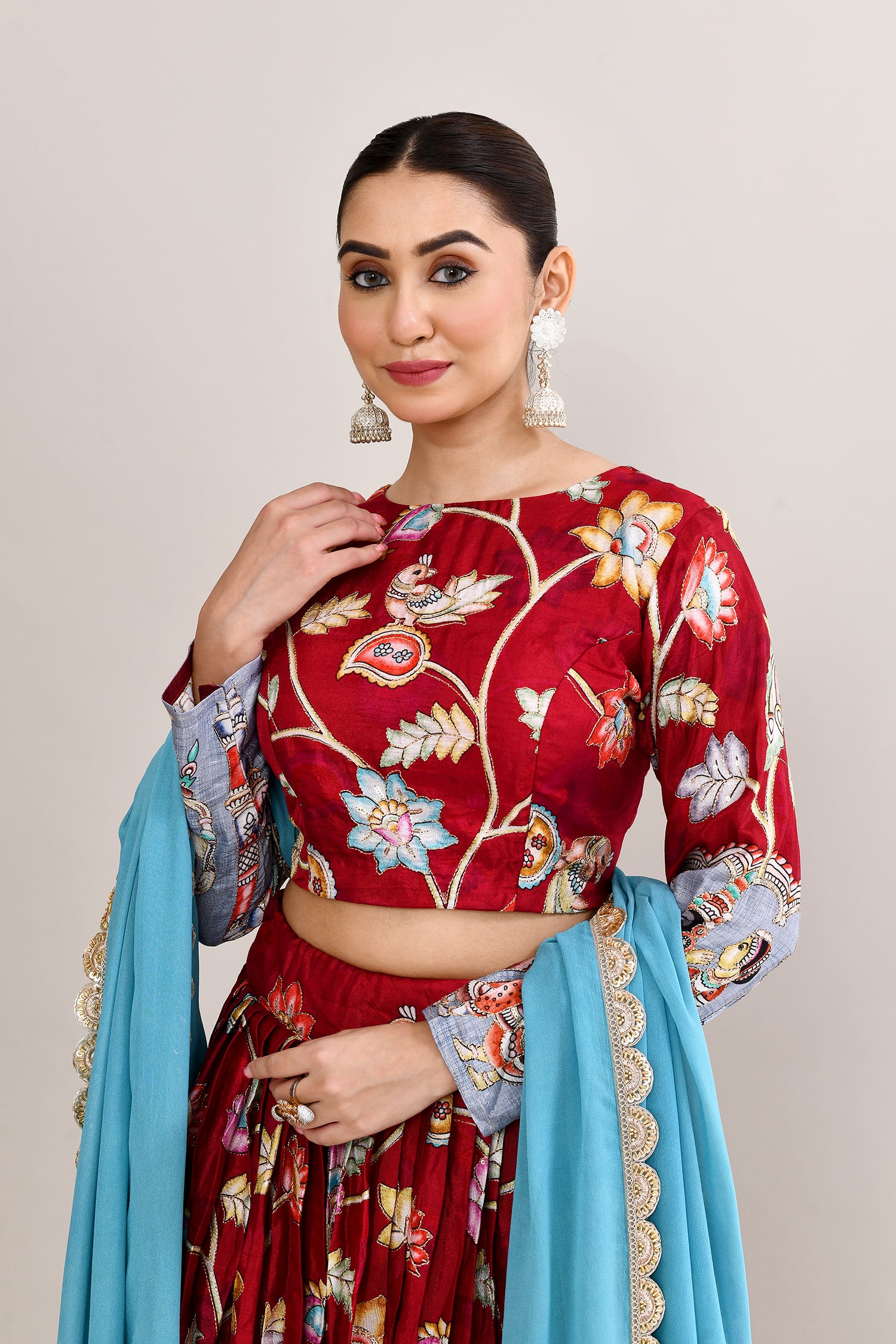 The maroon raw silk lehenga set with kalamkari floral and bird print with silver zari work and a georgette dupatta for a gorgeous look.