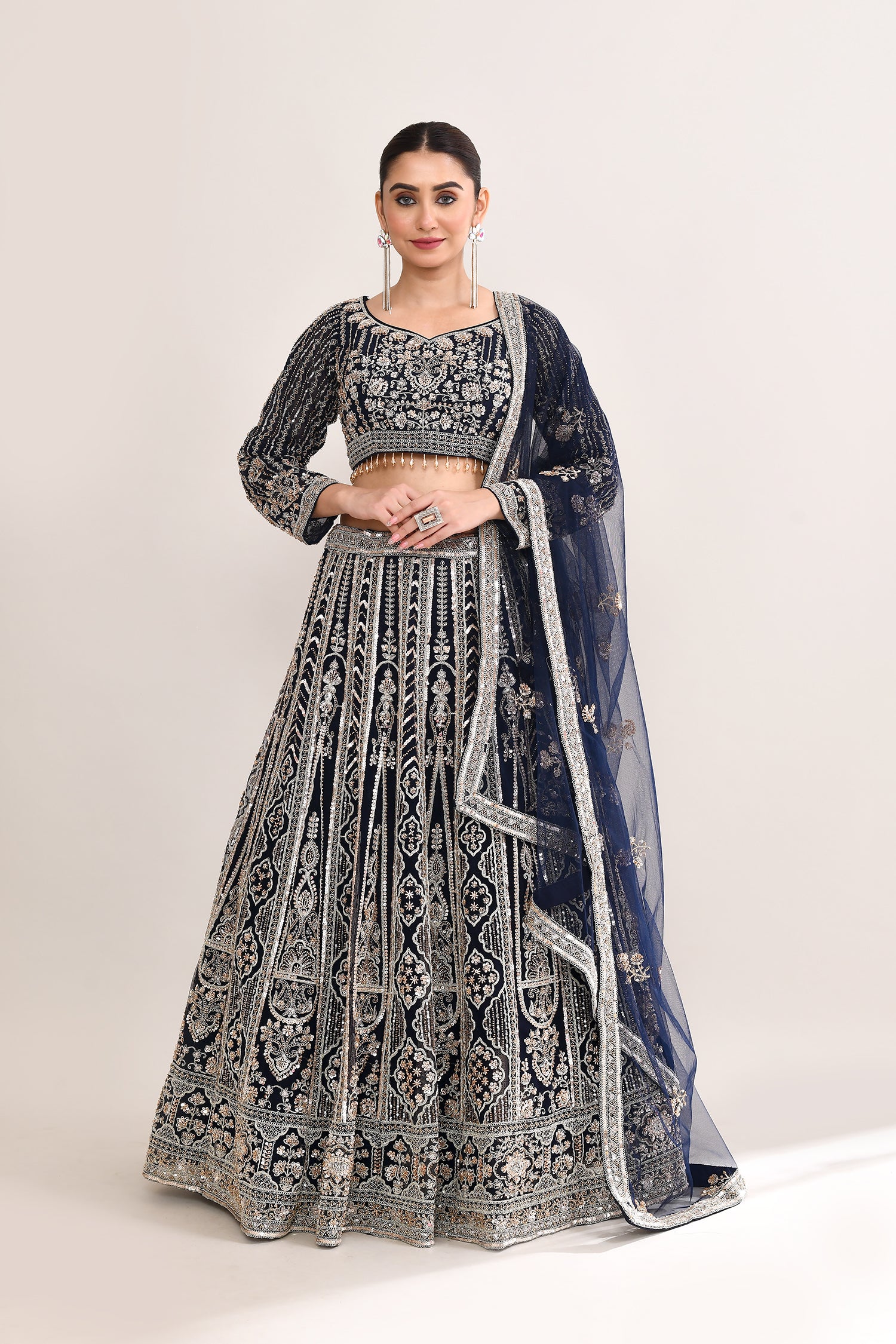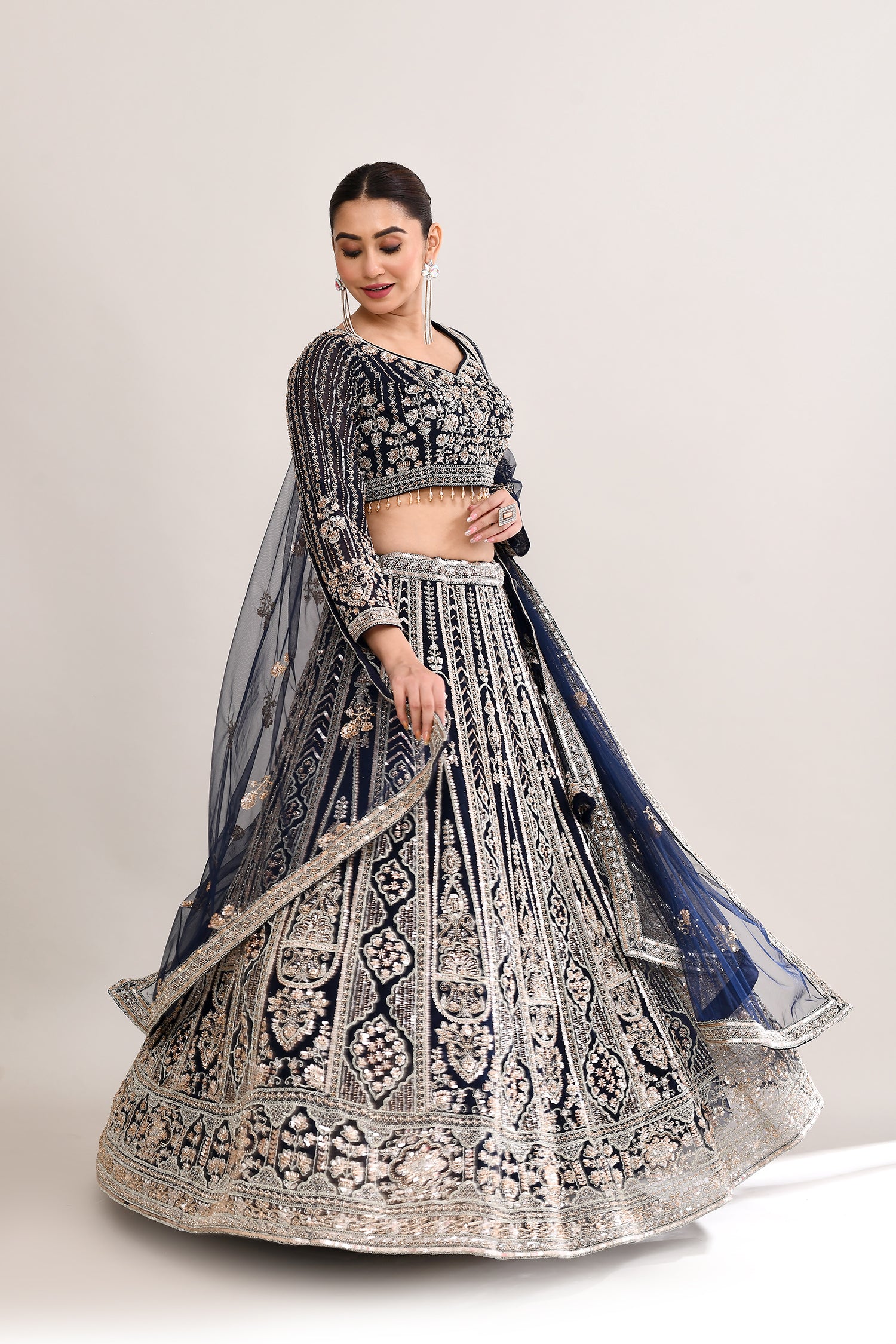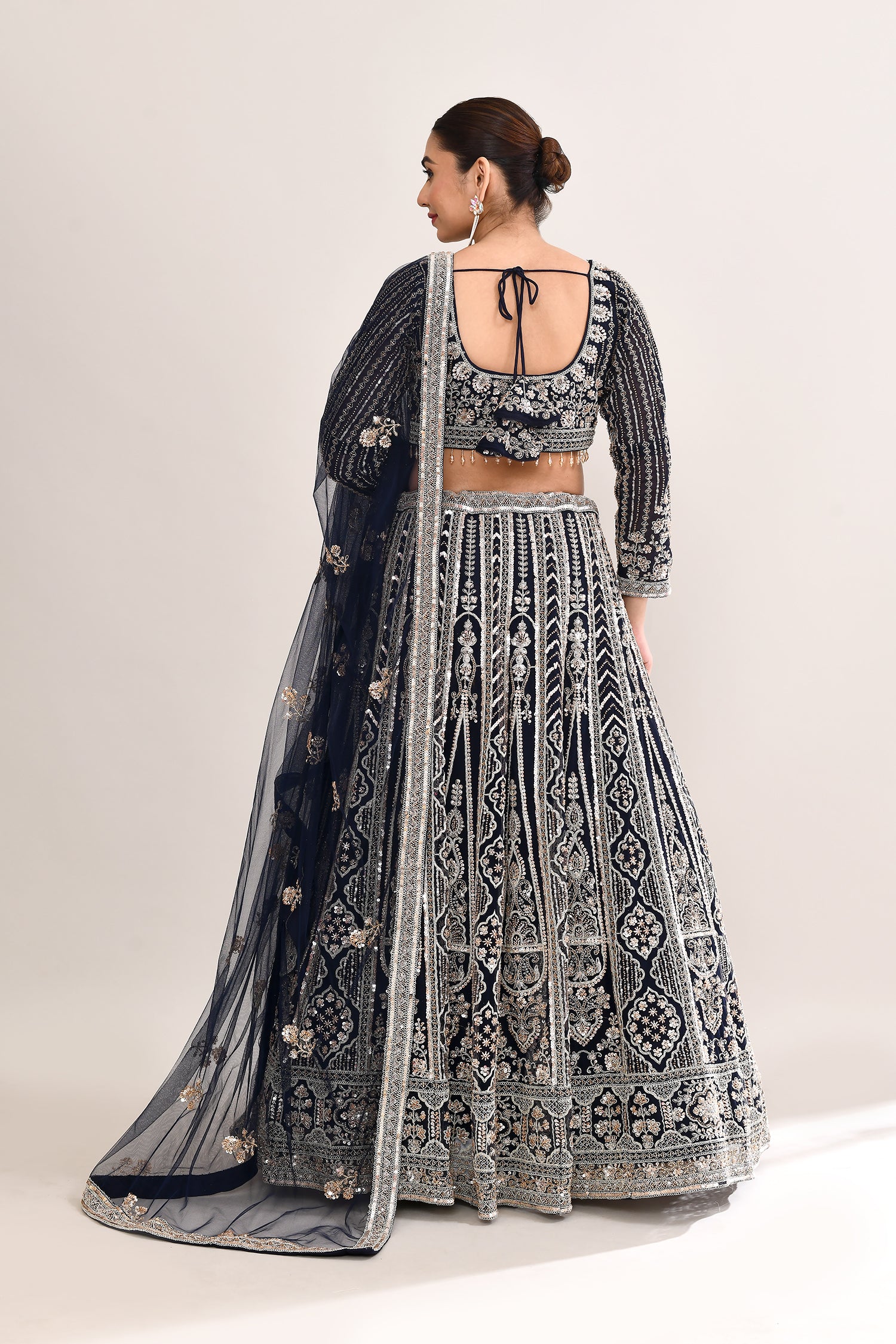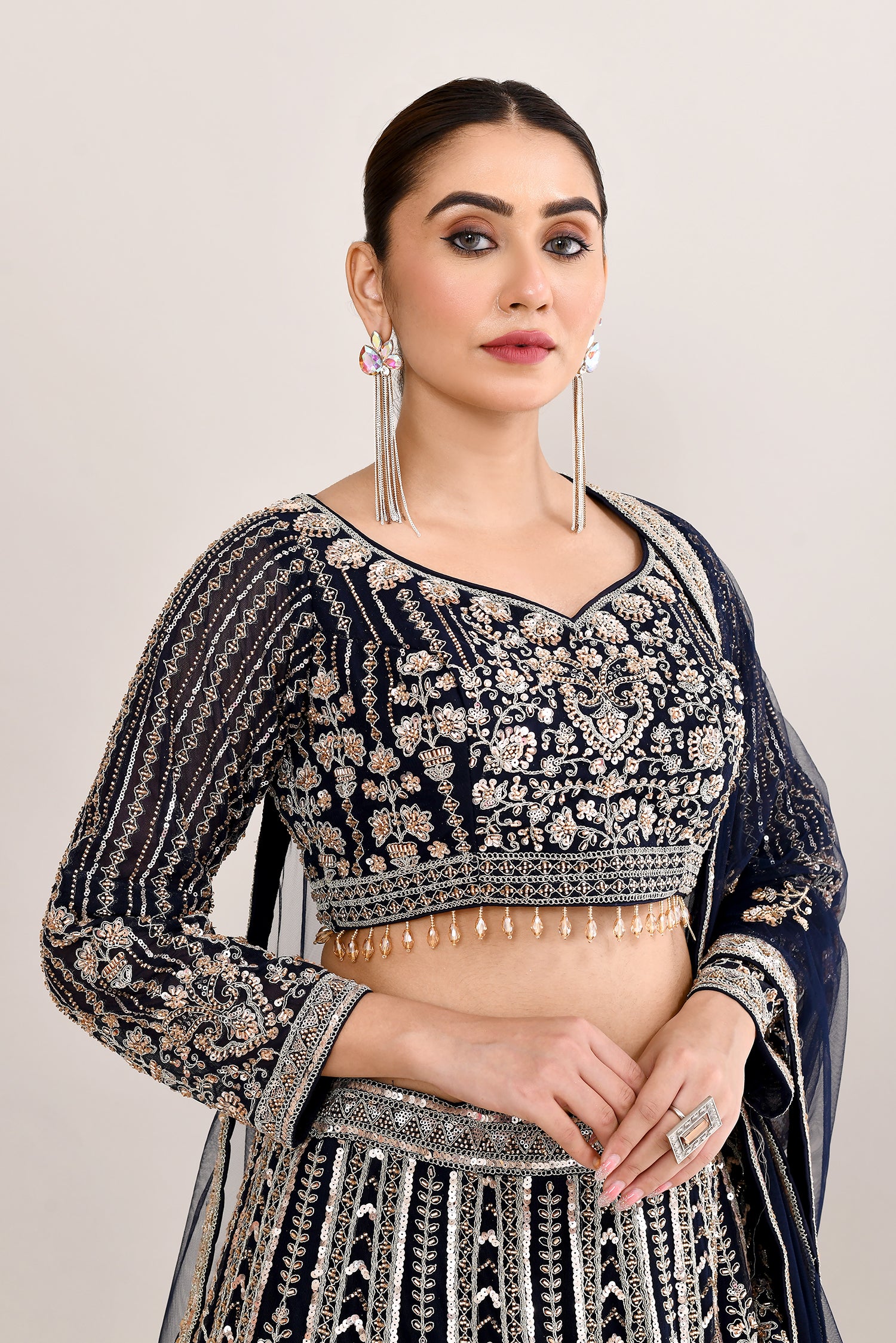 The midnight blue net lehenga set with hand work sequin and cutdana embroidery for a stunning look with grace.
