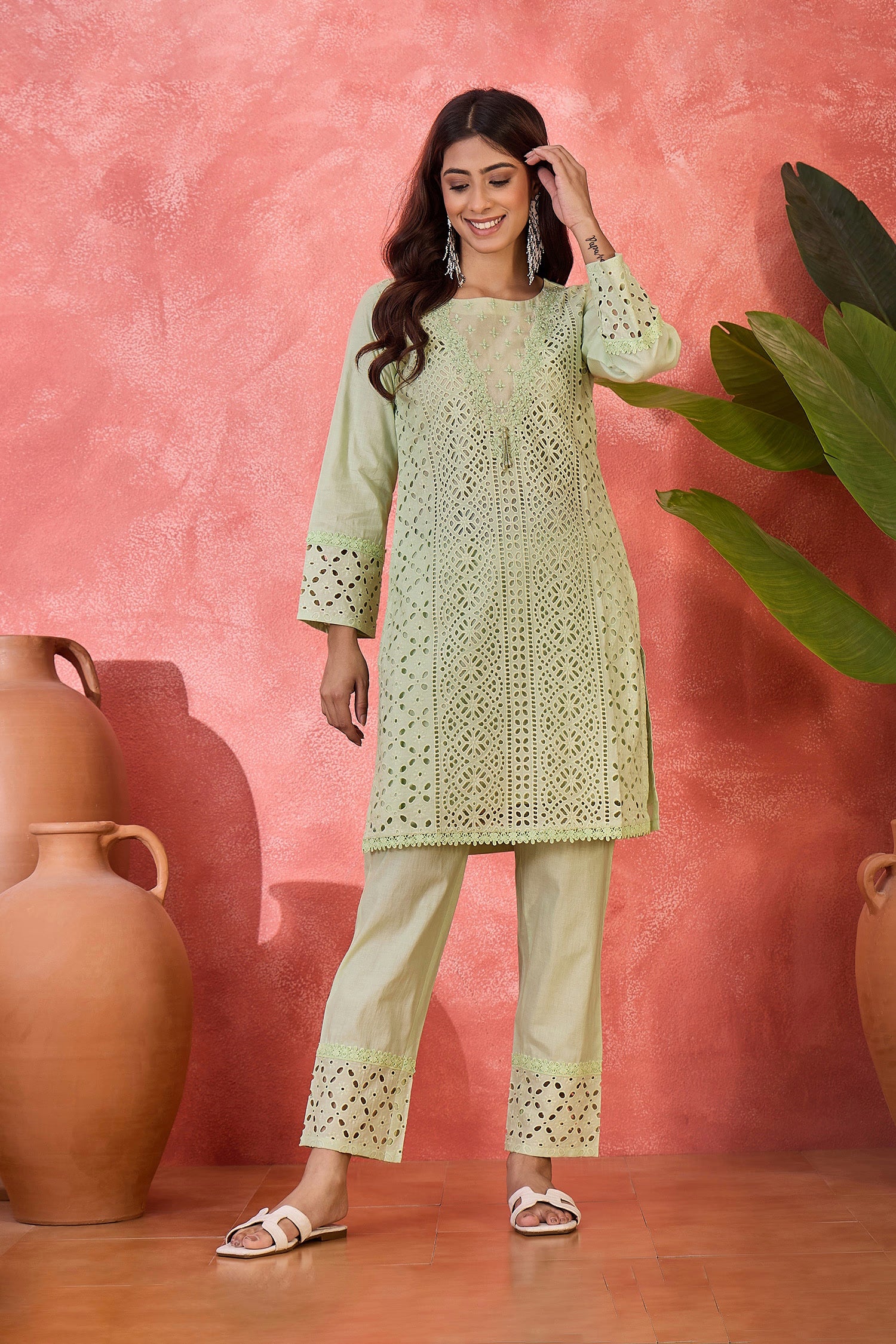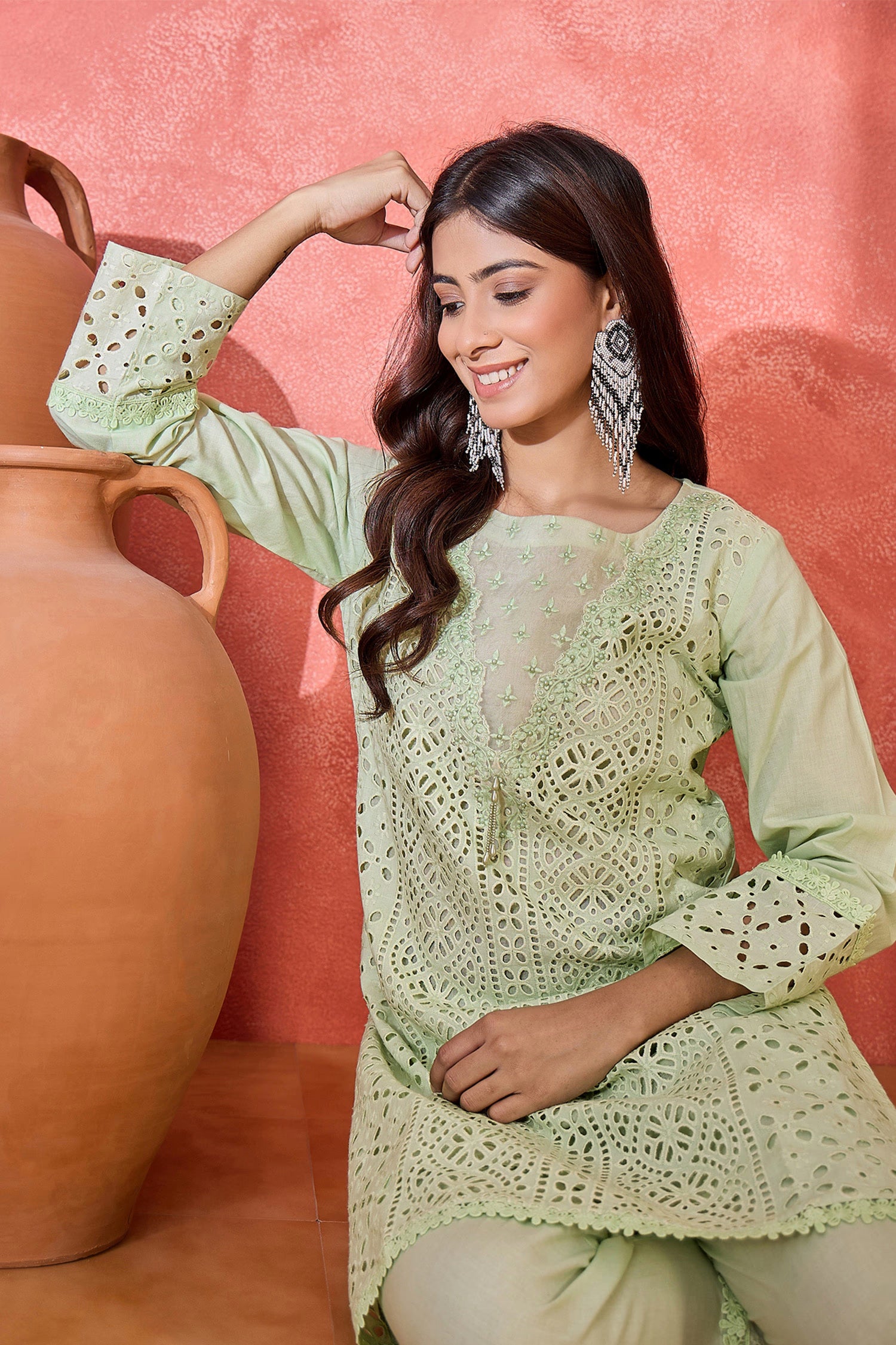 The mint green cotton hakoba and thread work short kurta with floral design and matching pant that blends ethnic look with the modern fashion.