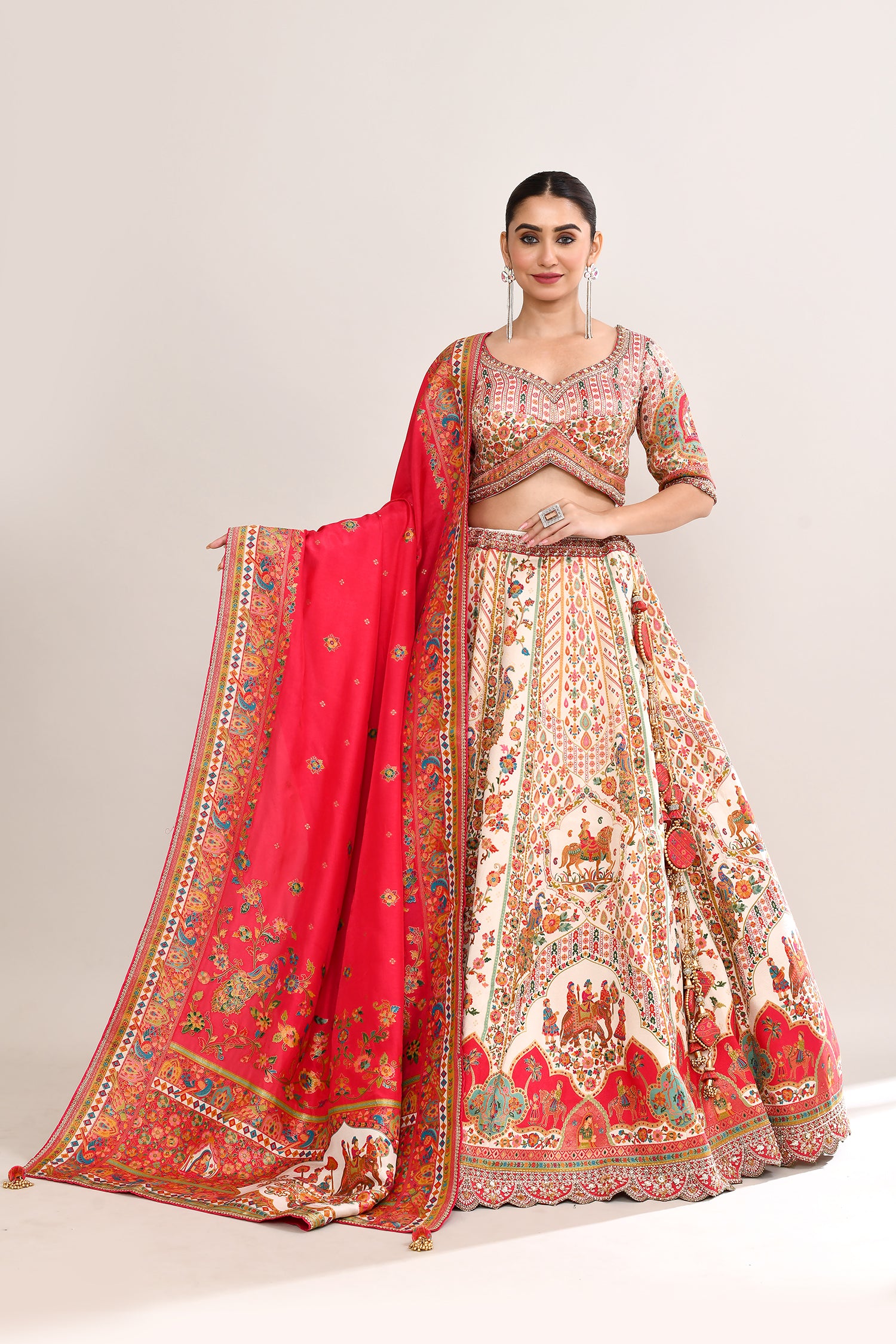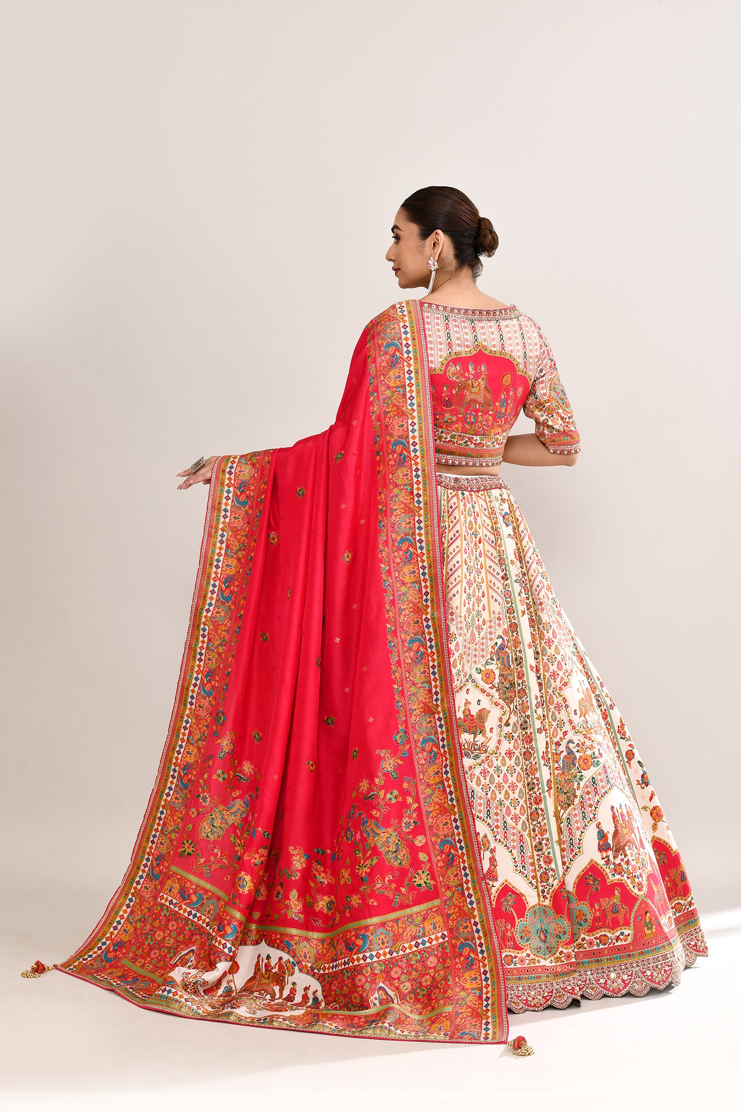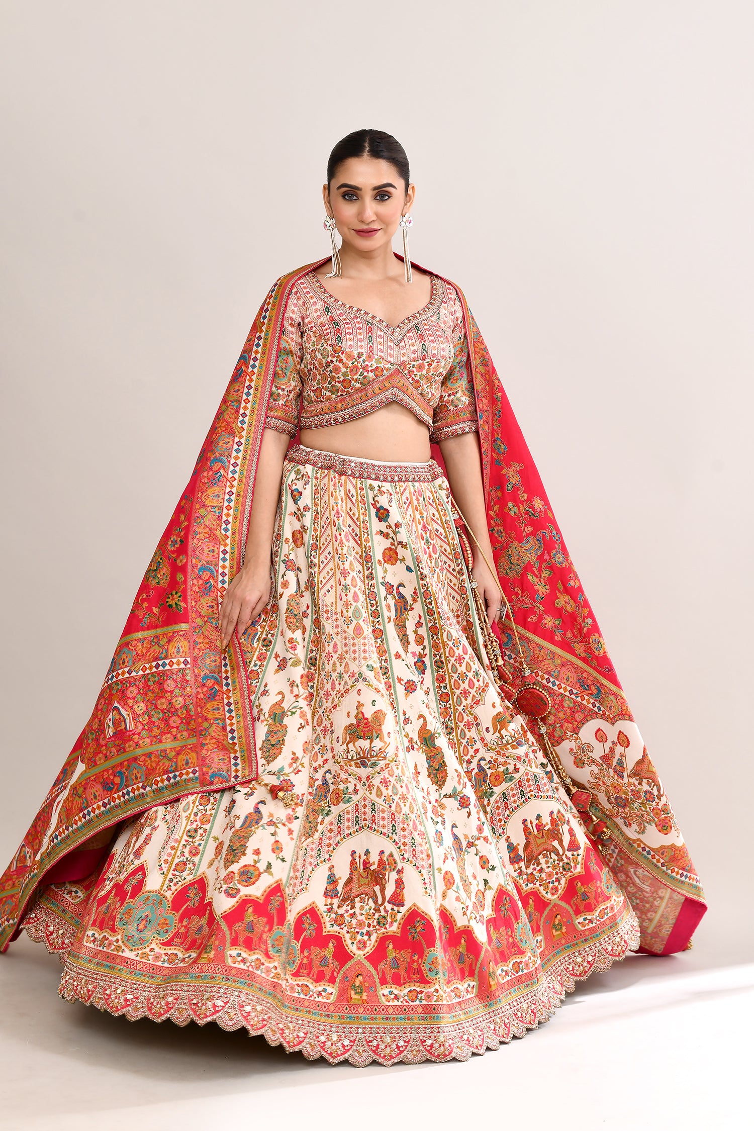 The multicolour white banaras silk printed lehenga set with subtle embroidery and a bright red dupatta for an amazing look with elegance.