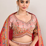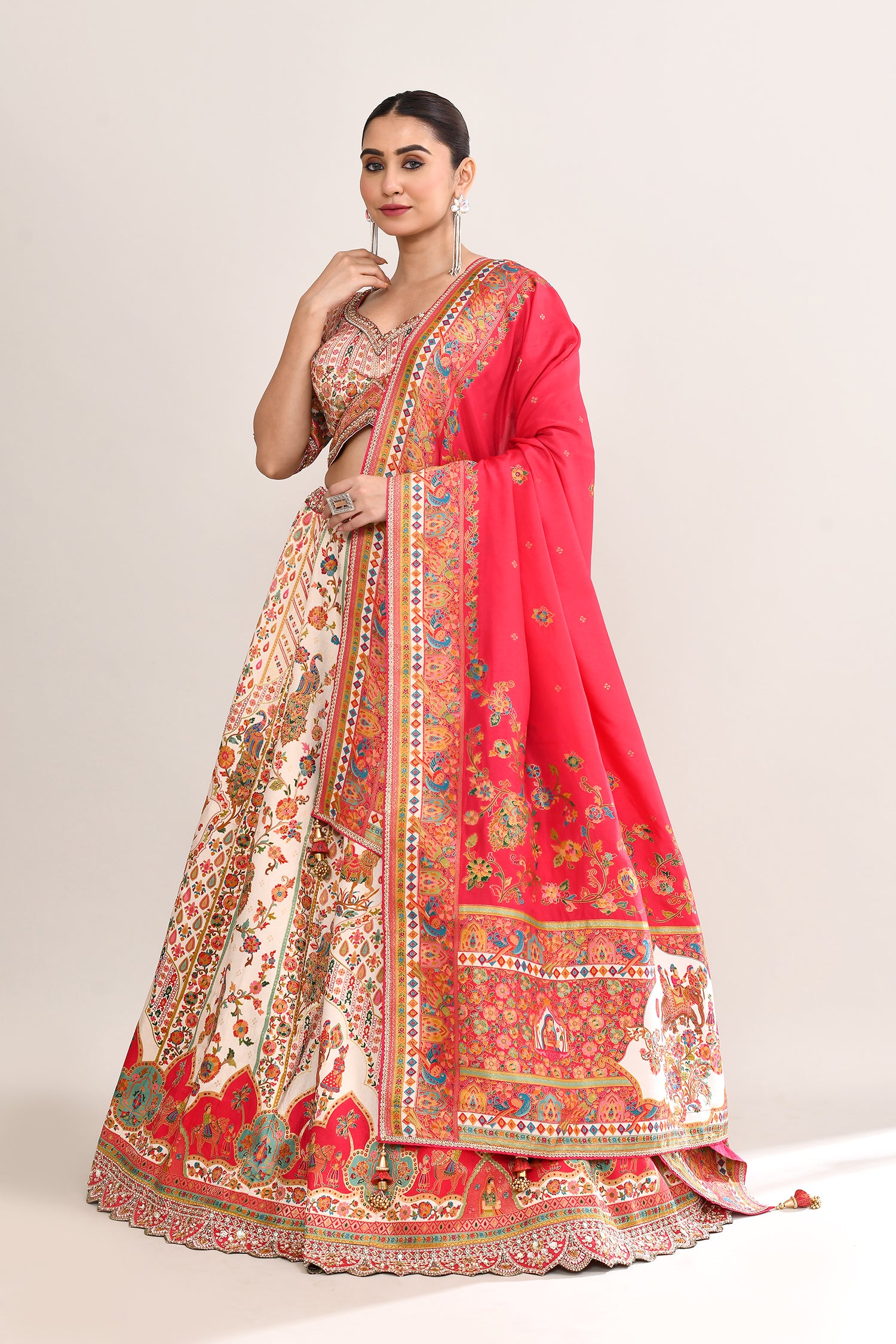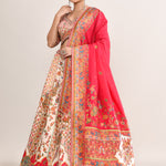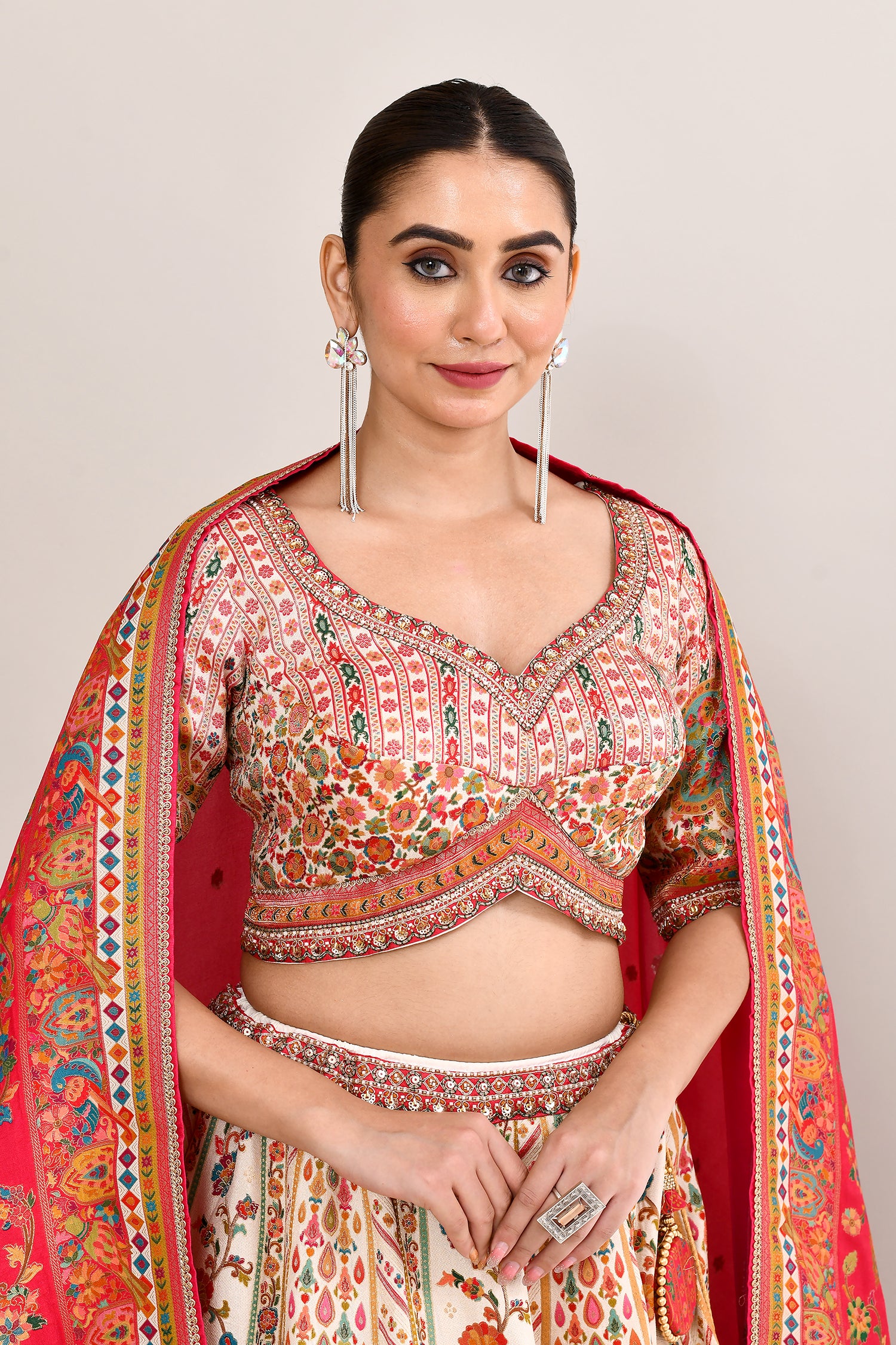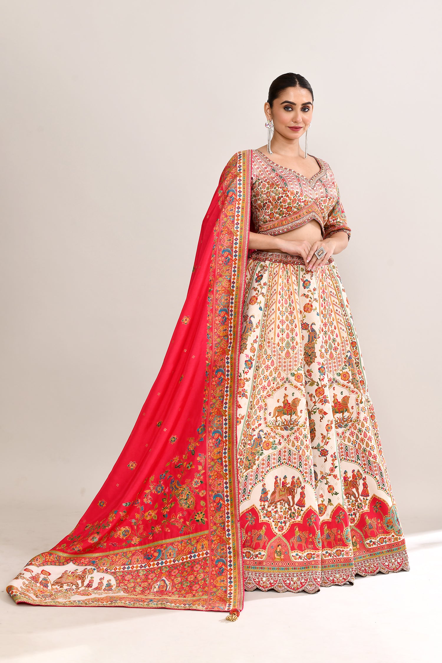 The multicolour white banaras silk printed lehenga set with subtle embroidery and a bright red dupatta for an amazing look with elegance.