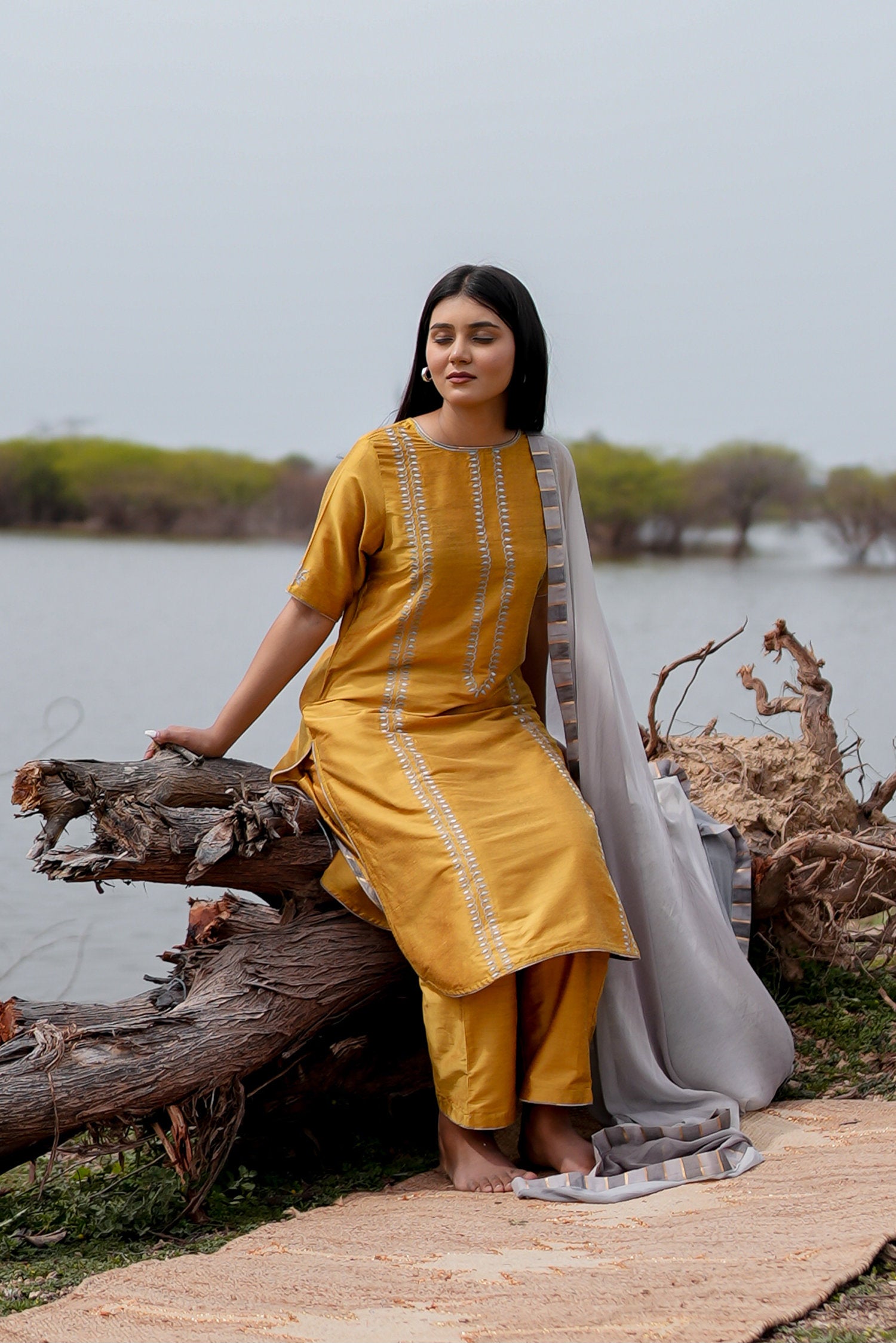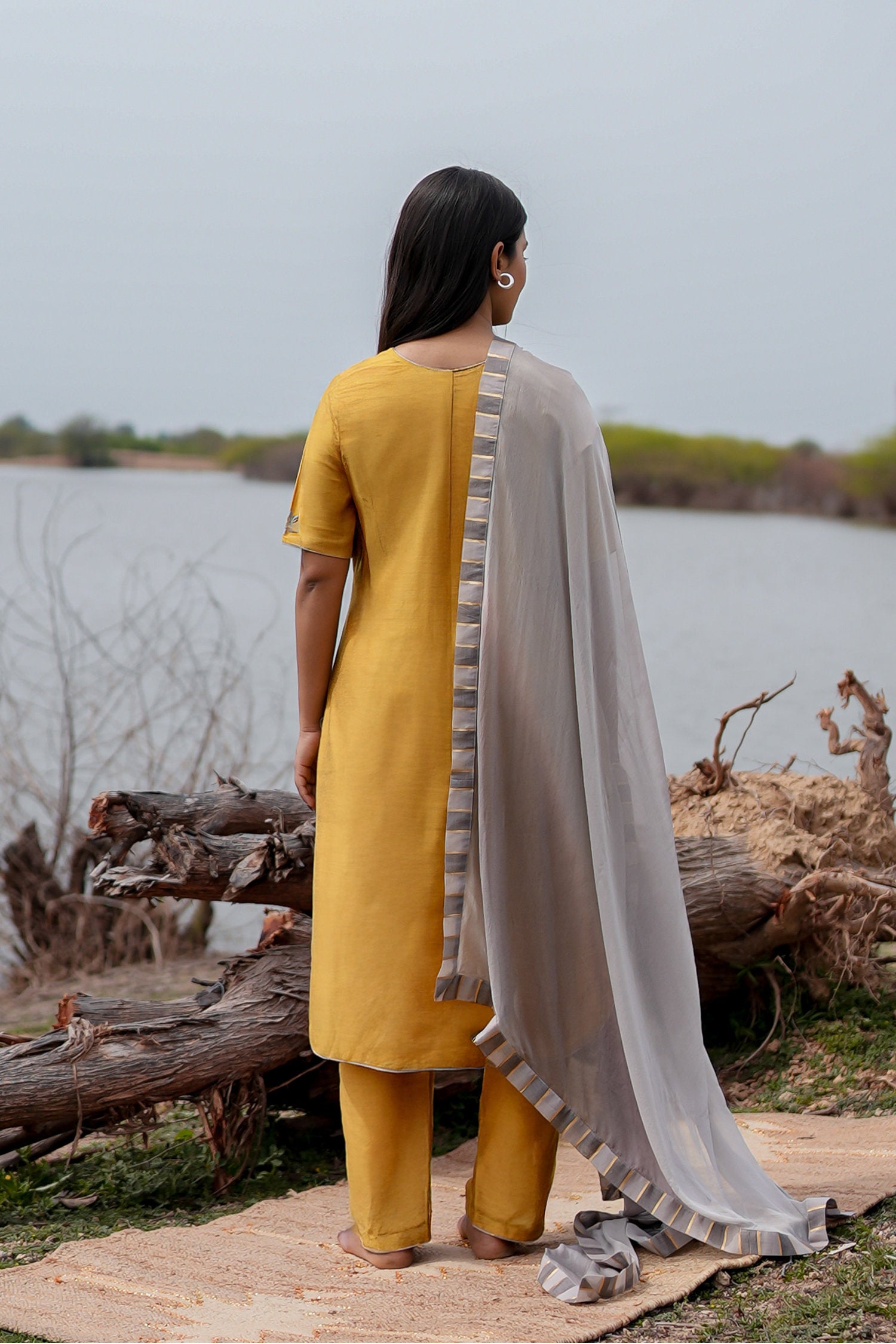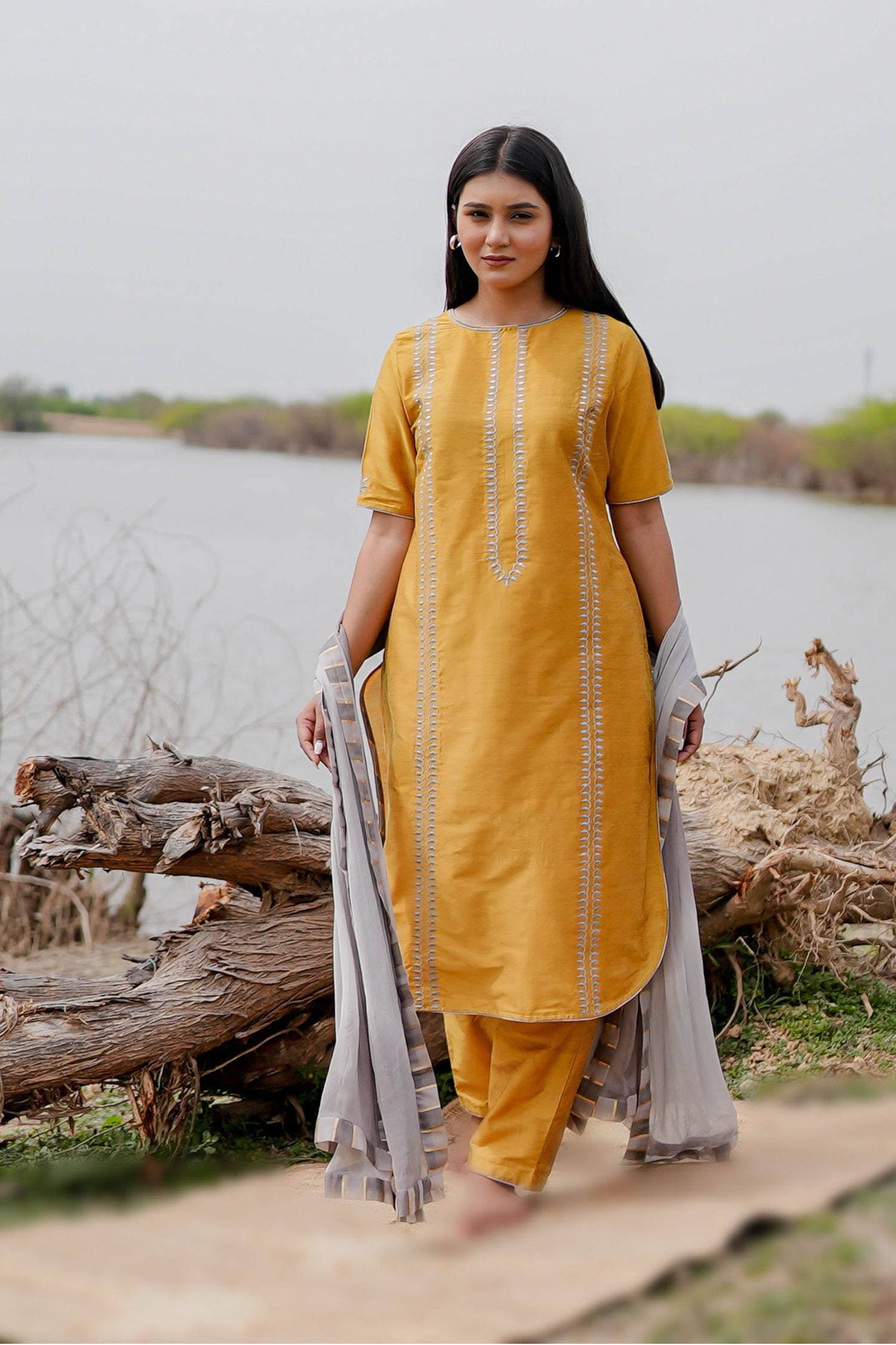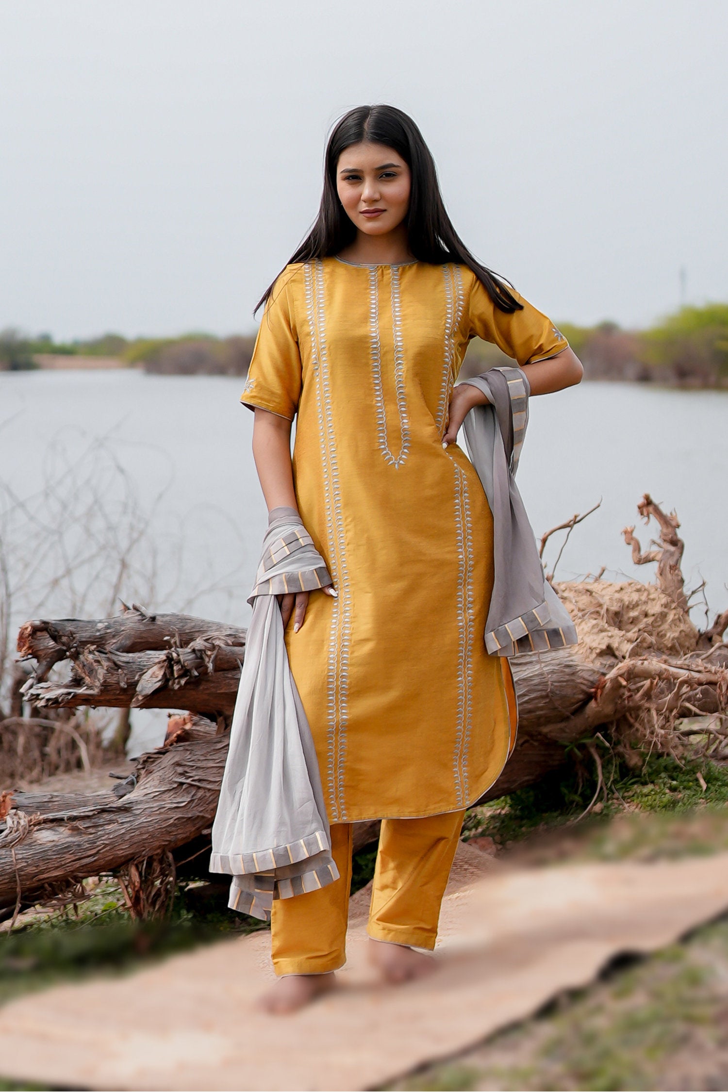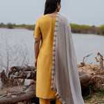 The Mustard and grey cotton kurta set with hand embroidery and chiffon dupatta for a beautiful and stunning look with traditional touch.