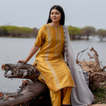 Mustard And Grey Cotton Kurta Set With Hand Embroidery