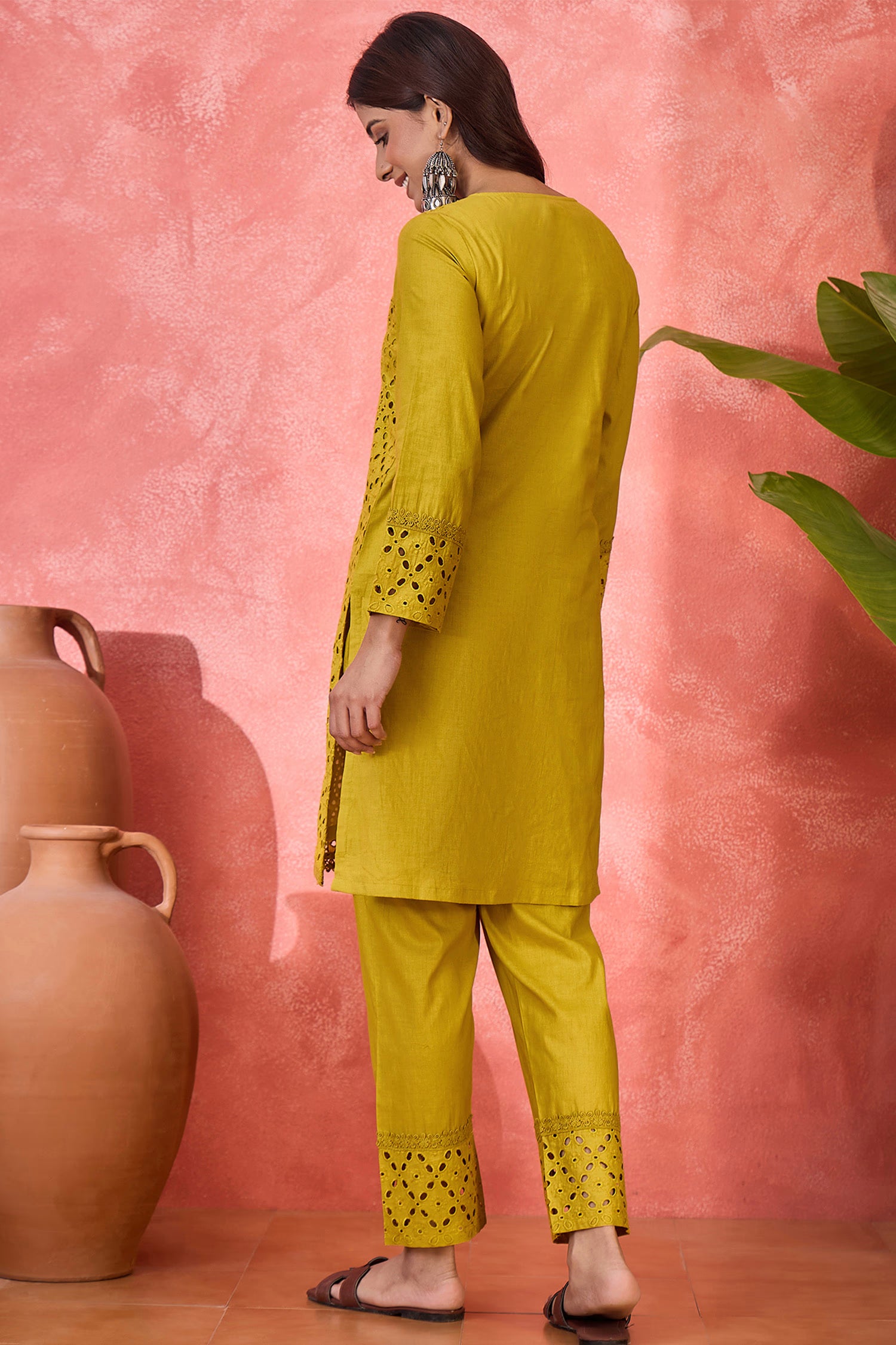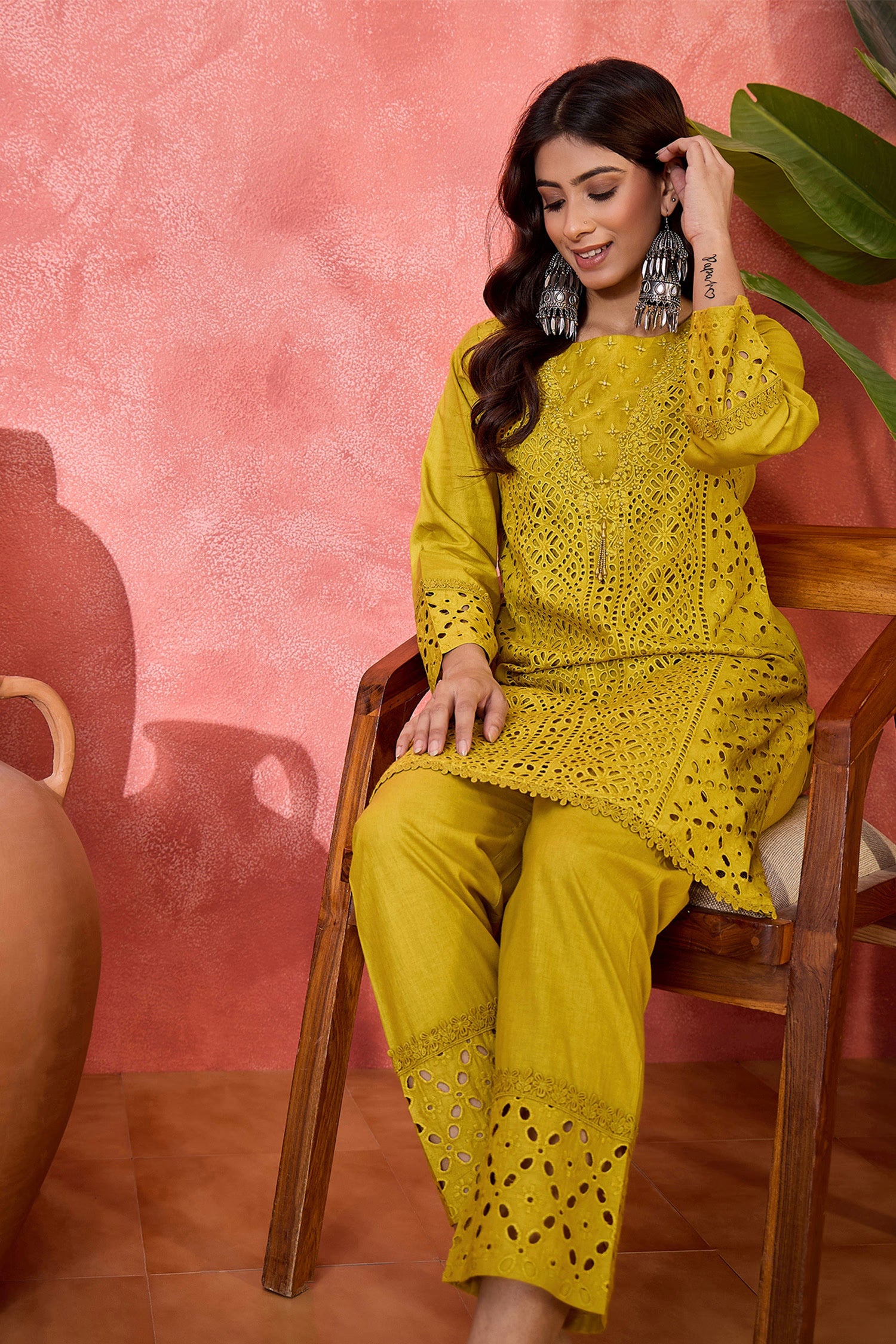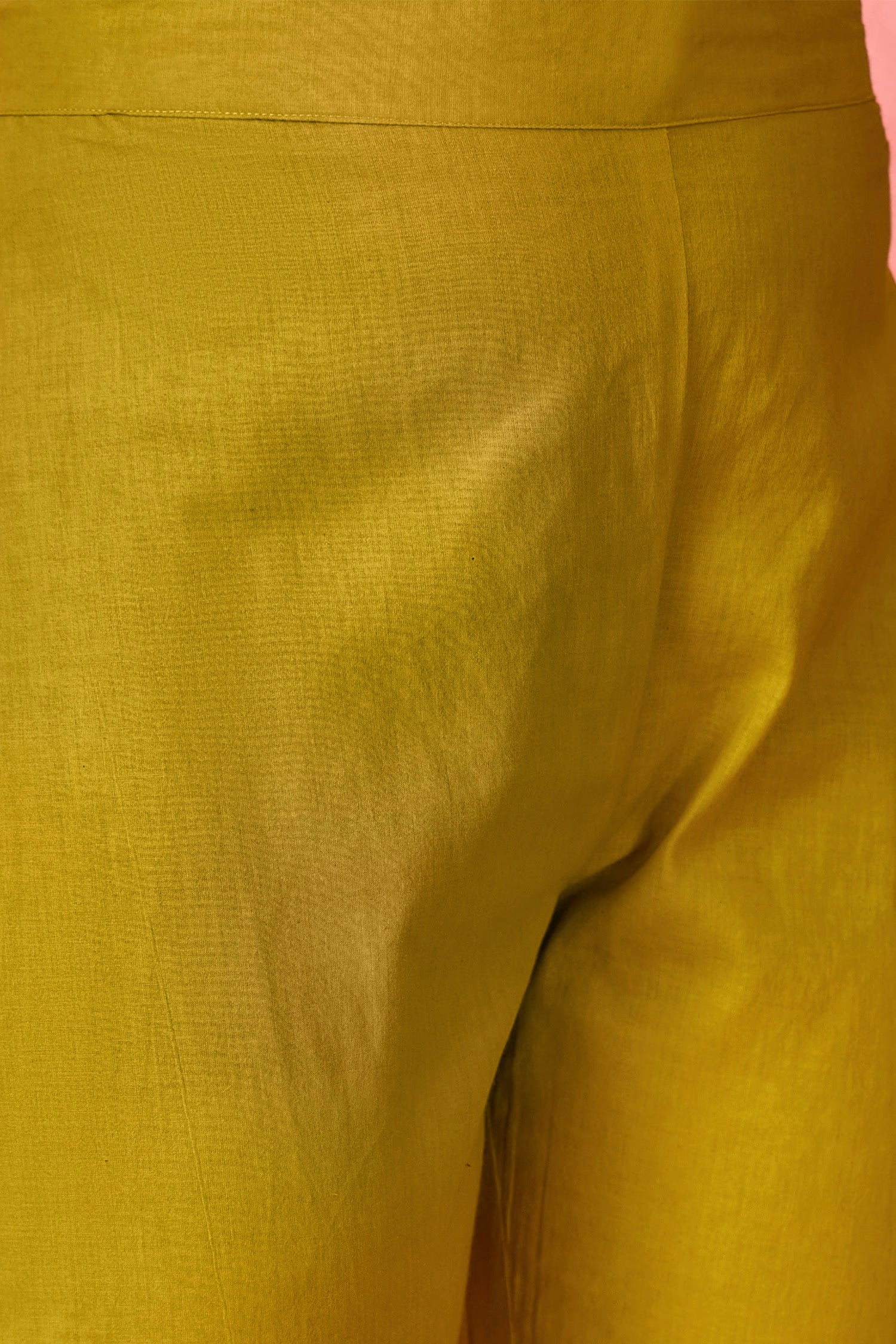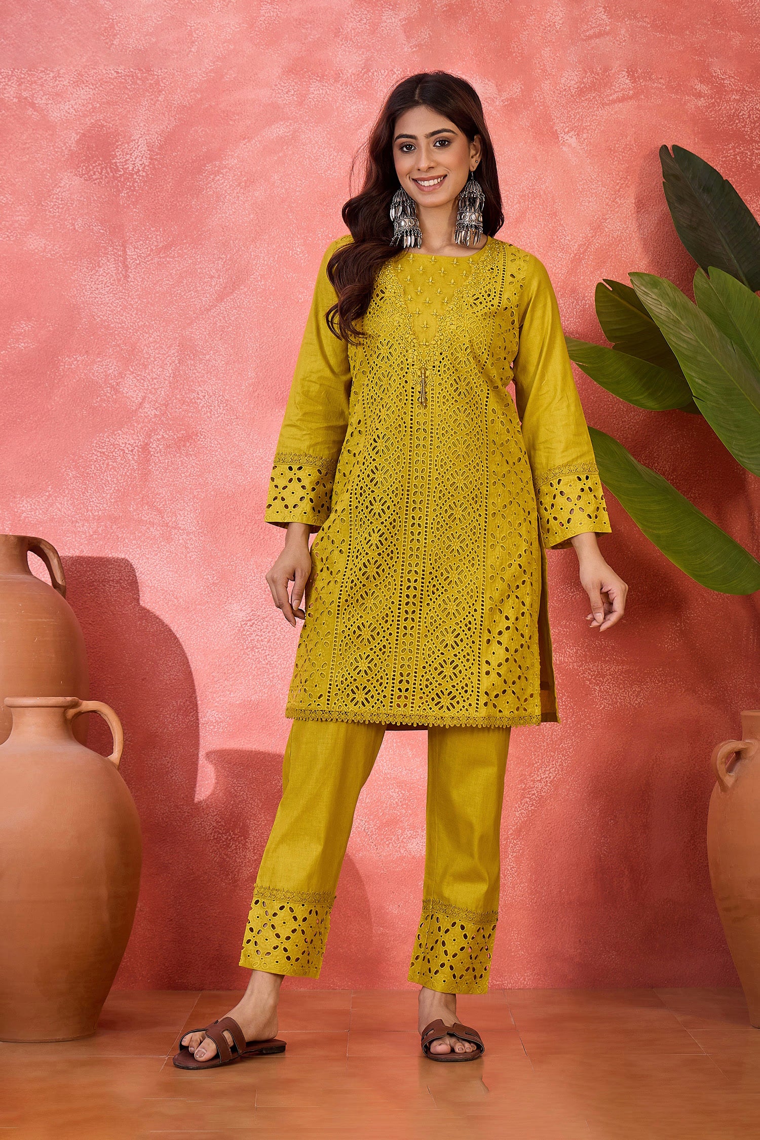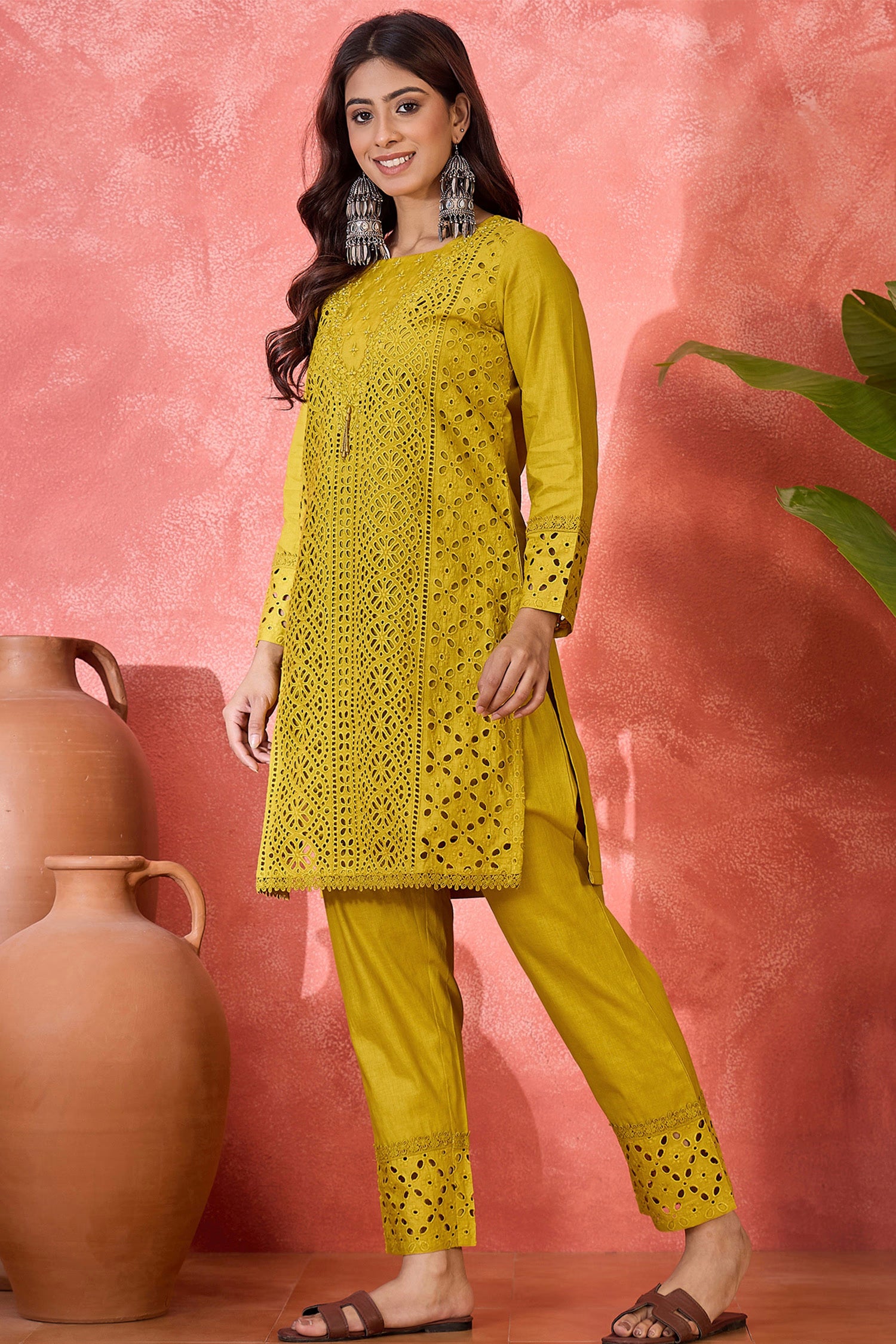 The mustard green cotton hakoba and thread work short kurta with floral design and matching pant that blends ethnic look with the modern fashion.