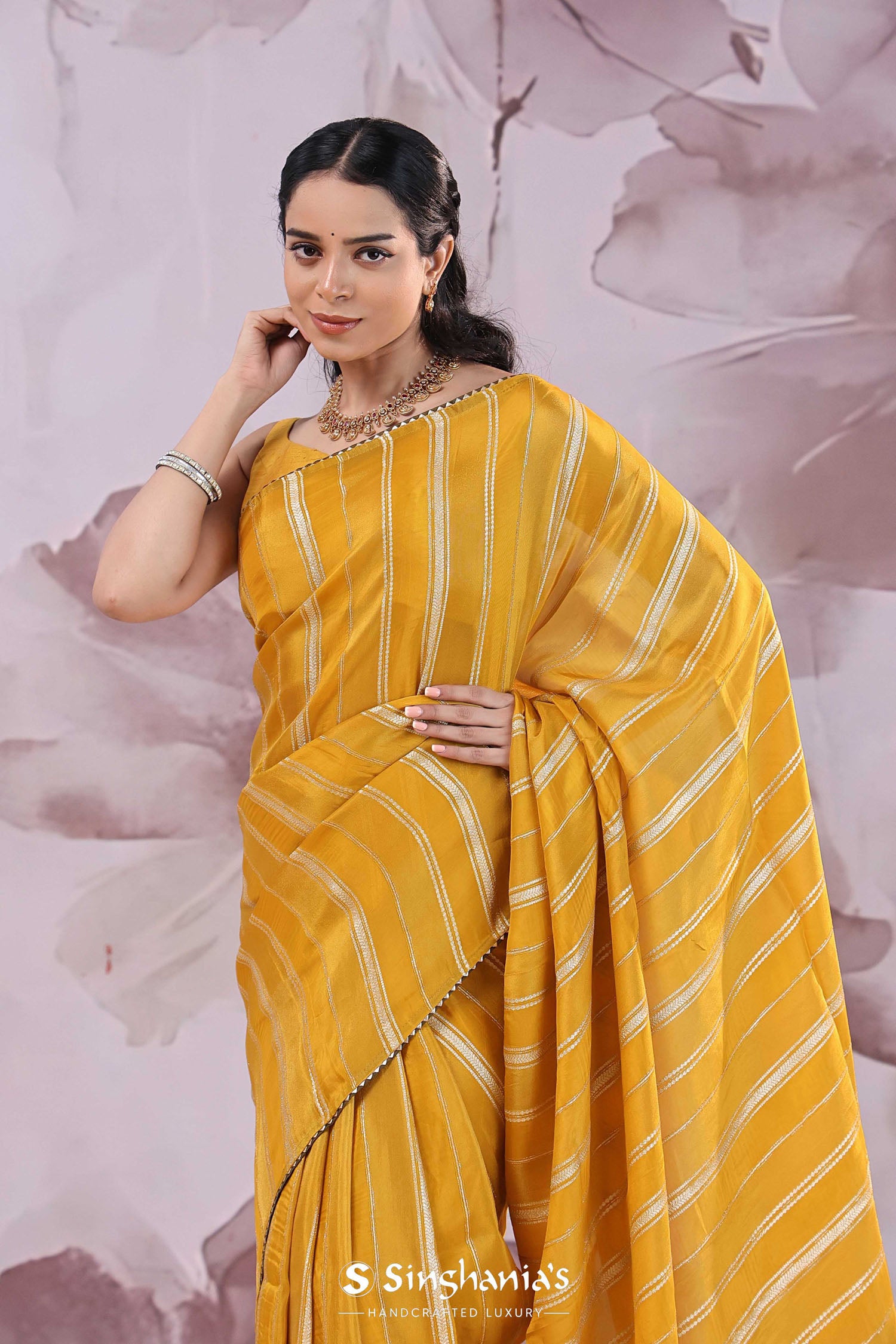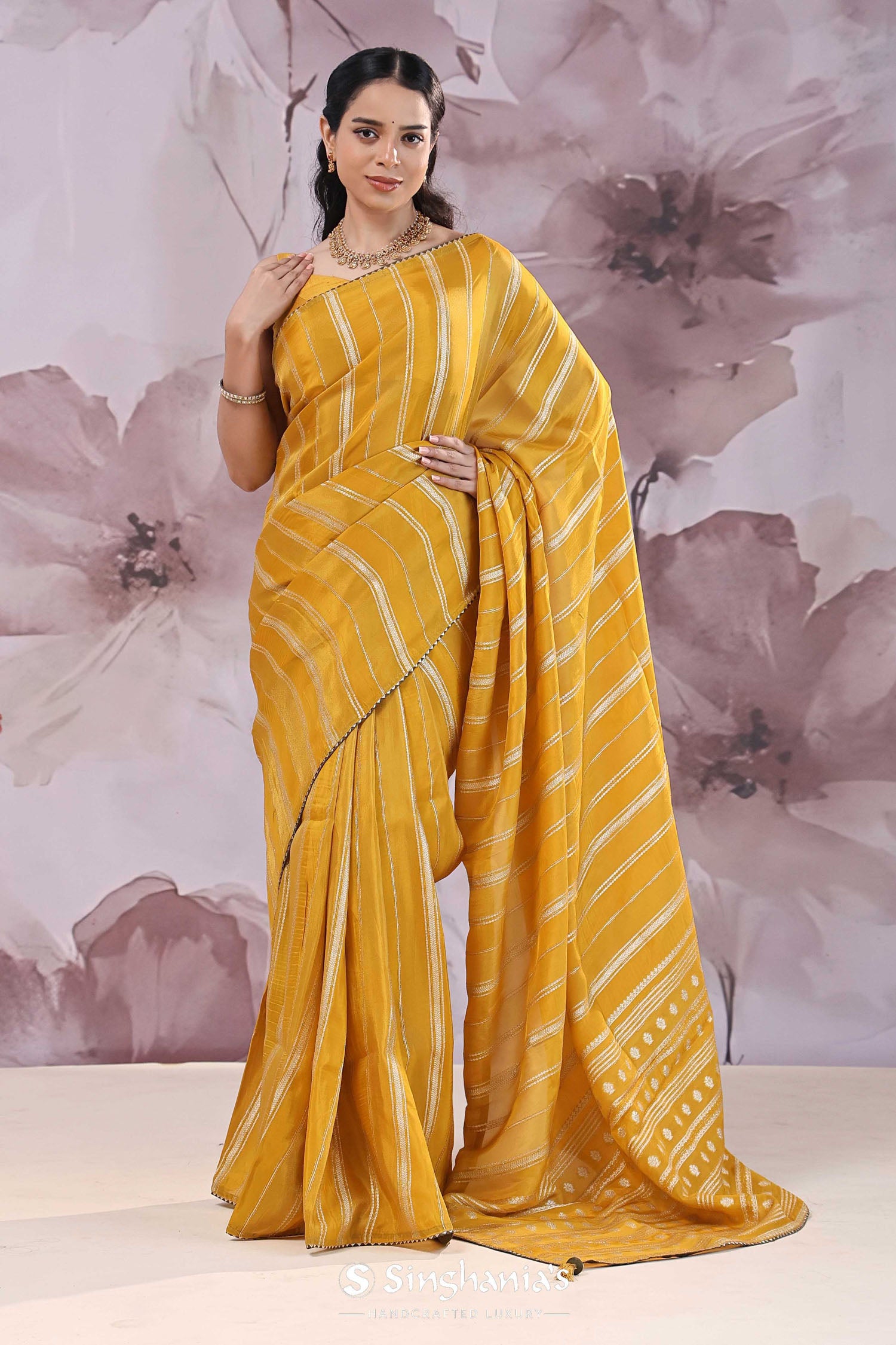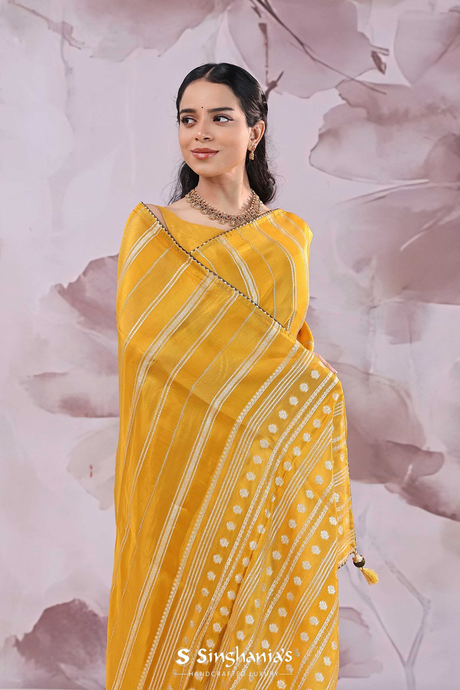 The gold zari stripes woven vertically on entire mustard yellow banarasi saree makes it look magnificent for your favourite occasions