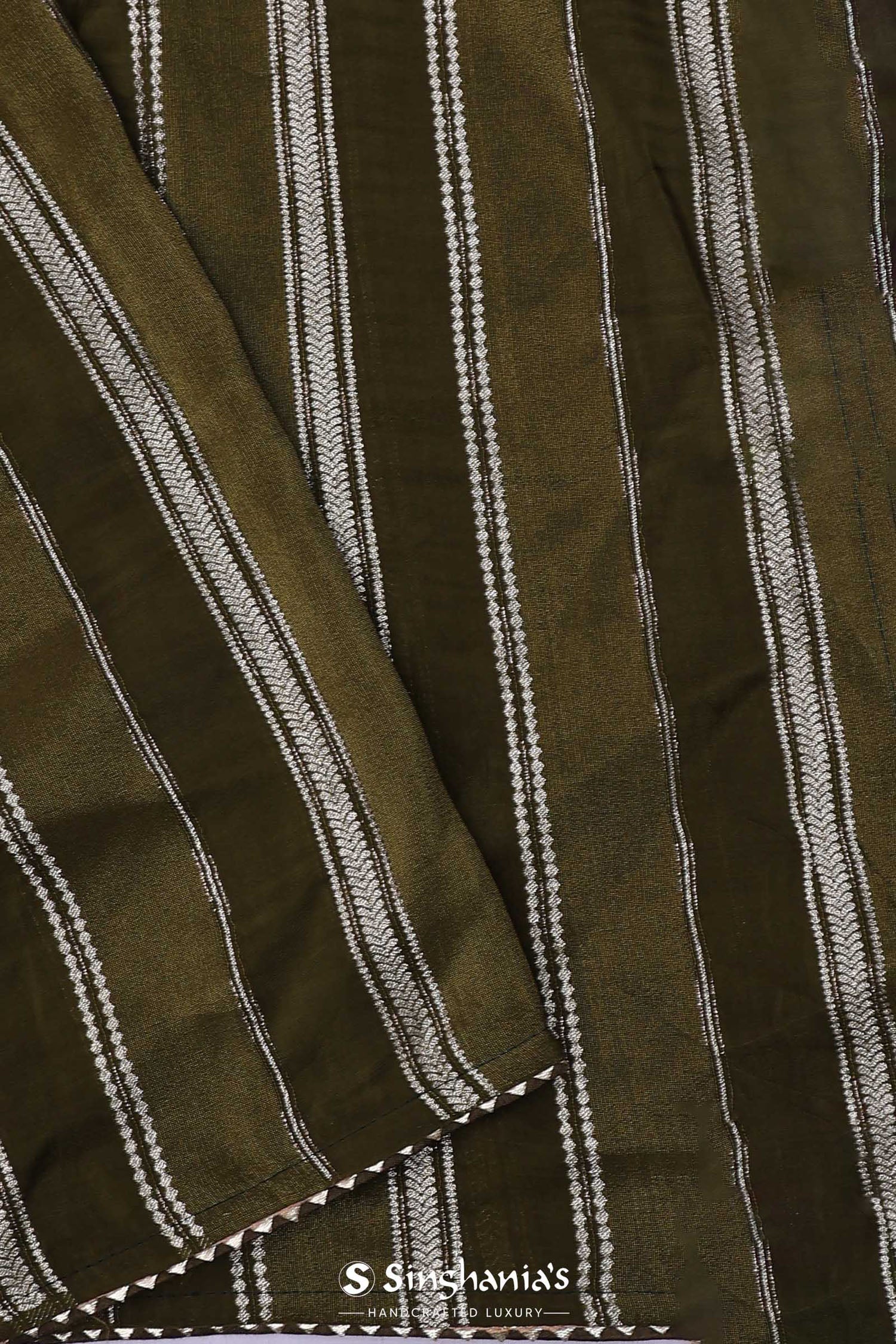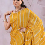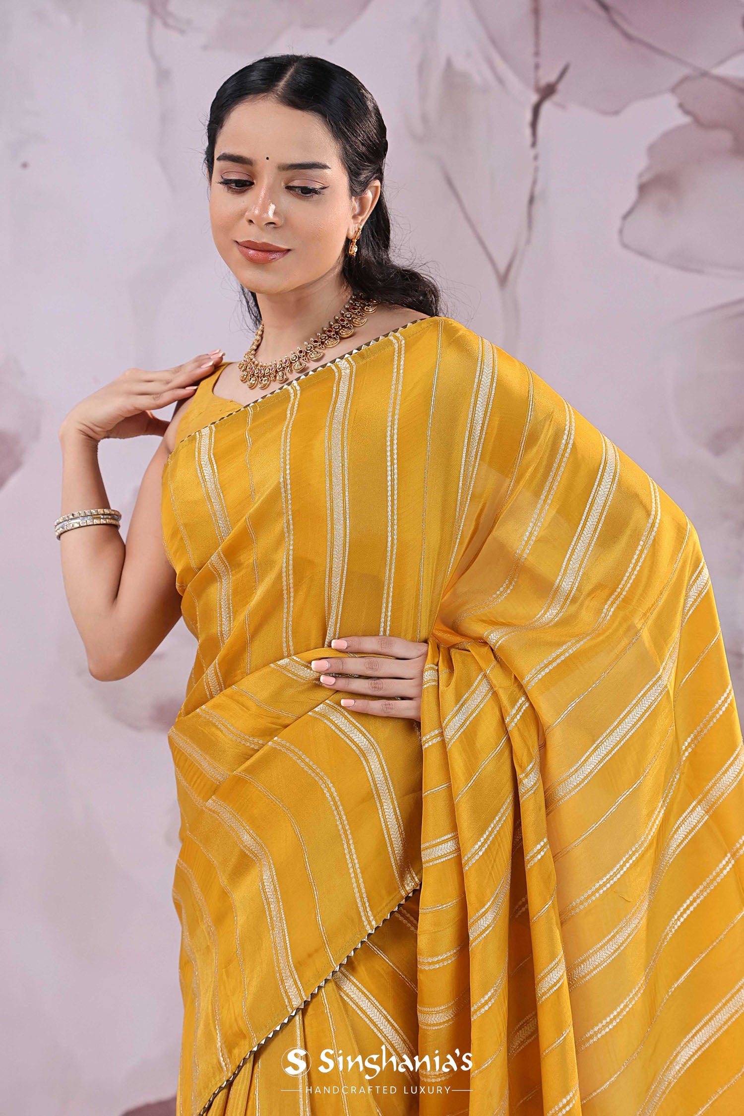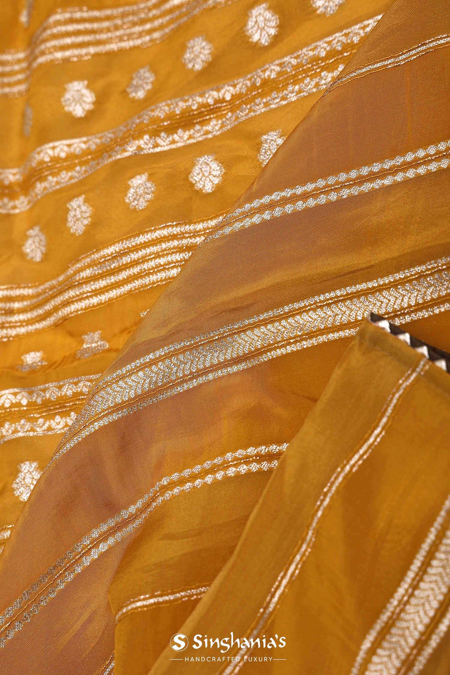 The gold zari stripes woven vertically on entire mustard yellow banarasi saree makes it look magnificent for your favourite occasions