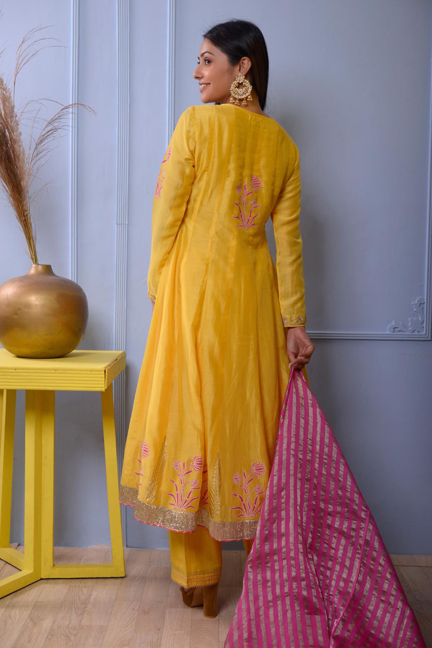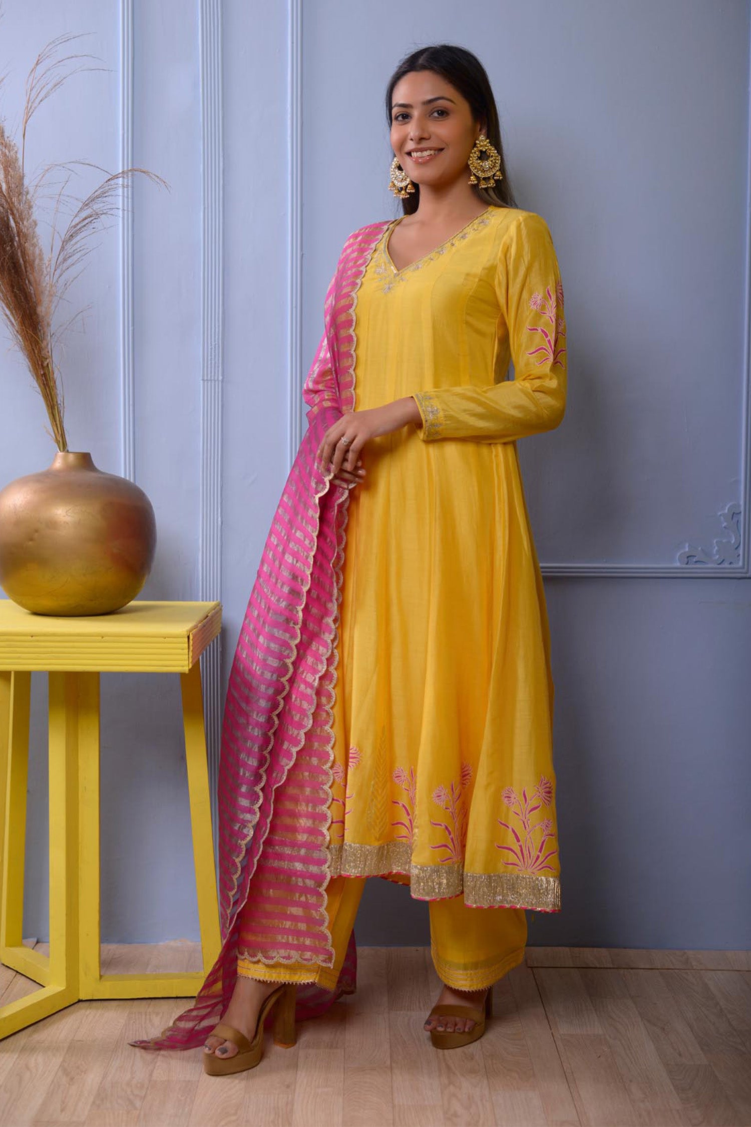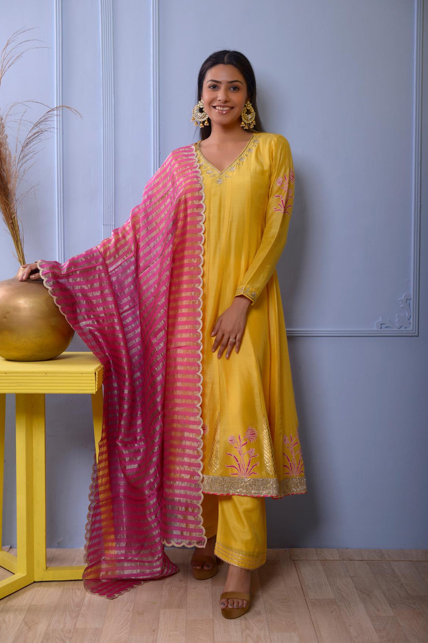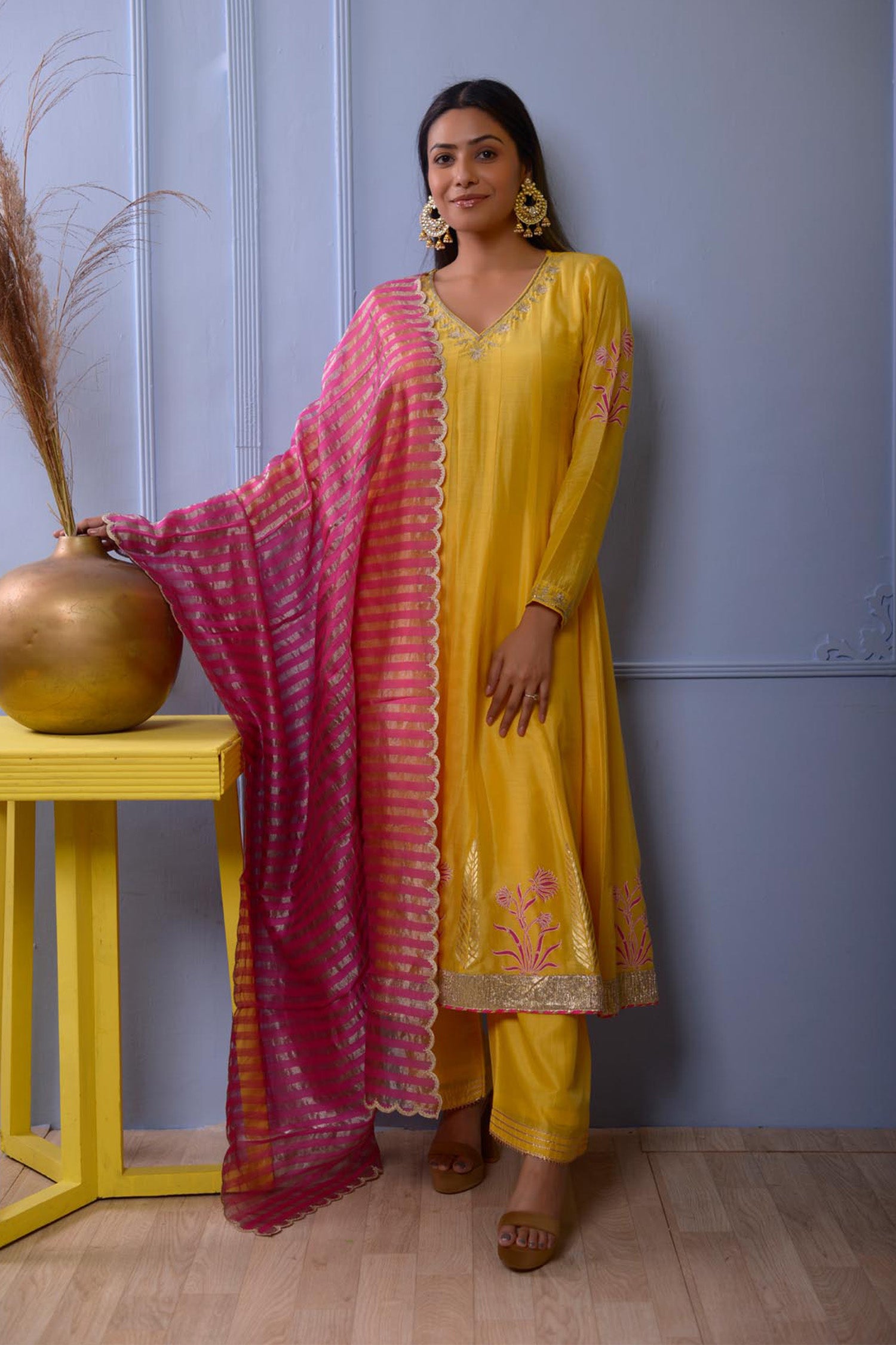 The Anarkali set includes Subtle Floral Foil Print Cotton Silk Kurta With Hand Embroidered Neck , Pant and Banarasi Strip Dupatta for a delicate traditional look with elegance